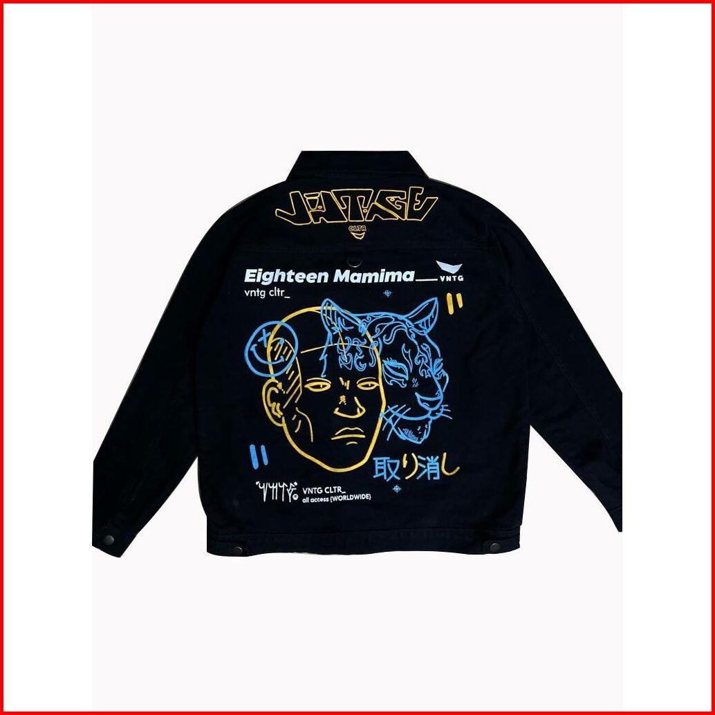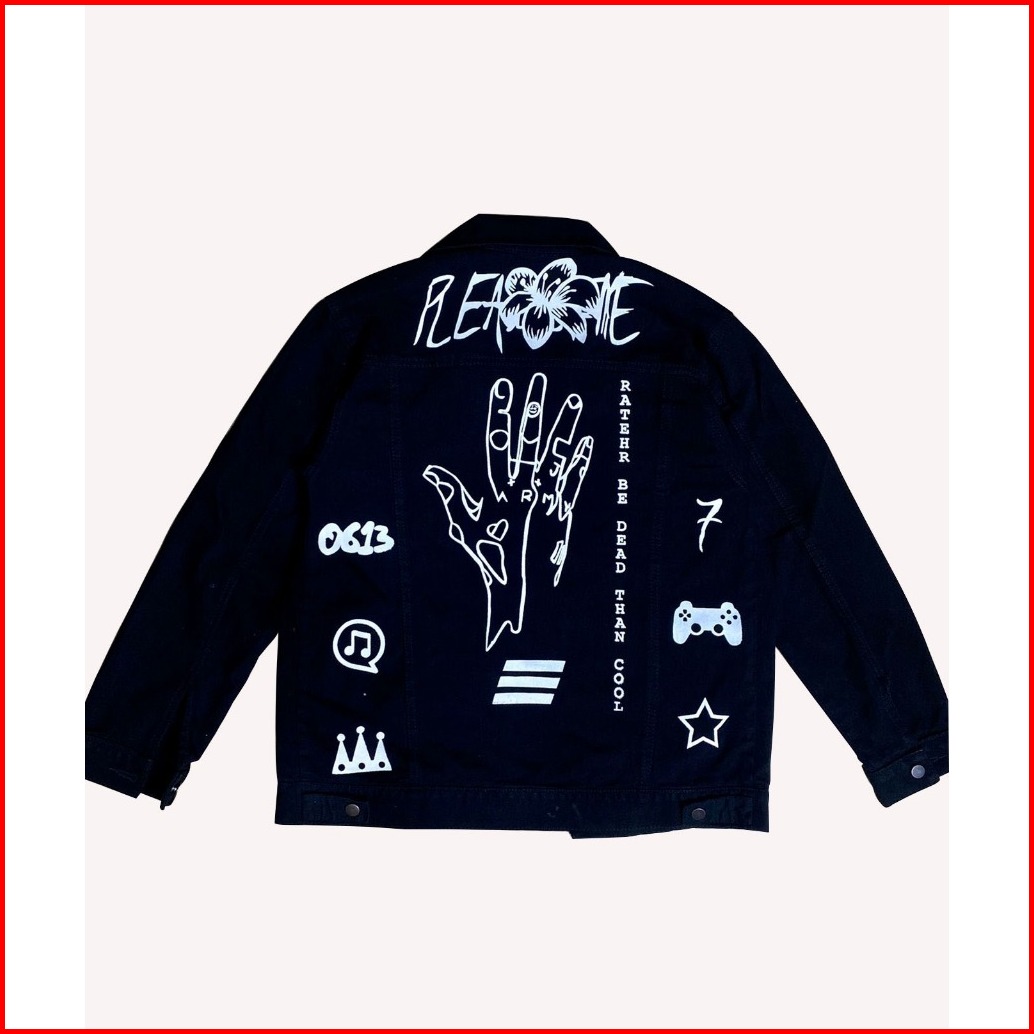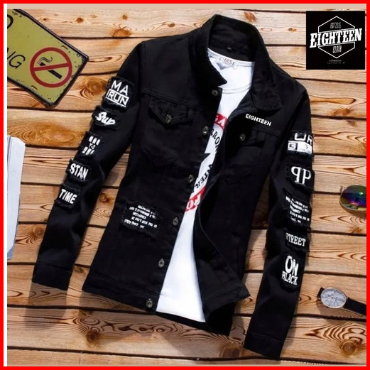Jacket Jeans Casual Pria Model Baru Swag Hitam Pekat Sobek Kekinian Eblem Bordiran Printing