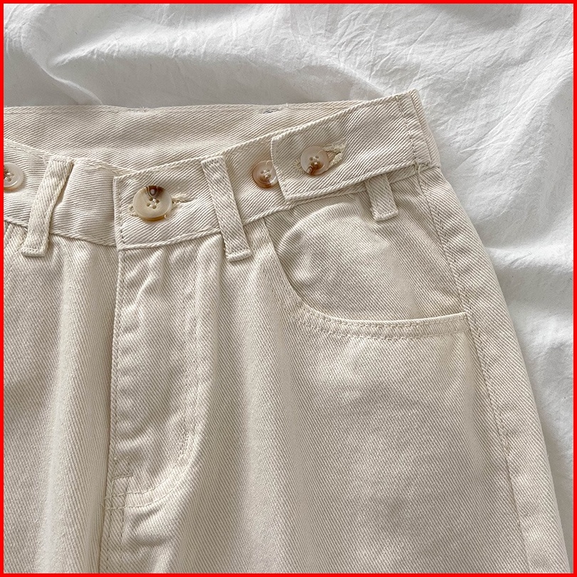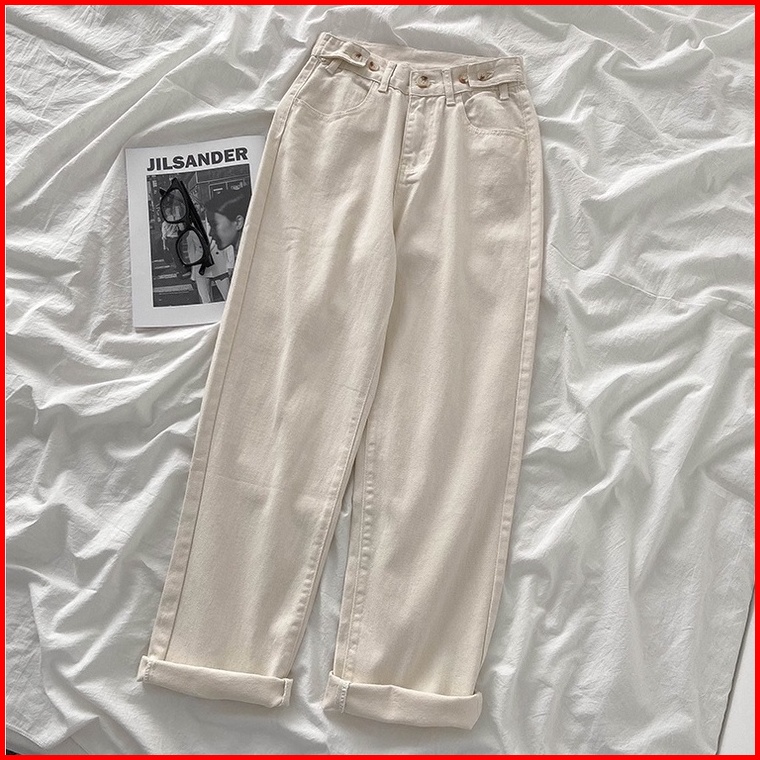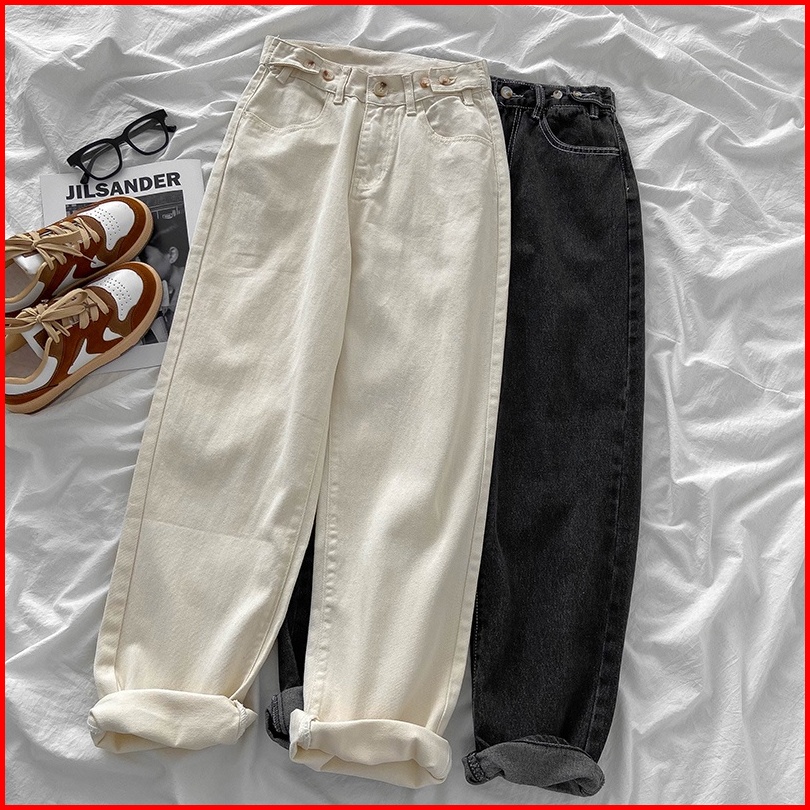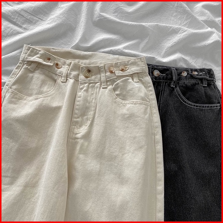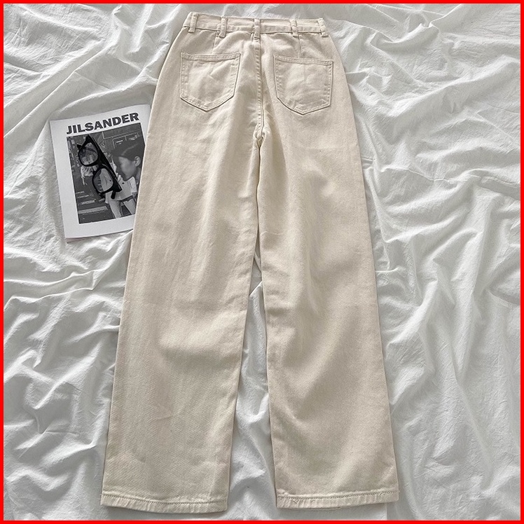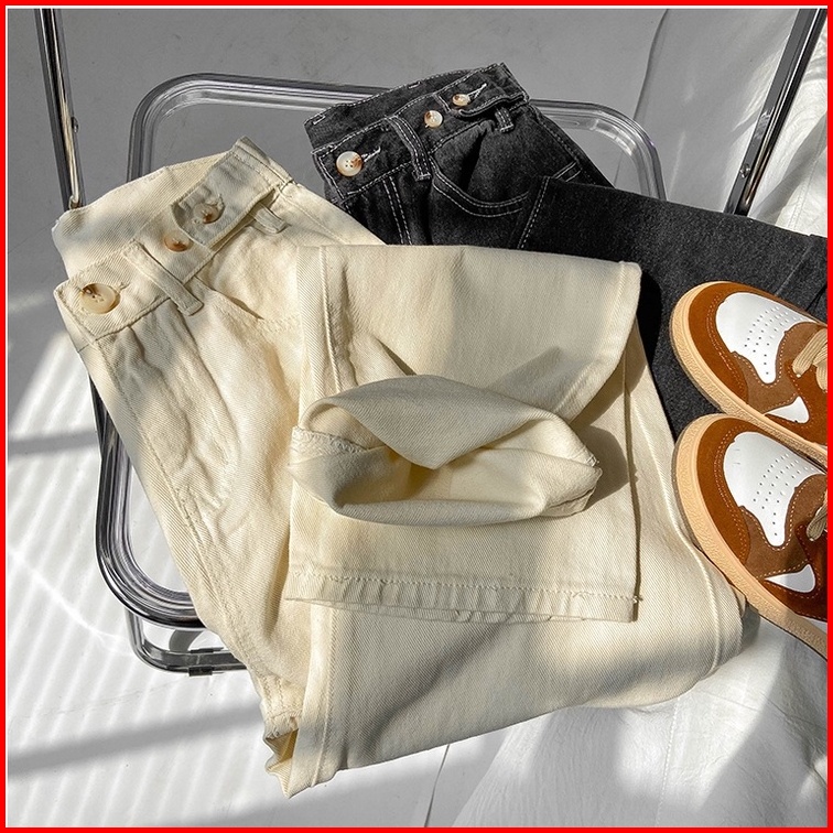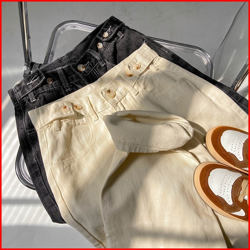 Krem Hitam Celana Panjang Model Longgar Lebar Gaya Korea Retro Bahan Jeans Untuk Wanita