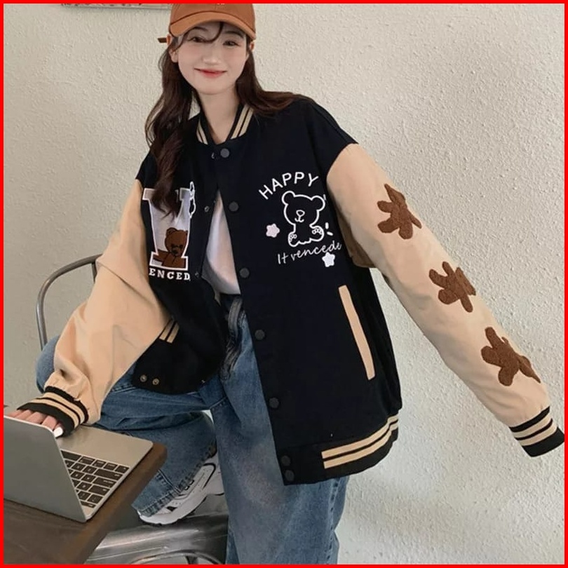 V Happy Jaket Baseball Oversize Wanita Korean Style - Outerwear Jaket Wanita Varsity