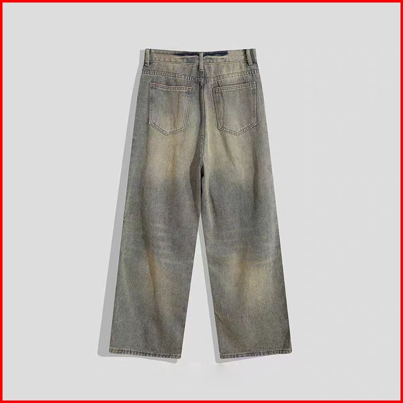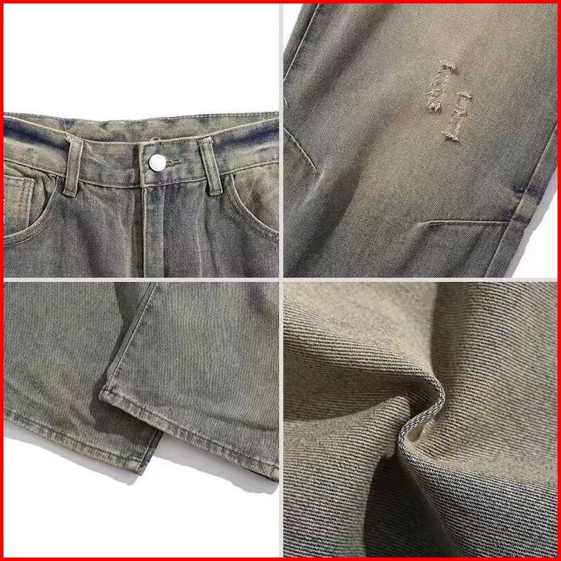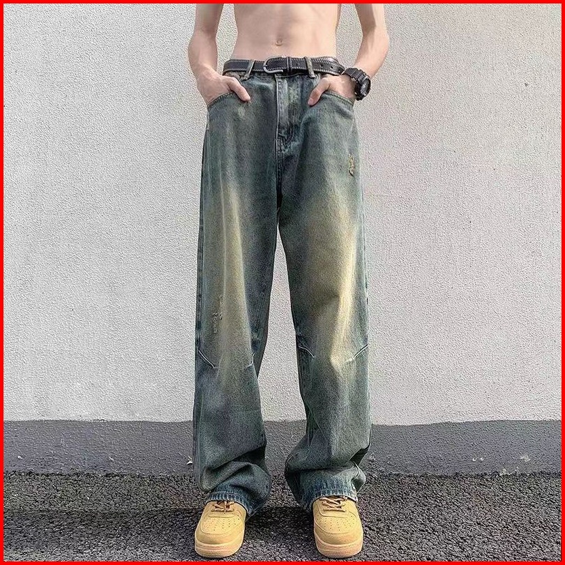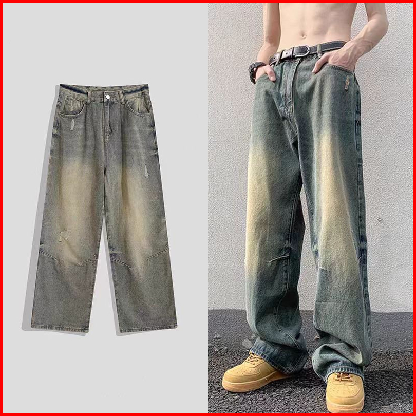 Celana Jeans Pria Sobek Retro Straight Baggy Pants Panjang Dewasa Laki Laki Denim Celana Kulot Casual Korean Style