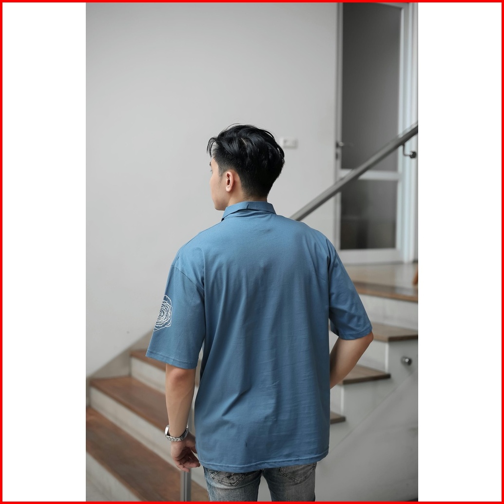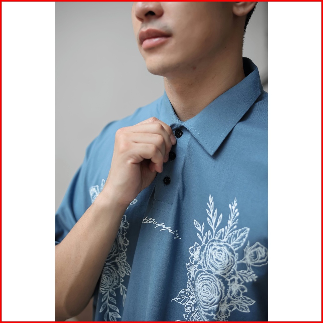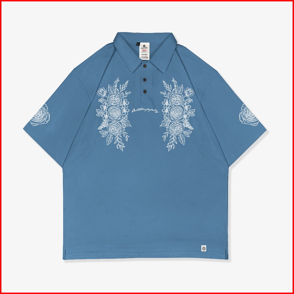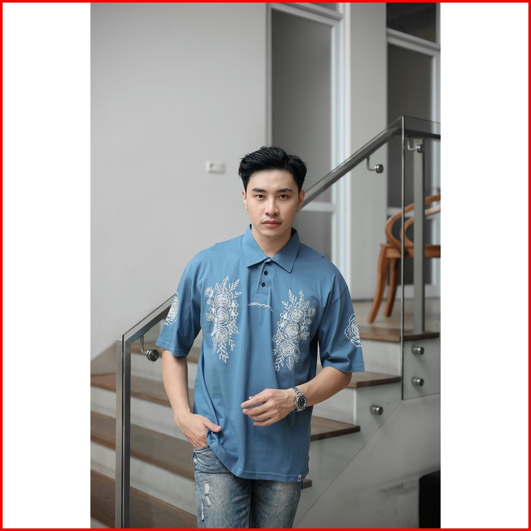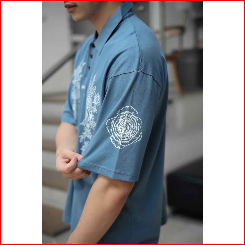 Ootdsupply Oversize Polo Shirt Tender Flora Steel Blue Black L Kaos Polo Pria Dan Wanita Ovz-ps006