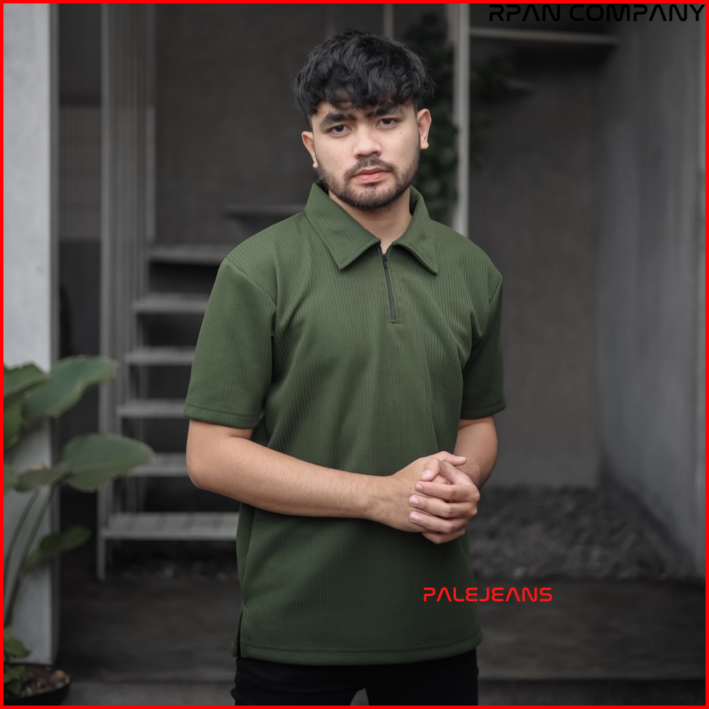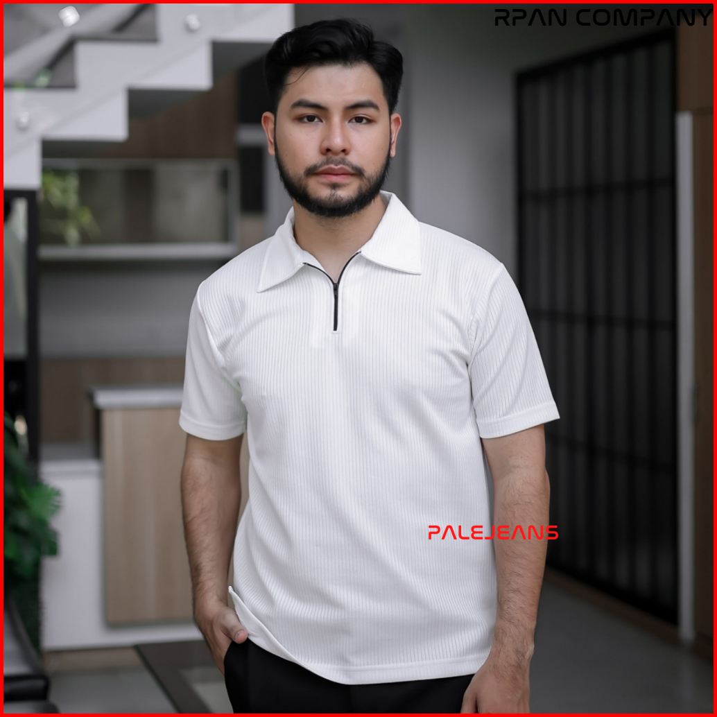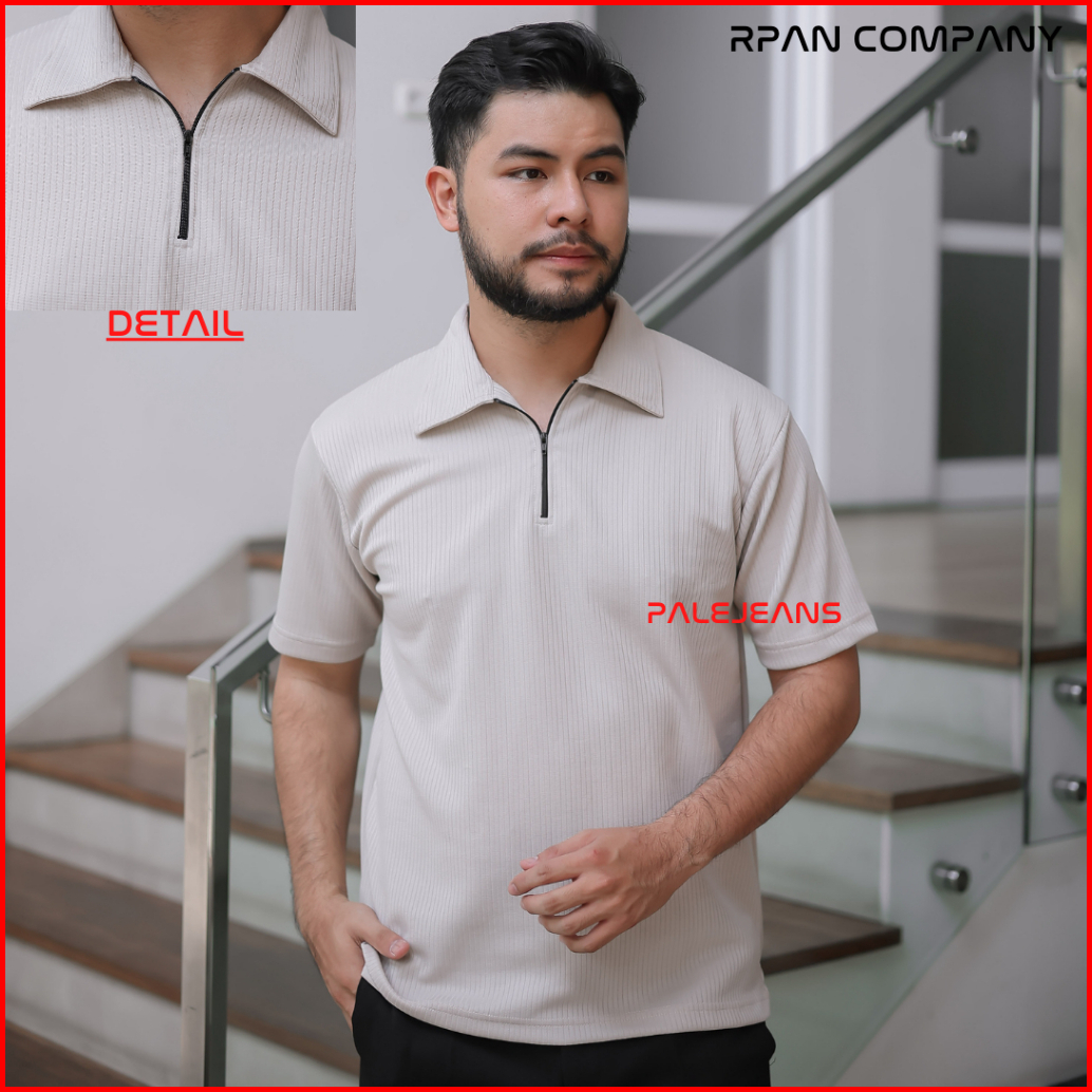 Polo Shirt Knit Motif Salur Kecil Zipper Half Zipp Pria Baju Korean Knit Kerah Resleting Garis Kecil Cutting Slim Fit Ta