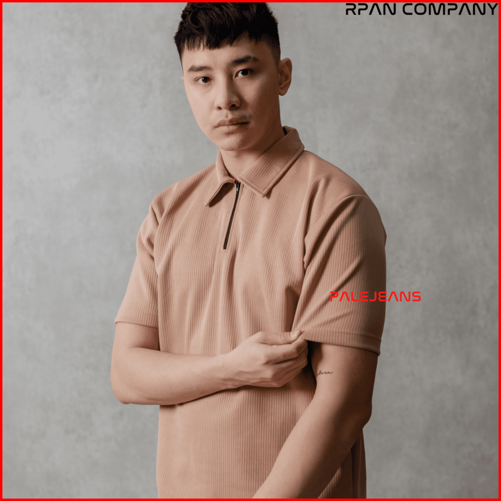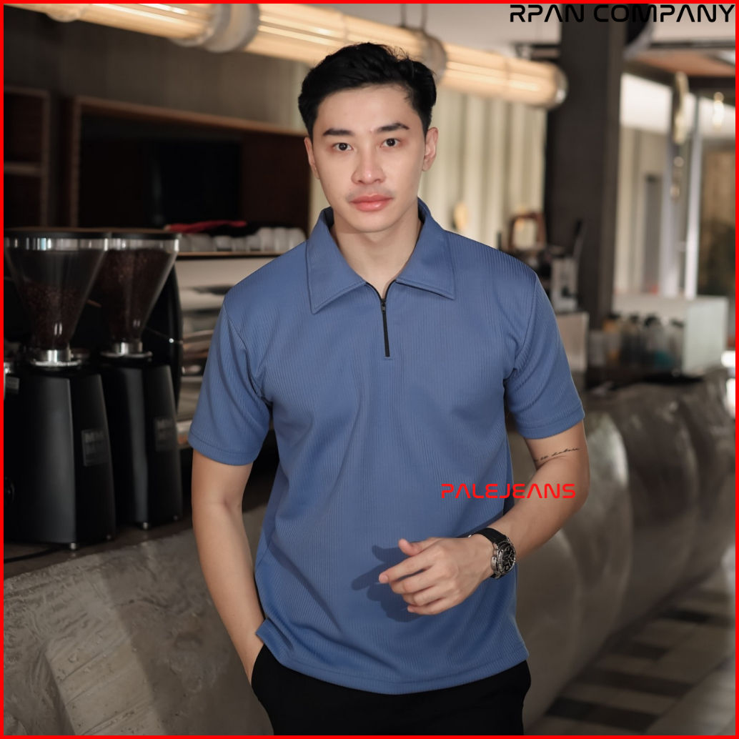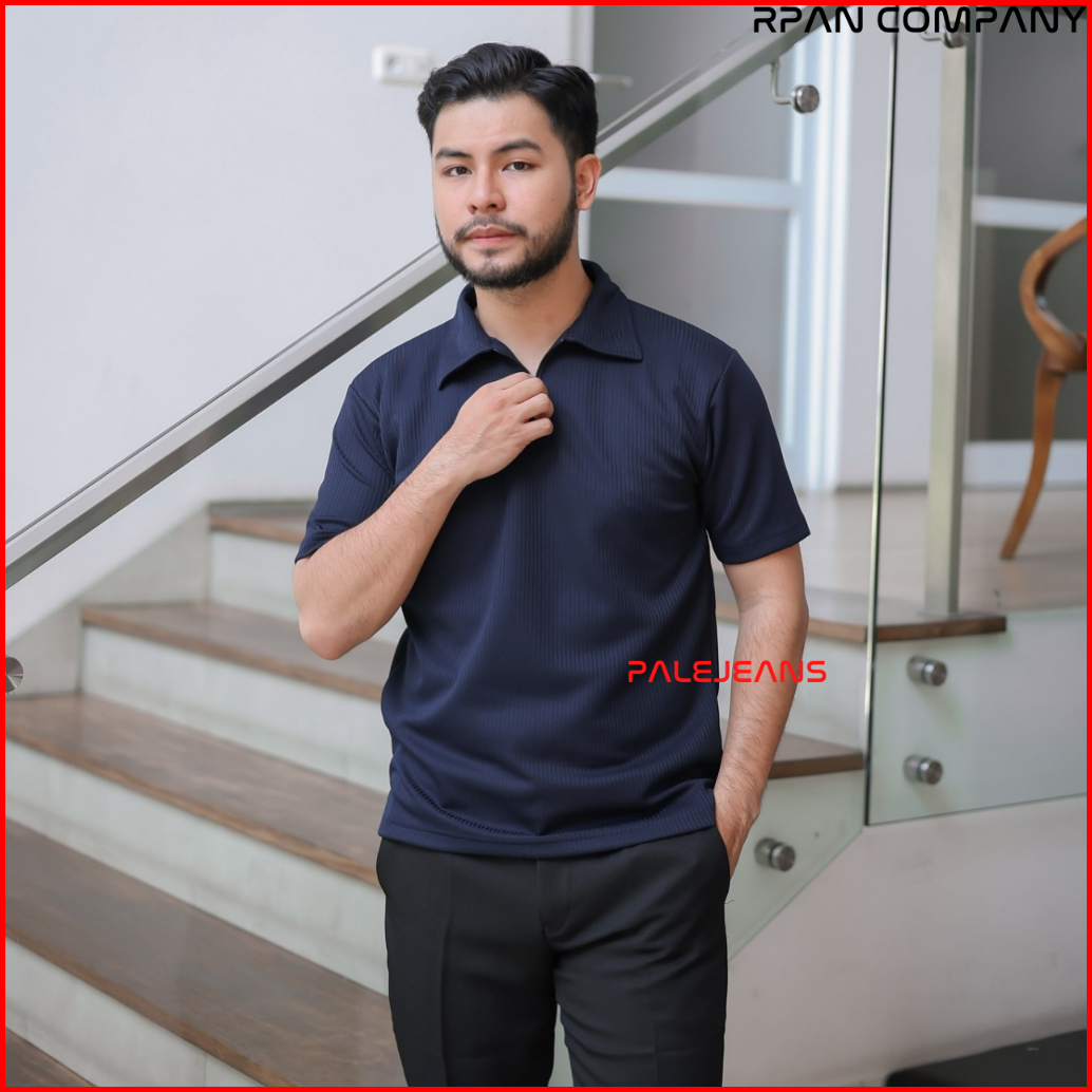 Polo Shirt Knit Motif Salur Kecil Zipper Half Zipp Pria Baju Korean Knit Kerah Resleting Garis Kecil Cutting Slim Fit Ta