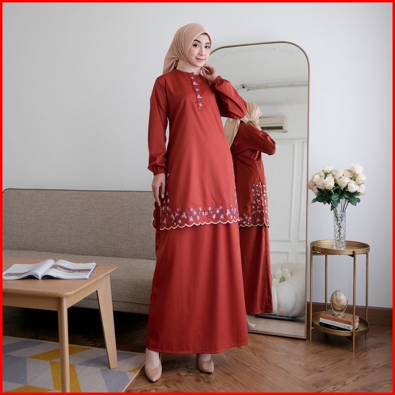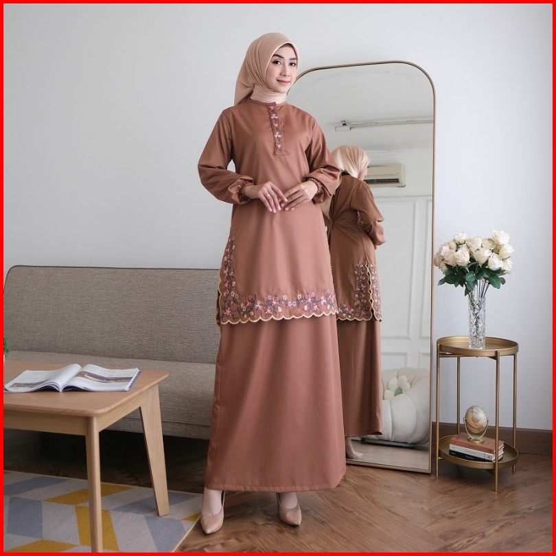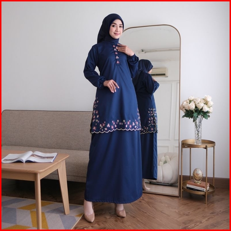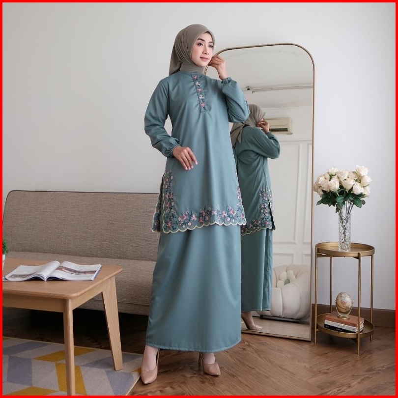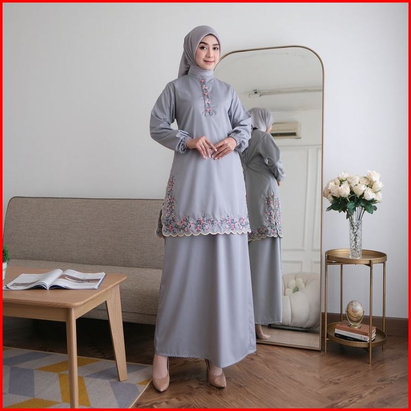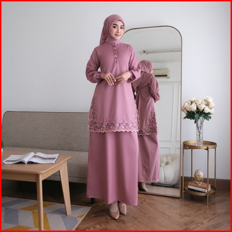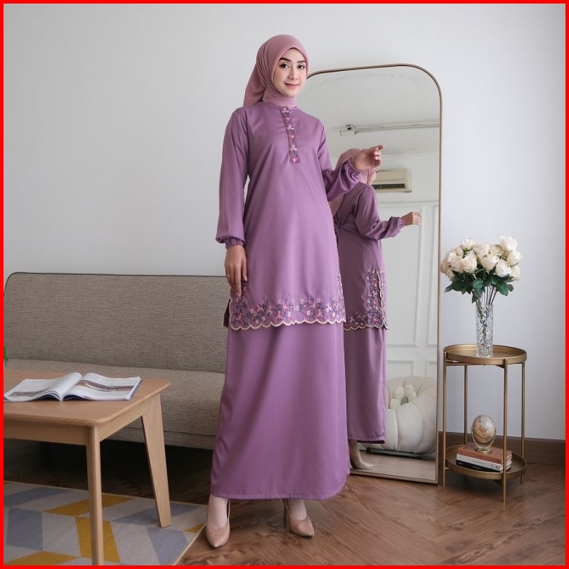 Elvrist - One Set Dhanya Kurung Melayu Katun Toyobo Bordir Kembang Bunga Mawar Strimin Stelan