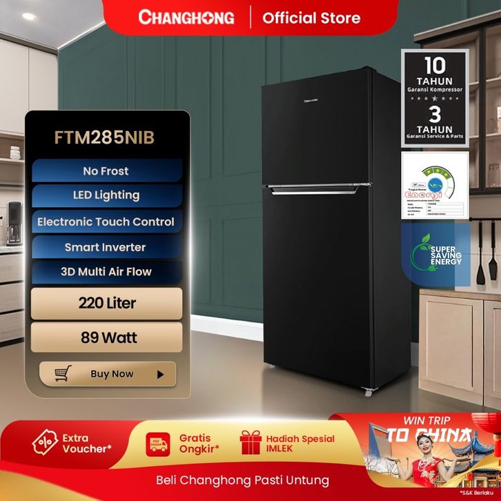 Changhong Kulkas 2 Pintu (Refrigerator) kulkas Inverter No Frost tanpa Bunga Es Lemari Es Kapasitas 220 Liter FTM285NIB