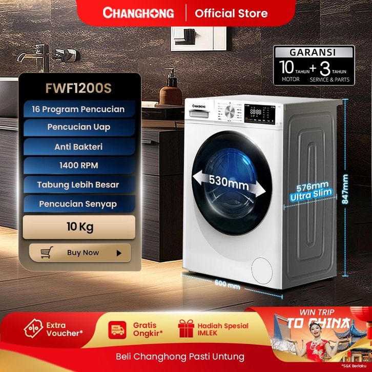 Changhong Mesin Cuci Smart Front Loading Kapasitas 10 kg Model FWF1200S - Bukaan Depan Rasakan Tabung Ekstra Besar 530 m