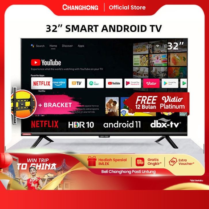 (+BRACKET) Changhong 32 Inch Newest Android 11 Frameless Smart TV Digital LED TV HD (L32G7N)-Netflix-Youtube Garansi Res