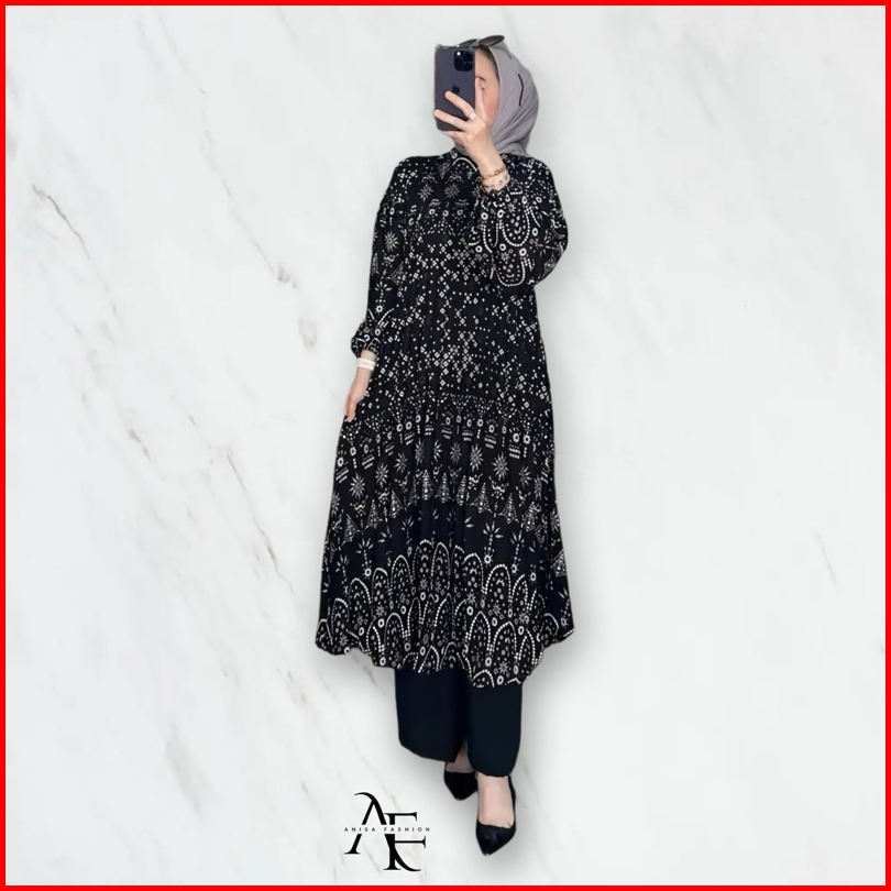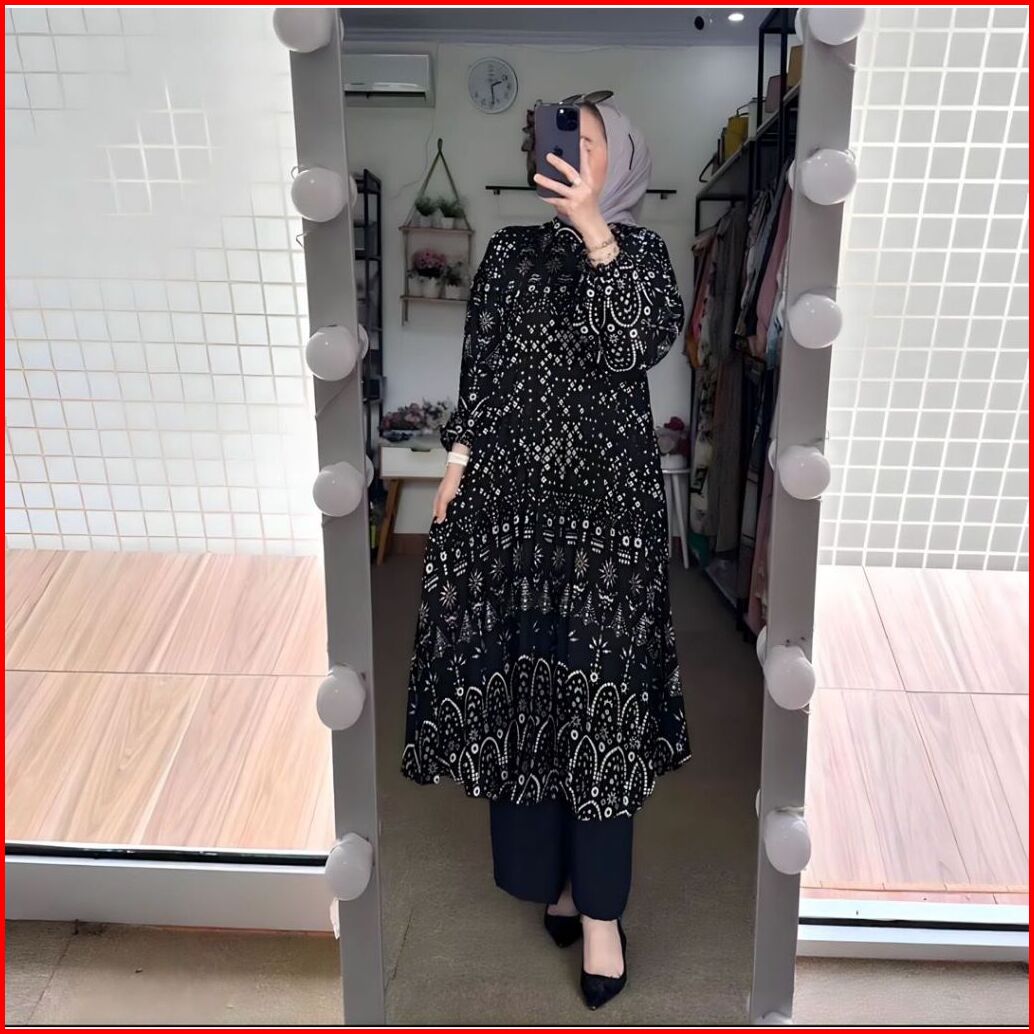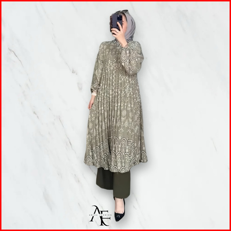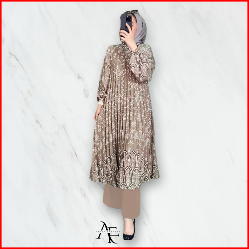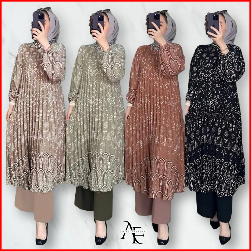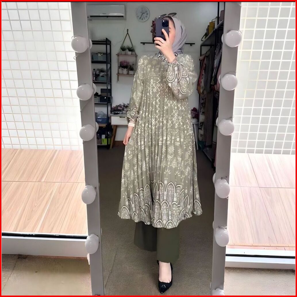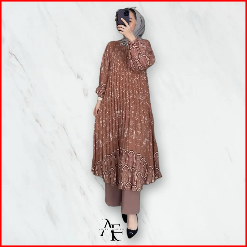 One Set Naila Tunik Plisket - Setelan Long Tunik Plisket Motif New Celana Crinkle Premium - One Set Wanita Terbaru