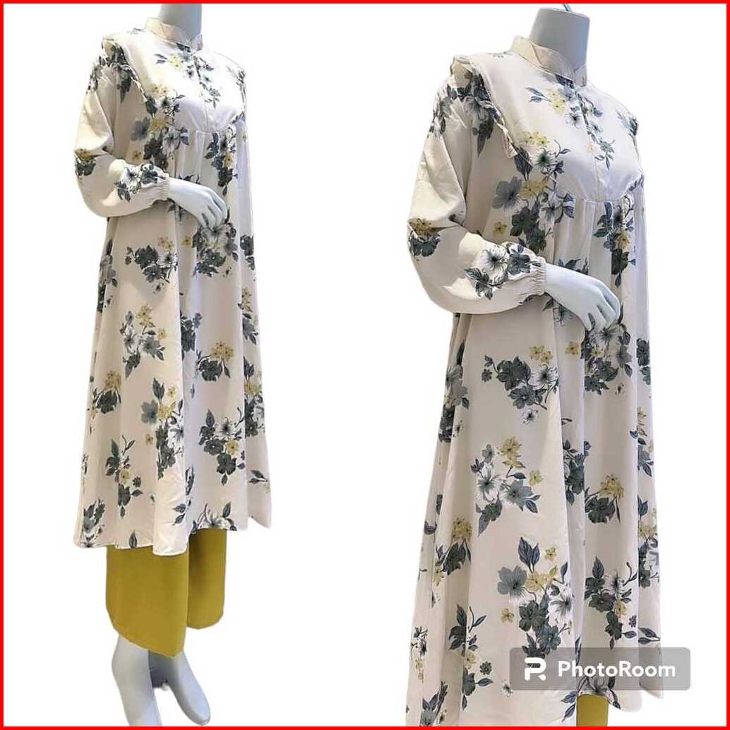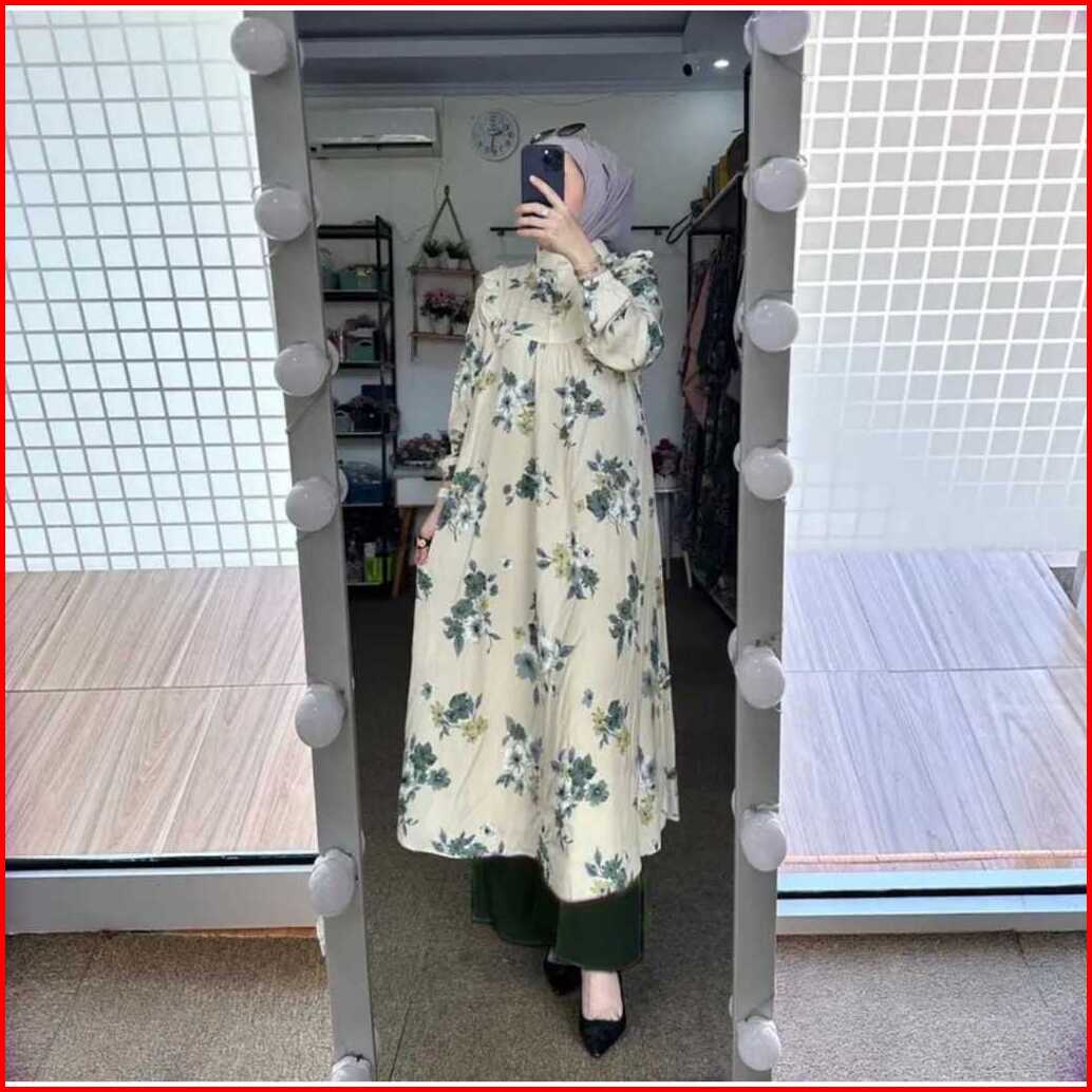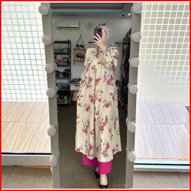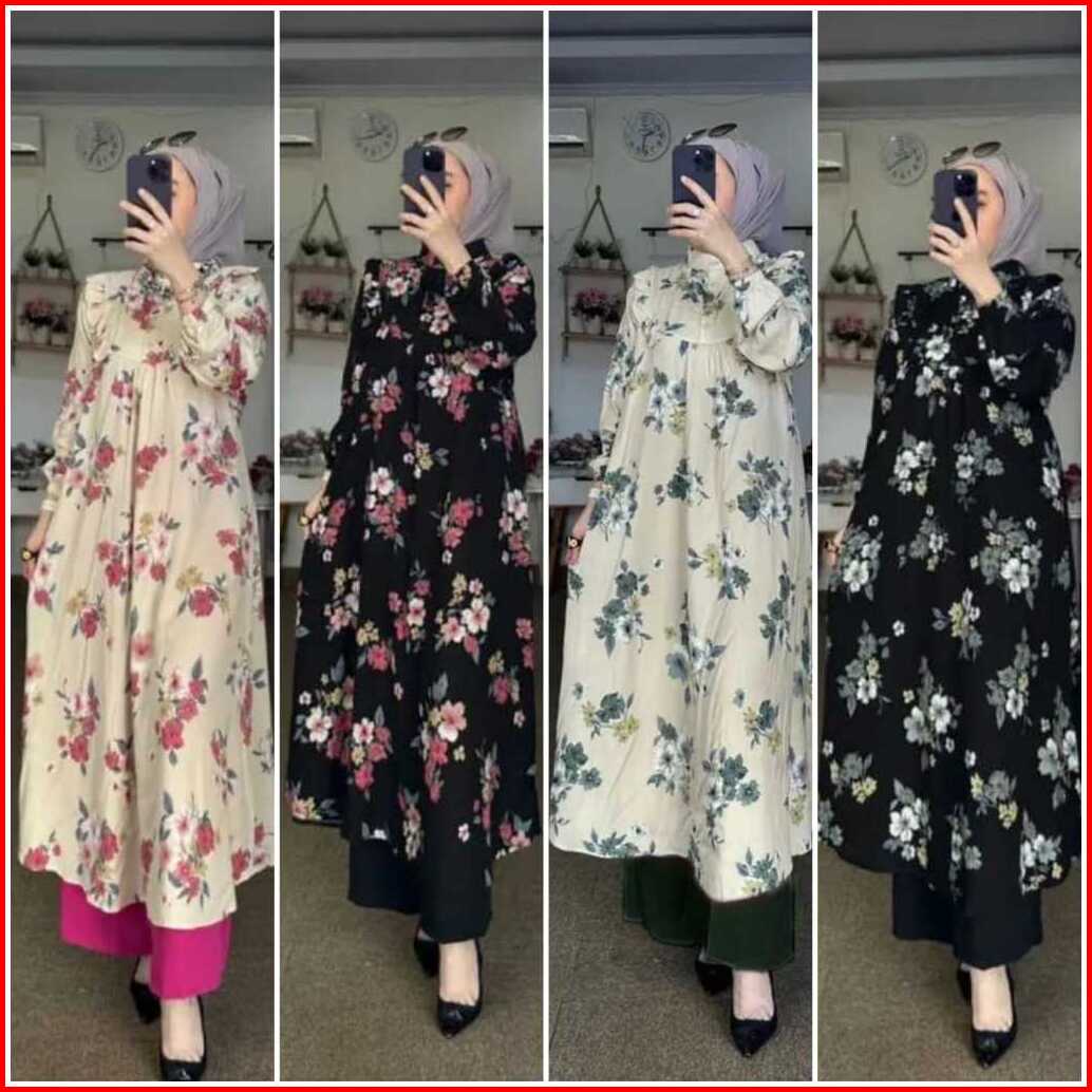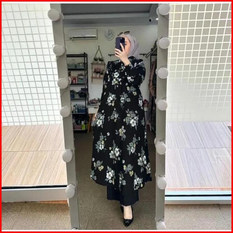 Zahra Set - Setelan Wanita Oneset Tunik Rayon Premium Motif Bunga Mix Crinkle Terbaru Kekinian