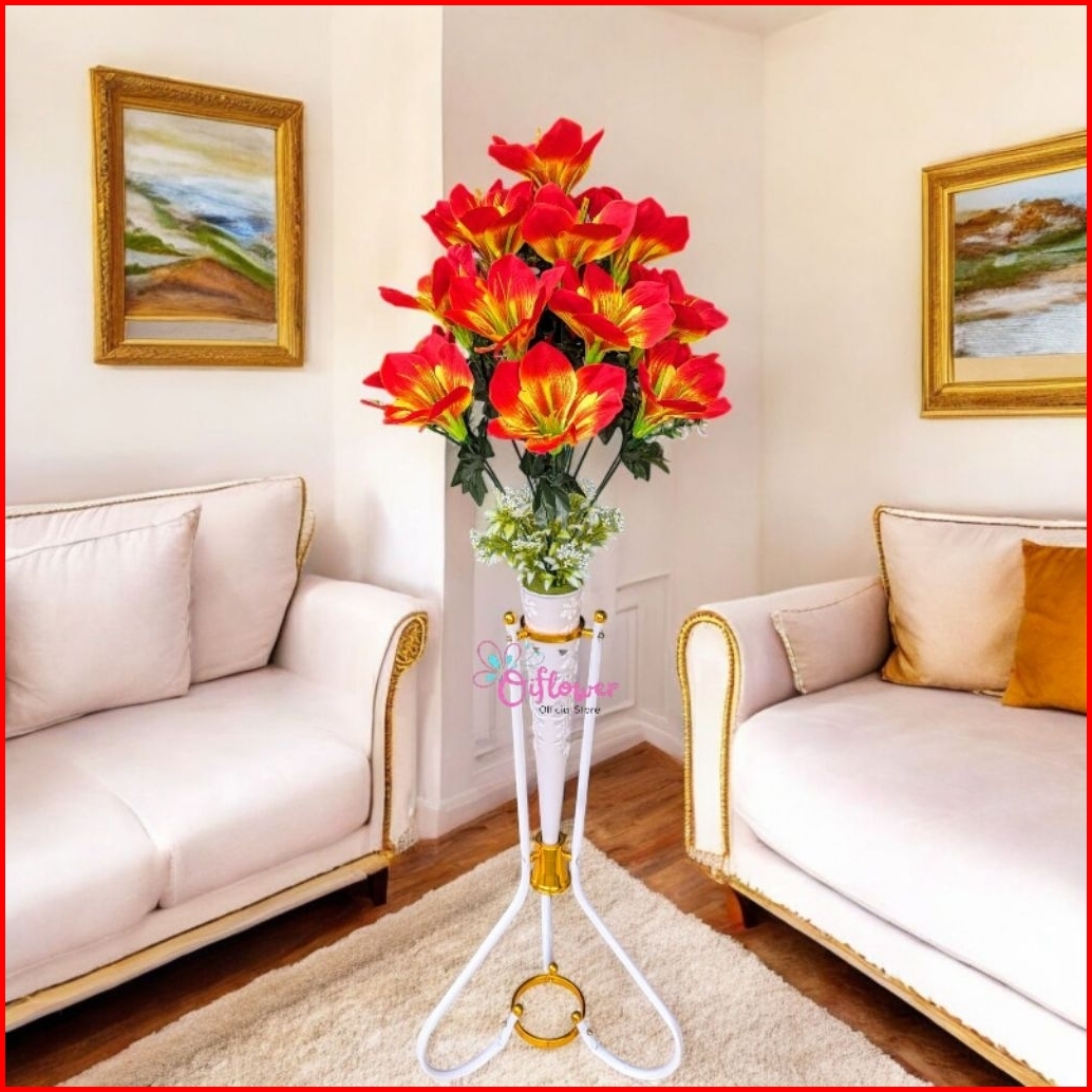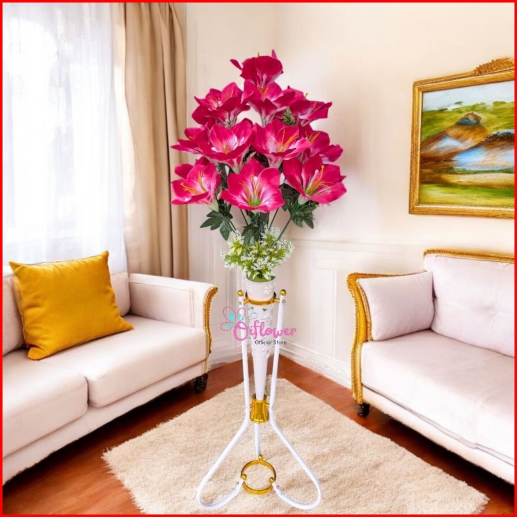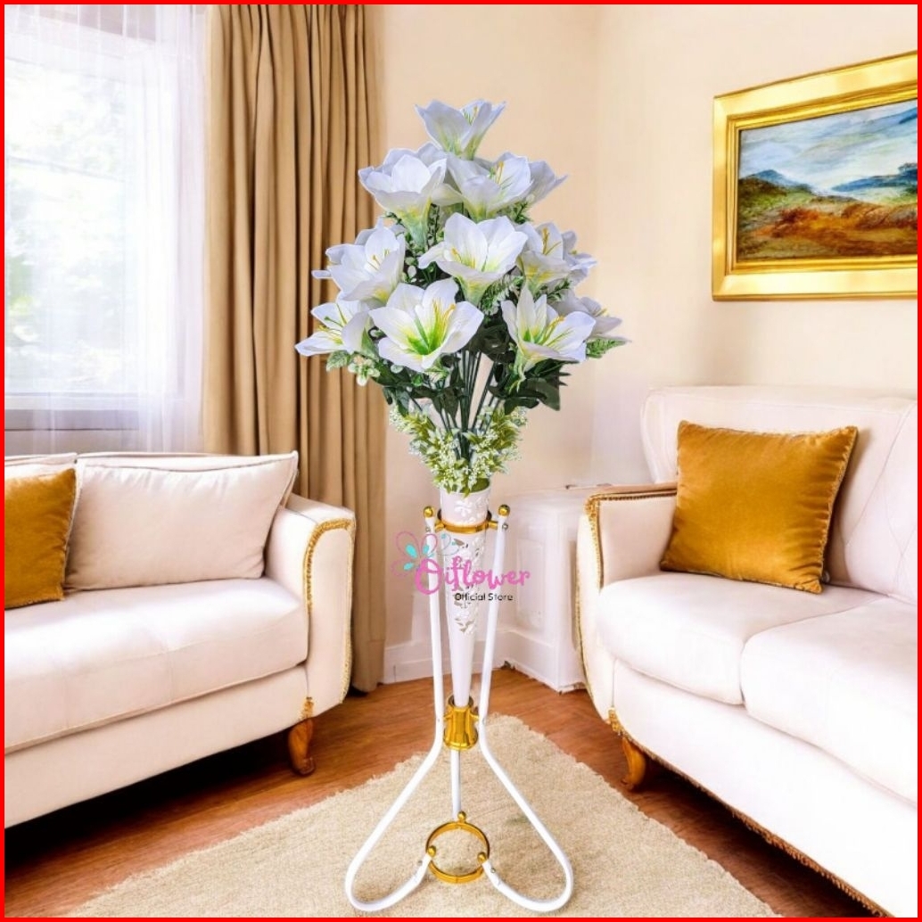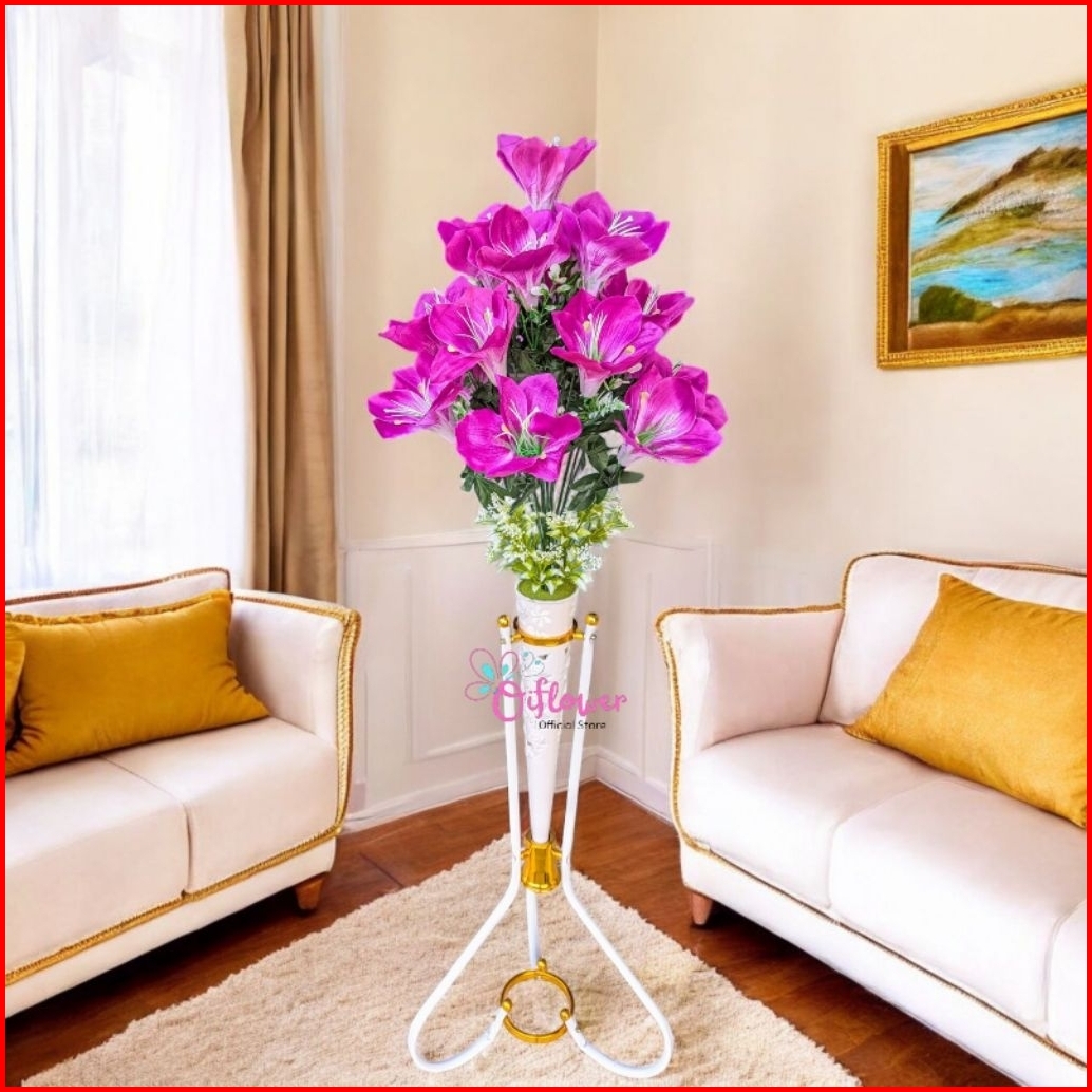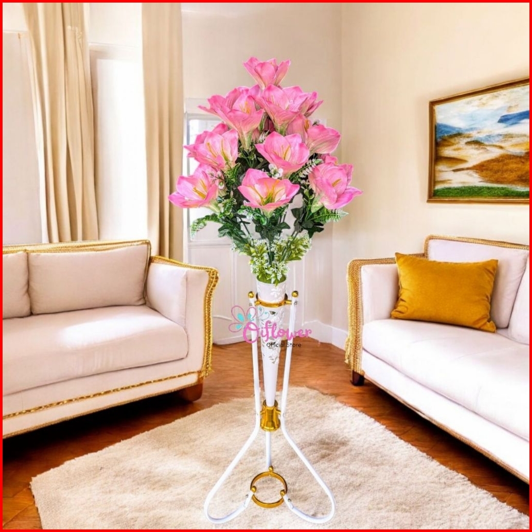 Bunga Hias Magnolia 18.kuntum Satu Set Lengkap Dengan Vas Standing Besi Hiasan Dekorasi Sudut Ruangan