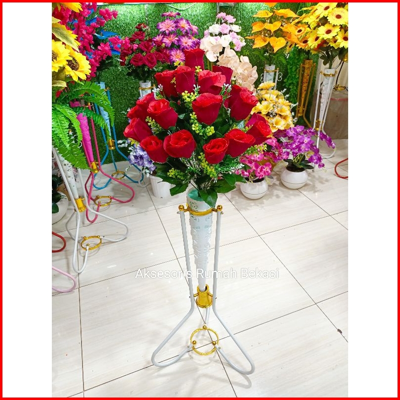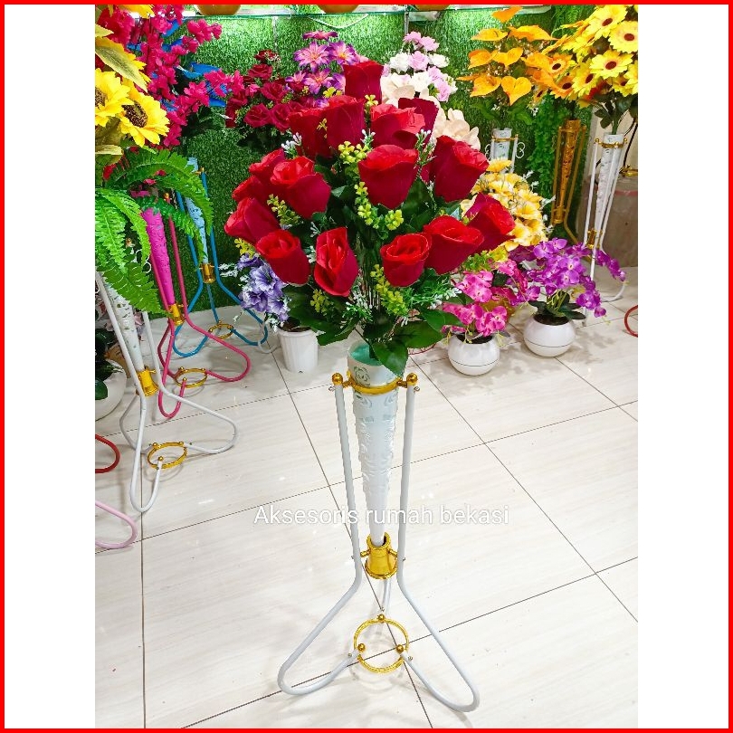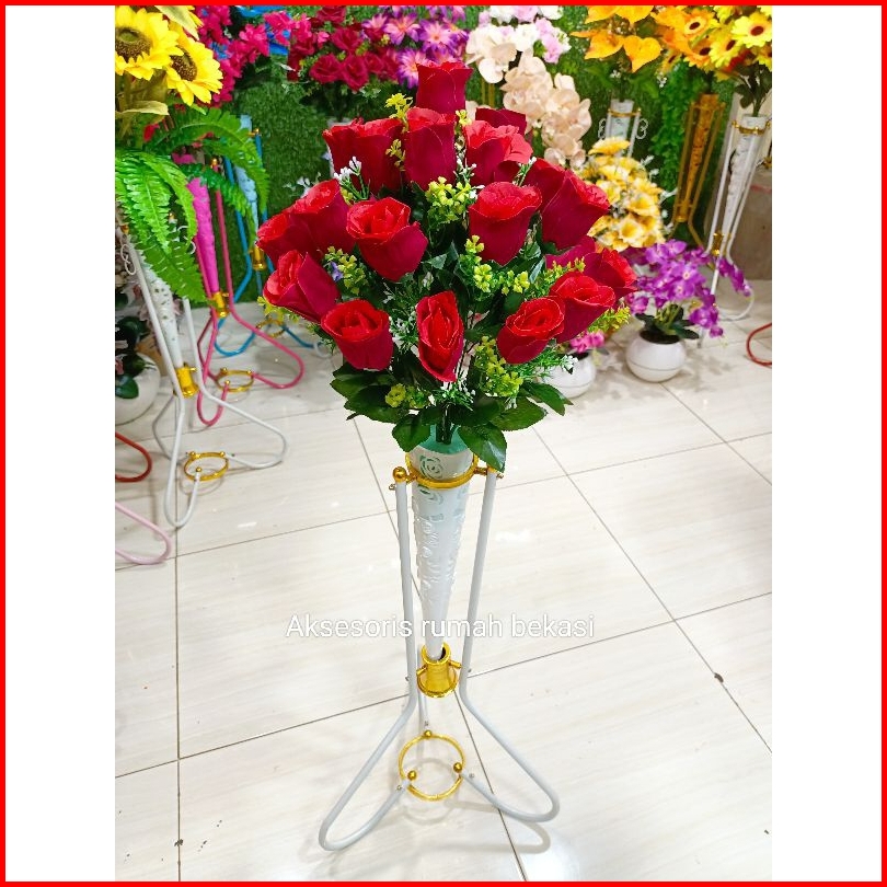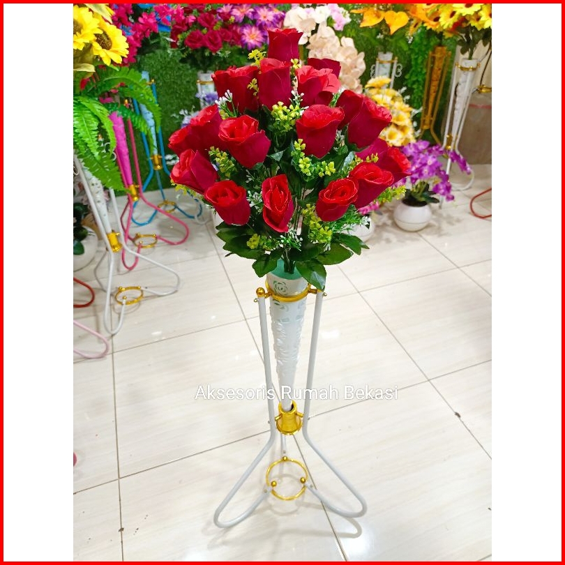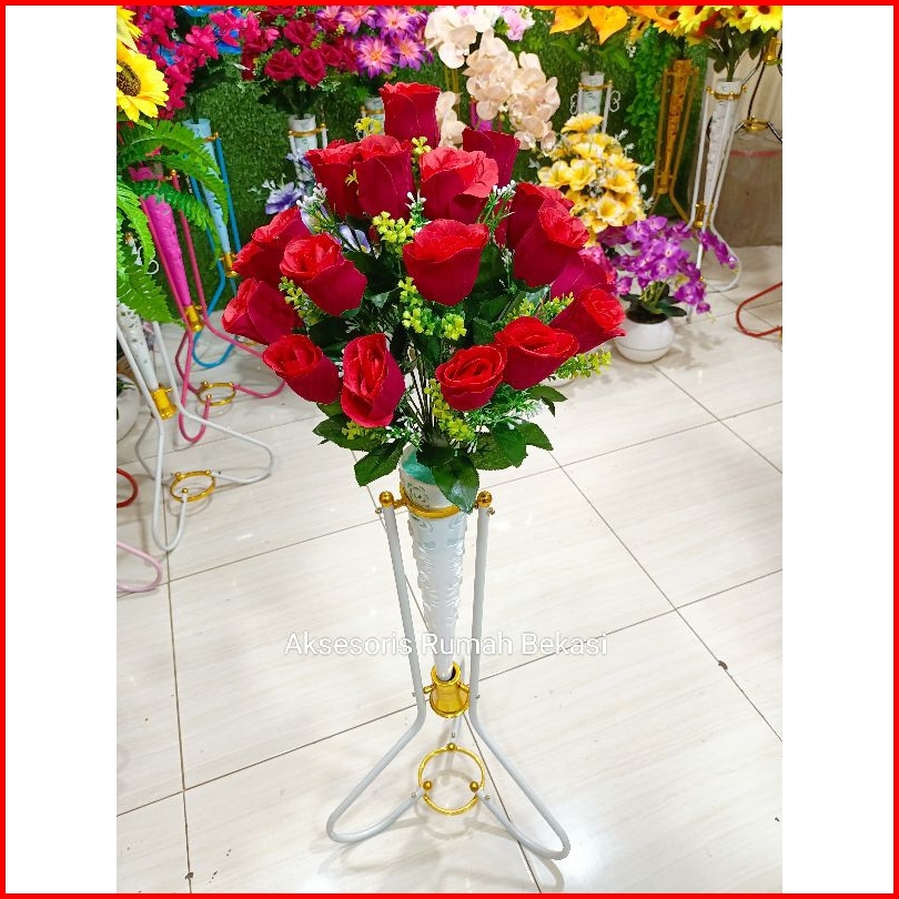 Rangkaian Bunga Mawar Beludru Kuncup 24 Tangkai Dengan Pot Standing Besi