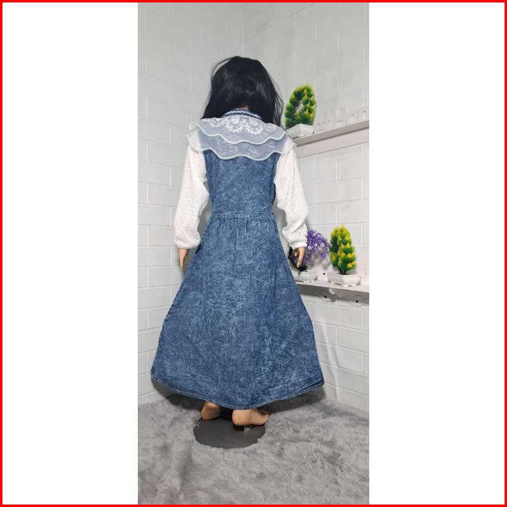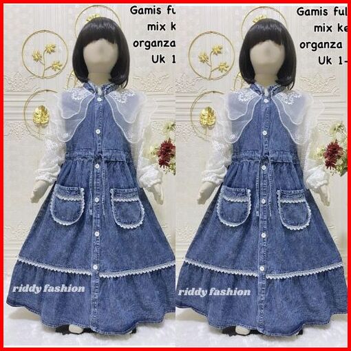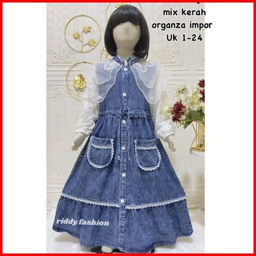 Gamis Jeans Butterfly Krah Organza Import Mix Brukat Full Puring Anak Usia 3 - 10 Tahun Long Dress Denim Kancing Lepas V