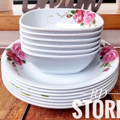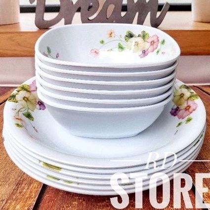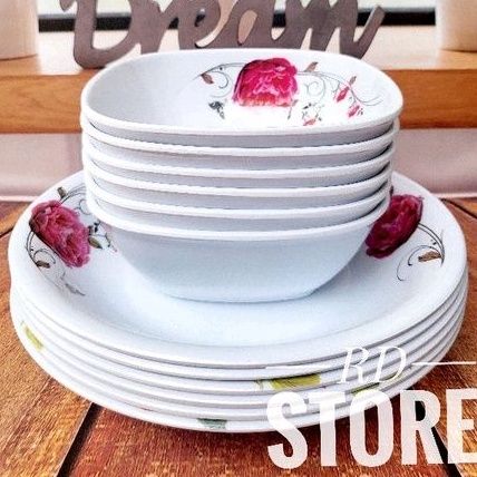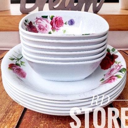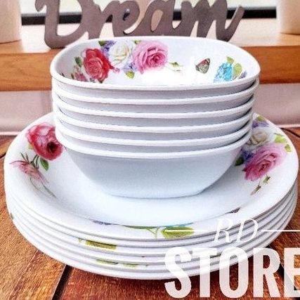 12.PCS ISI 6.PIRING MAKAN 6.MANGKOK SAYUR BAHAN MELAMINE WARE MOTIF ROSE TEBAK DAN KUAT
