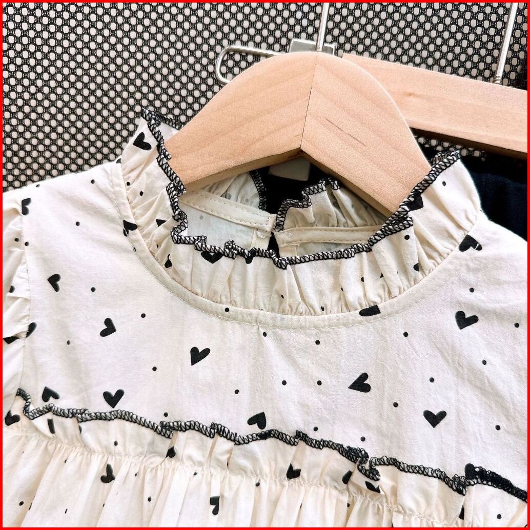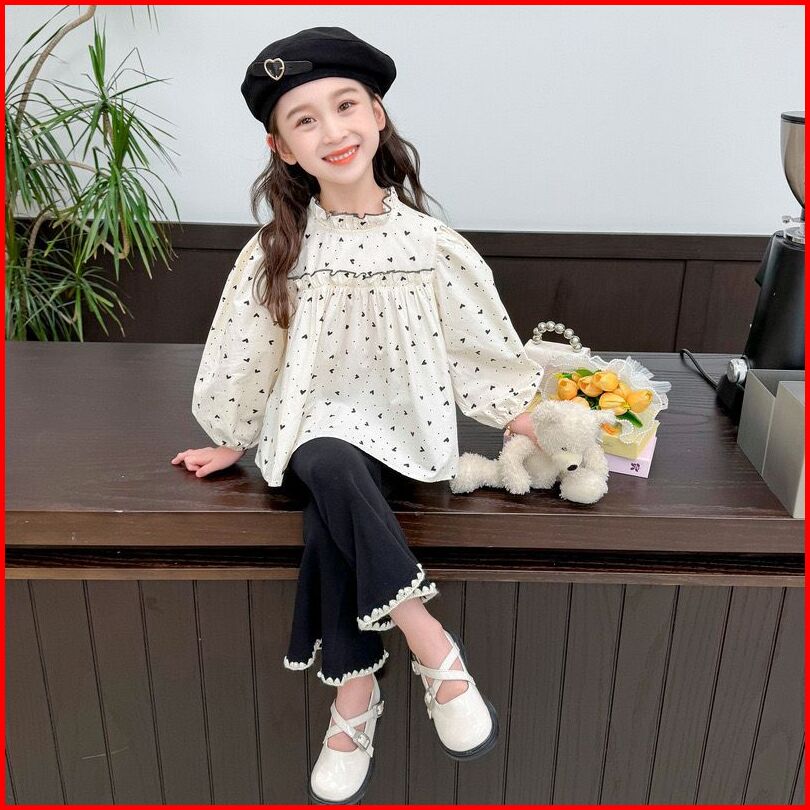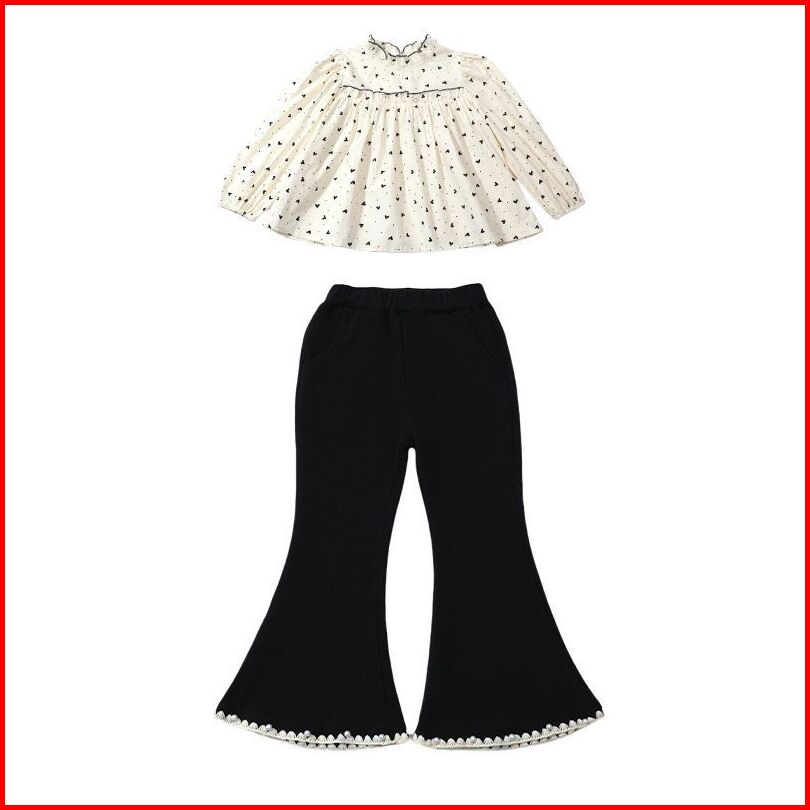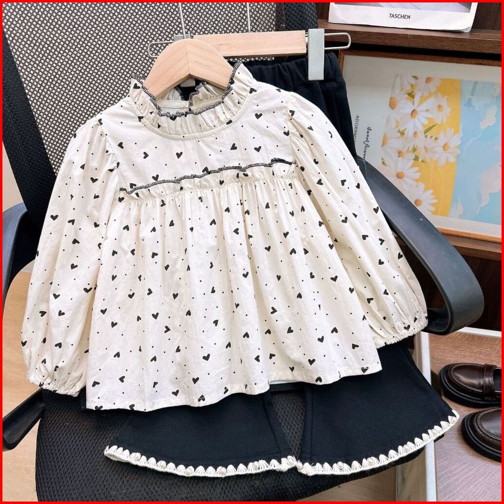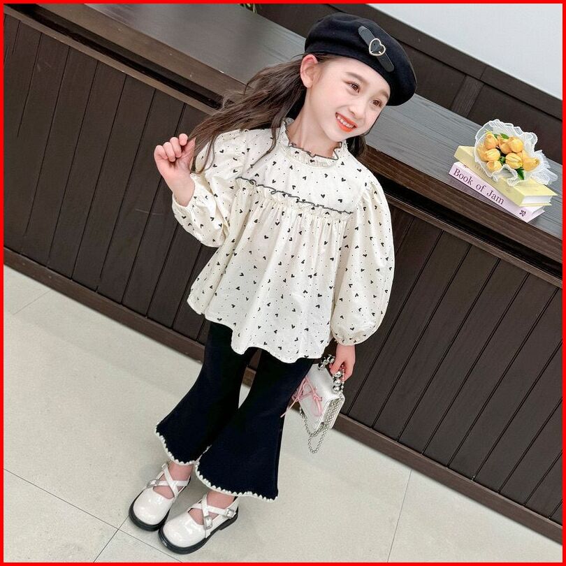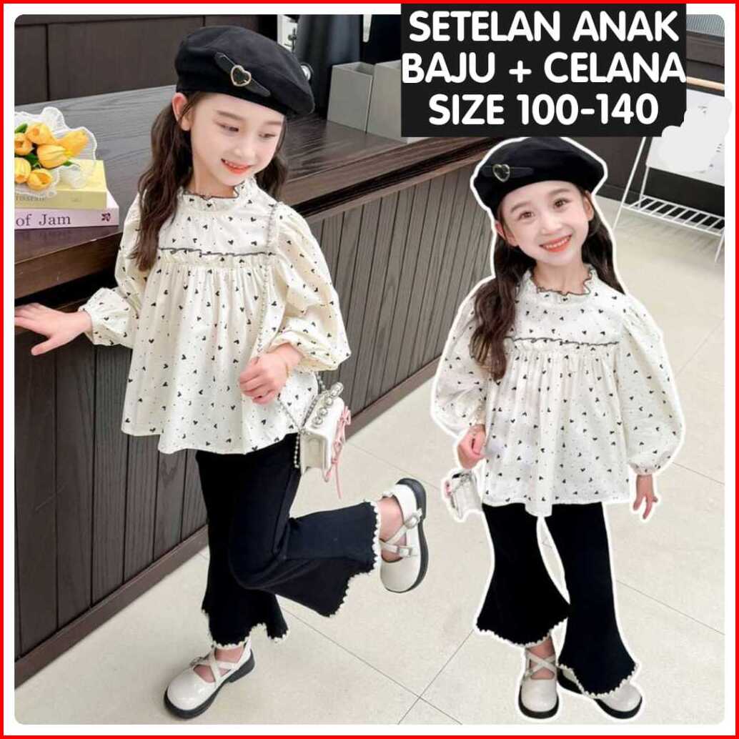 Loli-jkt Bs- 763 Setelan Anak Cewek Cream Love Lengan Panjang Celana Panjang Hitam Mutiara Size 100-140