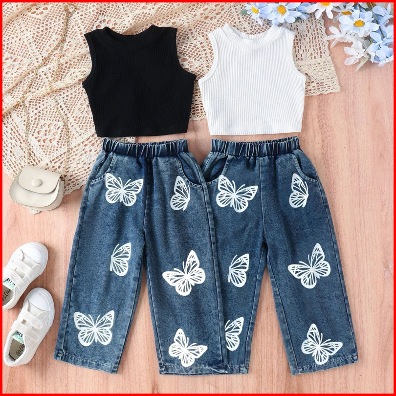 Setelan Anak 1-5 Tahun Kupu Knit Pakaian Anak Perempuan Baju Anak Celana Denim Baju Anak Bangsa