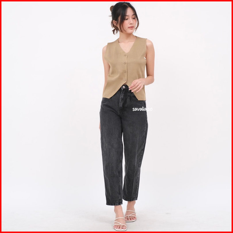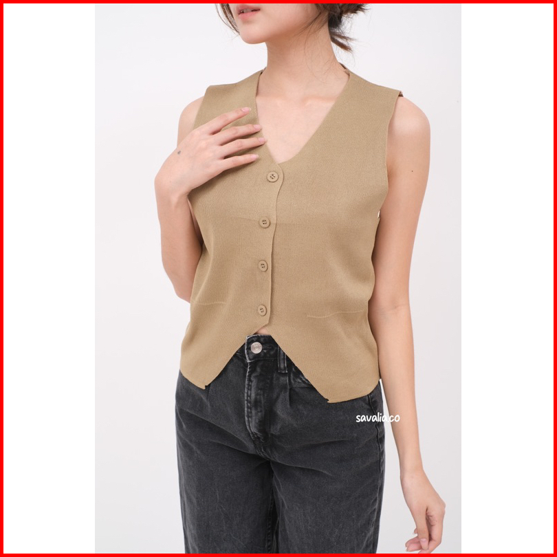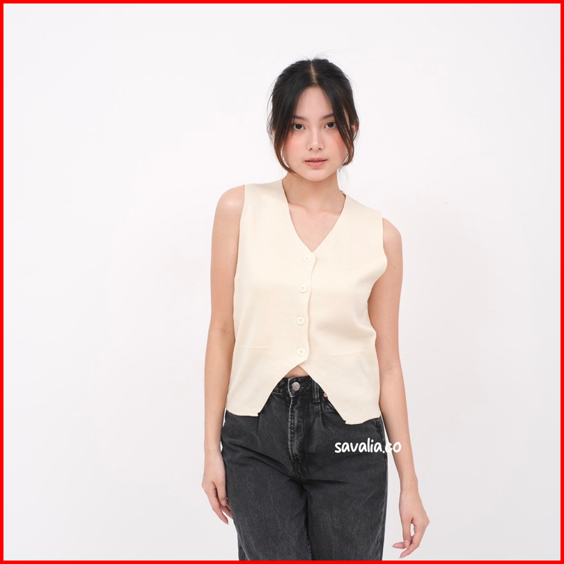 Savalia Rumi Knit Vest Tank Top Atasan Wanita Rompi Kancing V-neck Motif Polos Basic 119