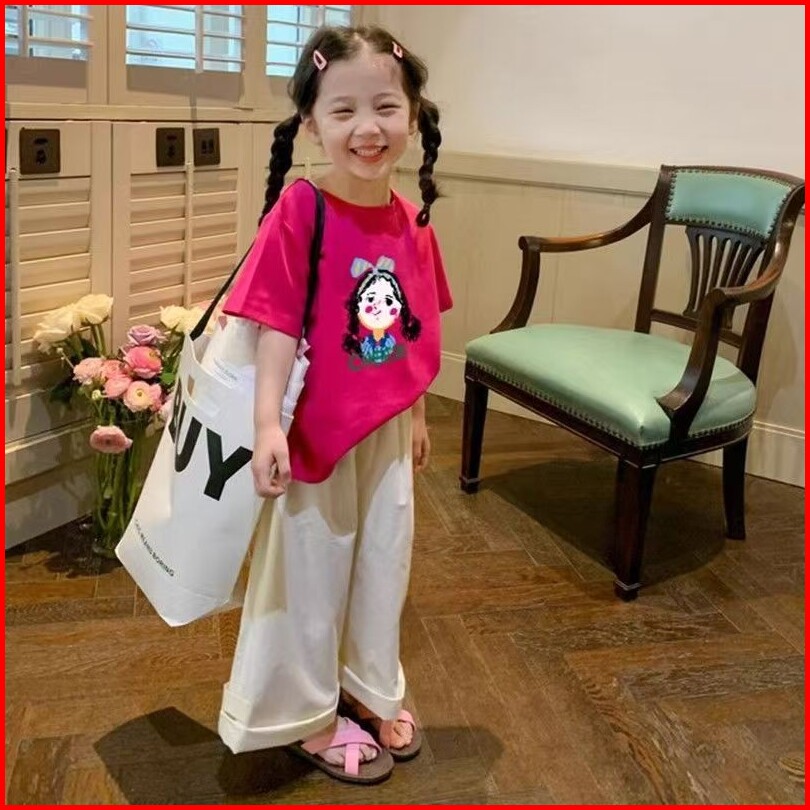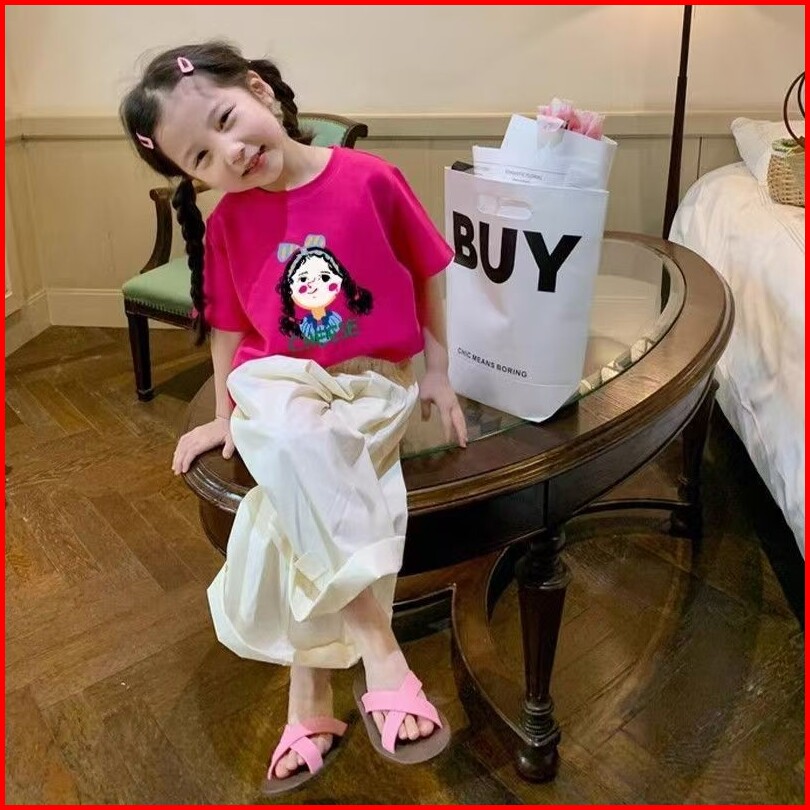 Setelan Anak Perempuan Oneset Anak Perempuan Bahan Katun Motif Lucu Girl Wide-leg Pants Warna Putih