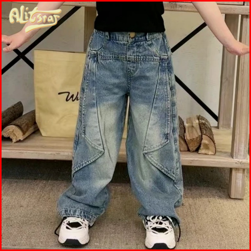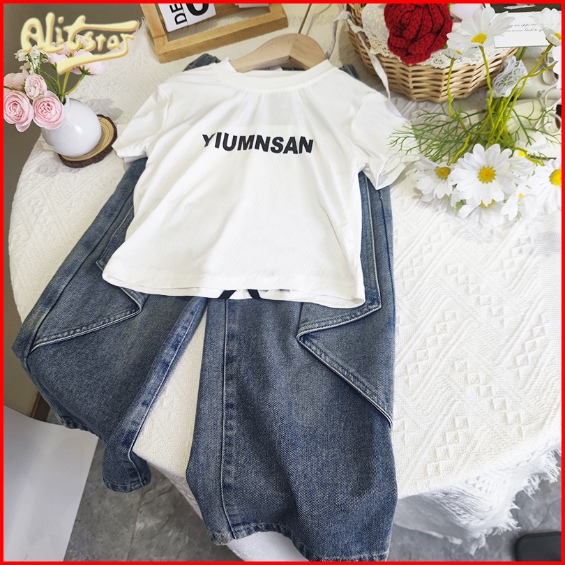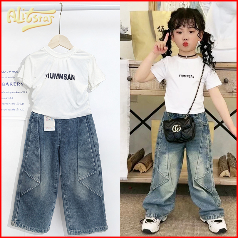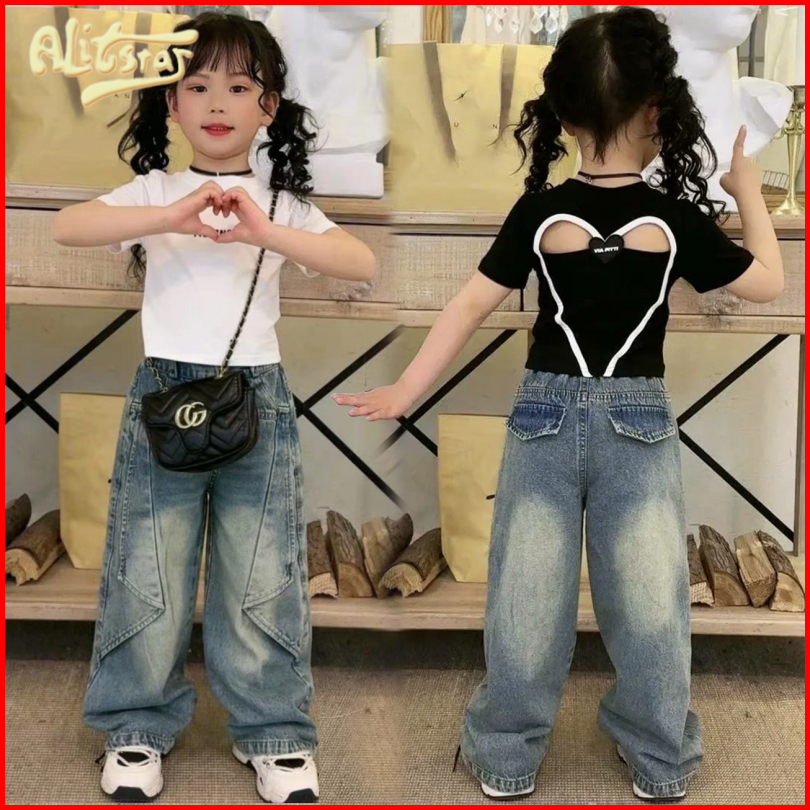 Setelan Baju Anak Perempuan 2-10 Tahun Kaos Dengan Potongan Di Bagian Belakang Celana Jeans Anak Terbaru