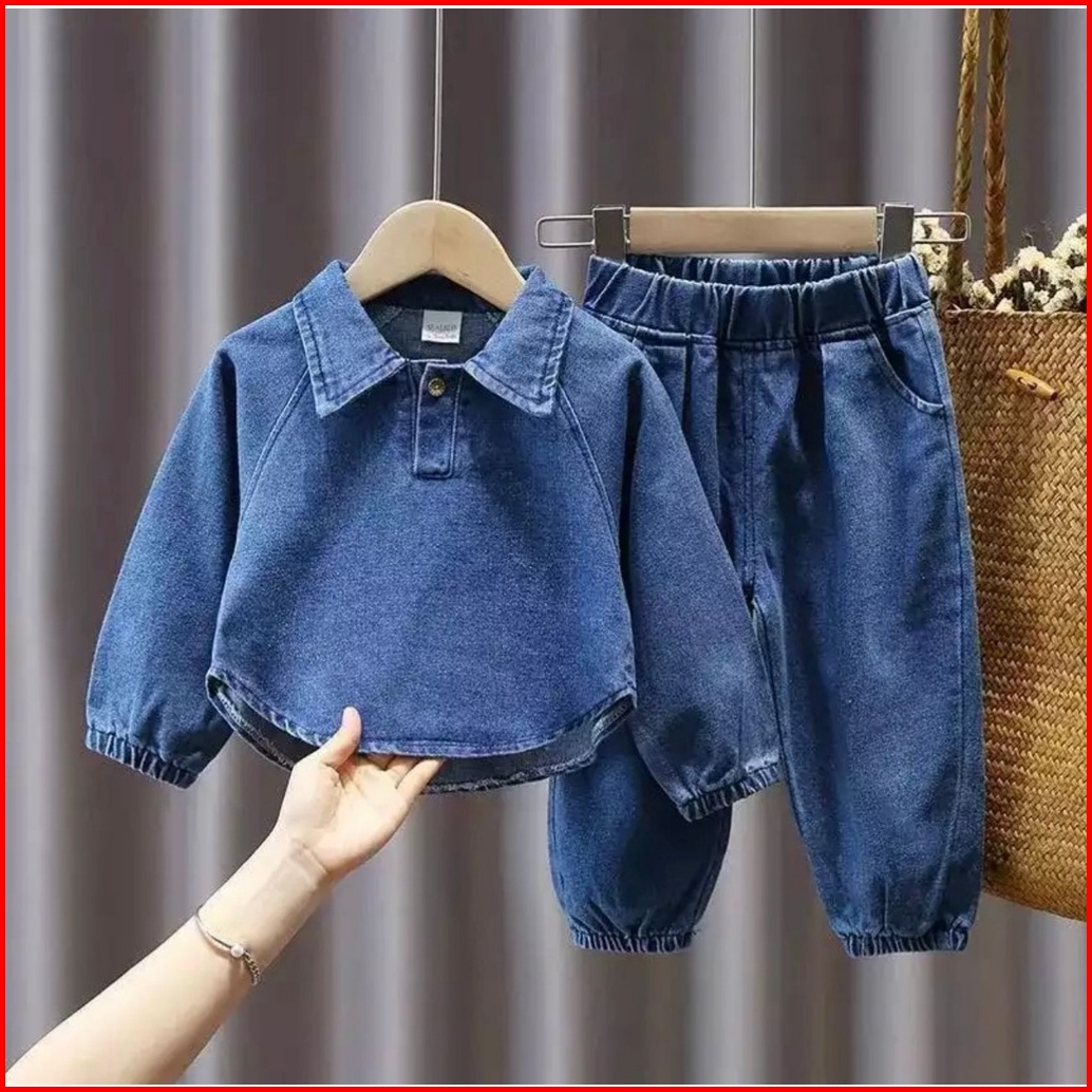 Setelan Anak Denim Jeans Jaket Dan Celana Panjang Motif Kartun Lucu Usia 1-5 Tahun