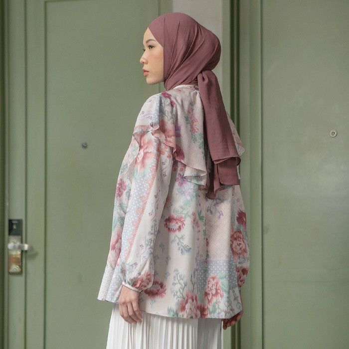 (TERLARIS)HijabChic Eraya Lilac Ash Top - Baju Lebaran Sarimbit Motif Bunga Katun Premium Ruffle Depan Elegan