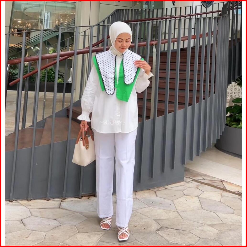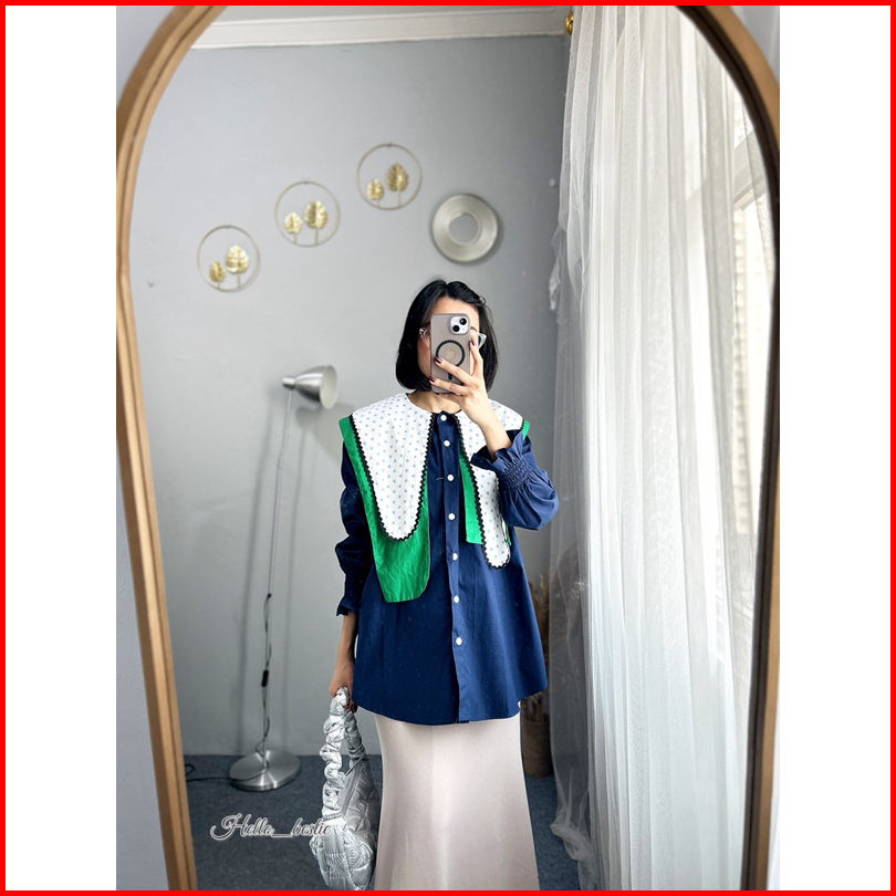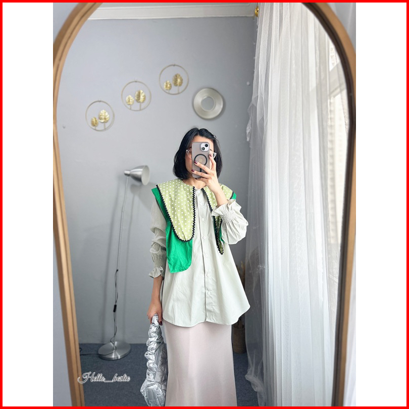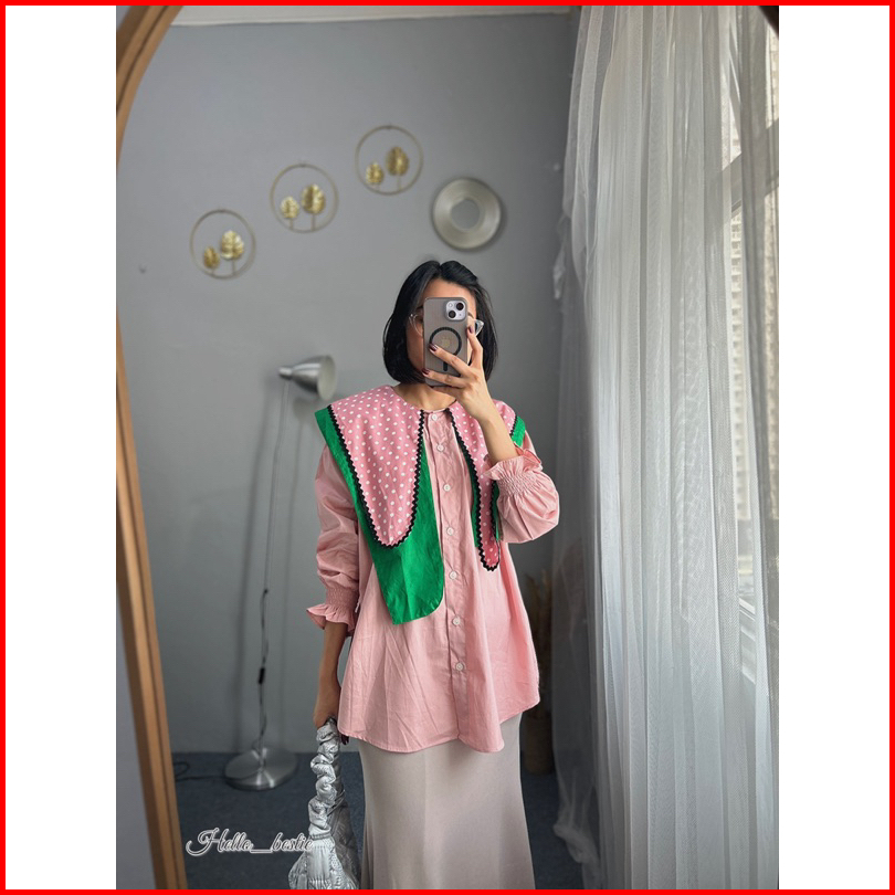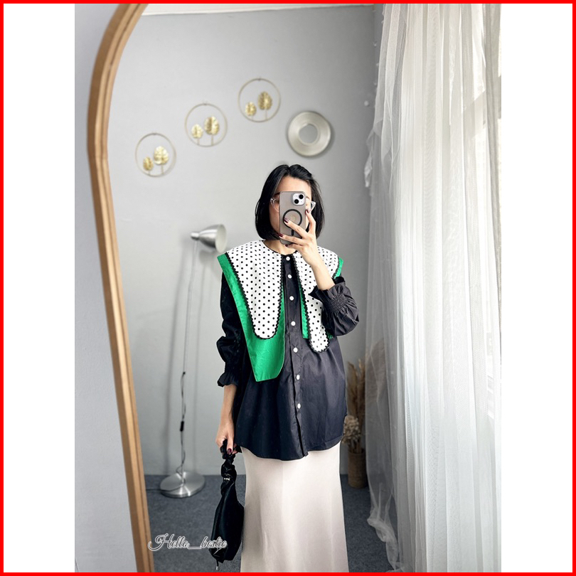 Hello Bestie - Clio Collar Blouse Ld 116cm - Blouse Wanita Lengan Panjang Puff Karet Detail Polkadot Katun Collar Casual