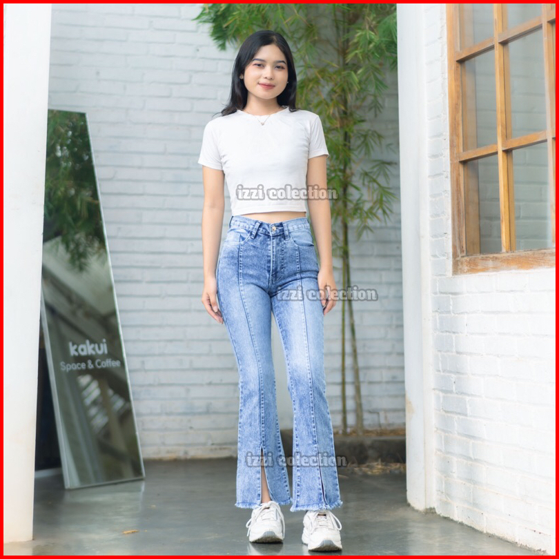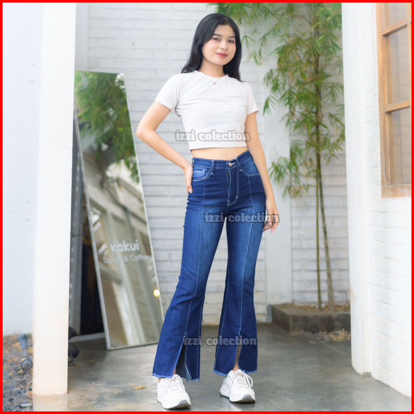 Celana Jeans Cutbray Wanita Highwaist Belah Tengah Rawis Jeans Stretch Mulur Dewasa Muat Bb Jumbo