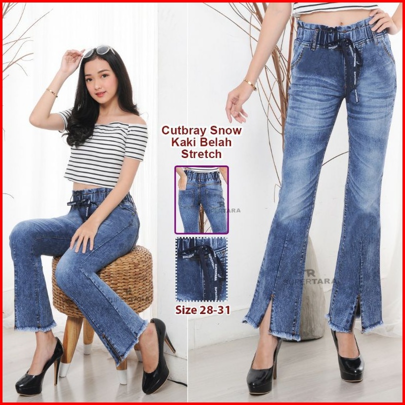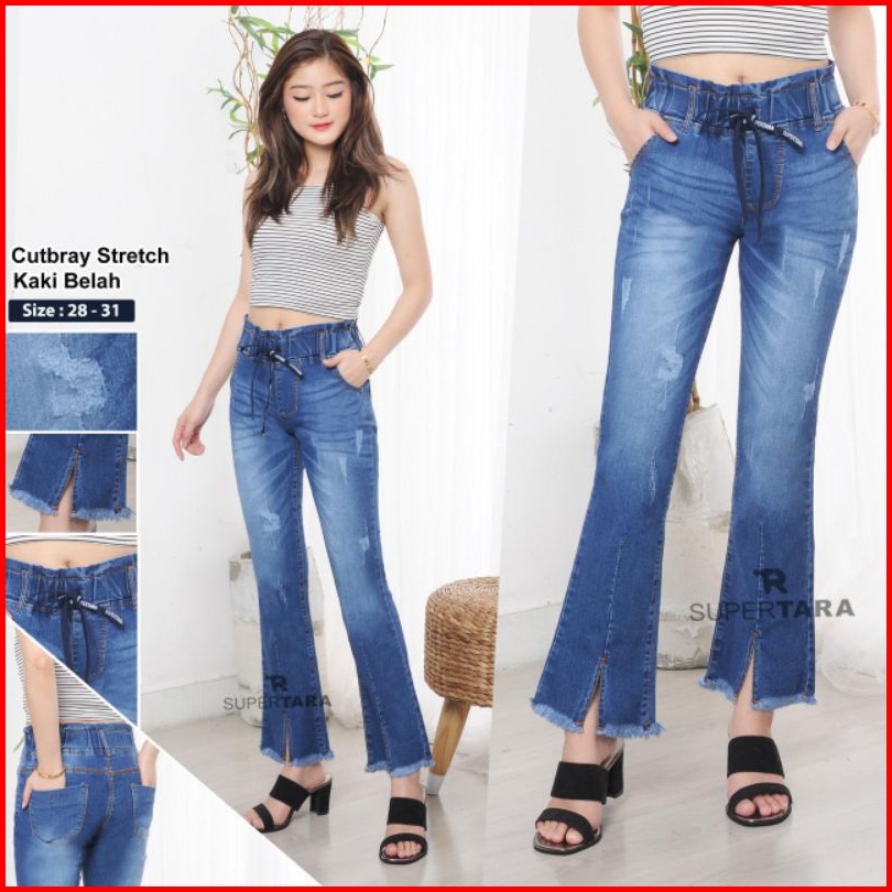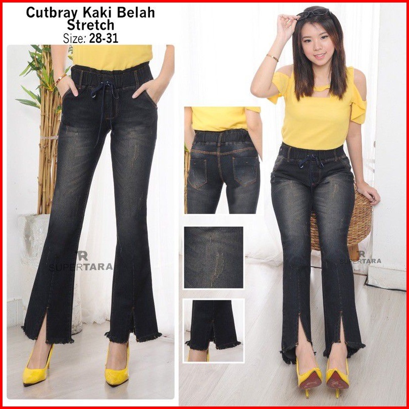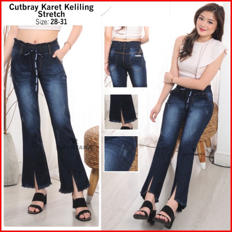 Tr16- Celana Jeans Wanita Cutbray Belah Kaki Bulu Sz 28-31 Street Pinggang Karet