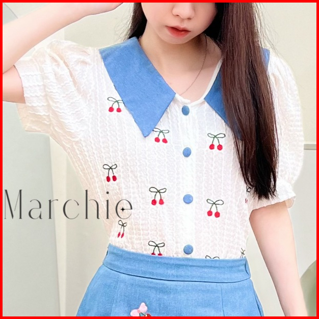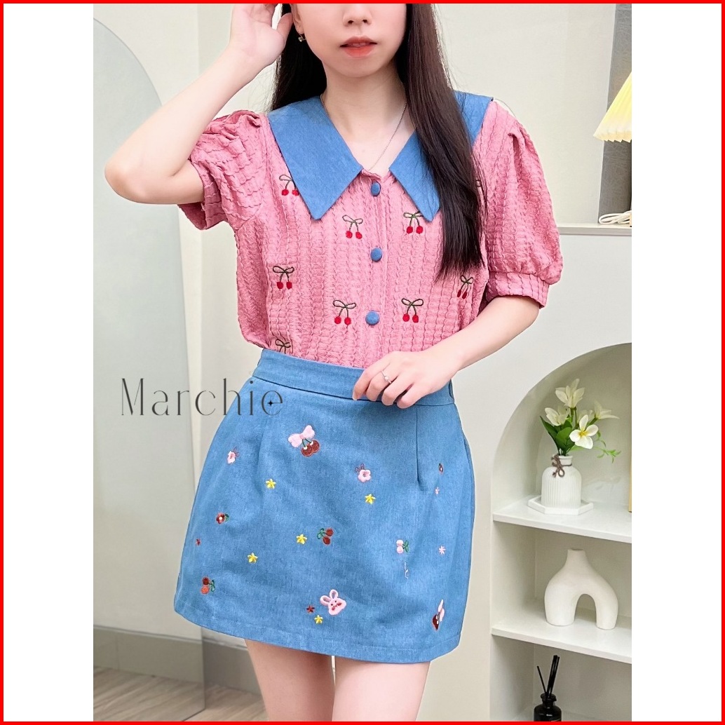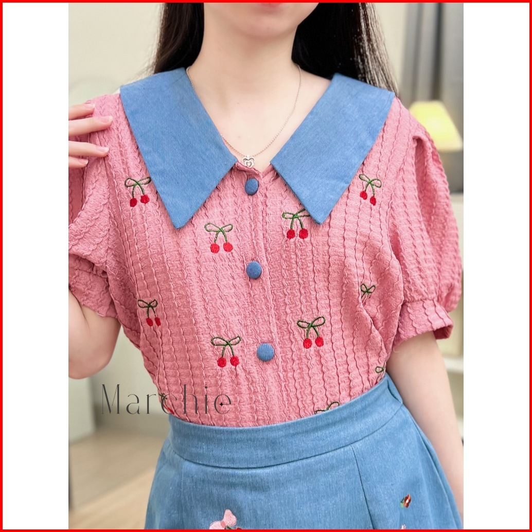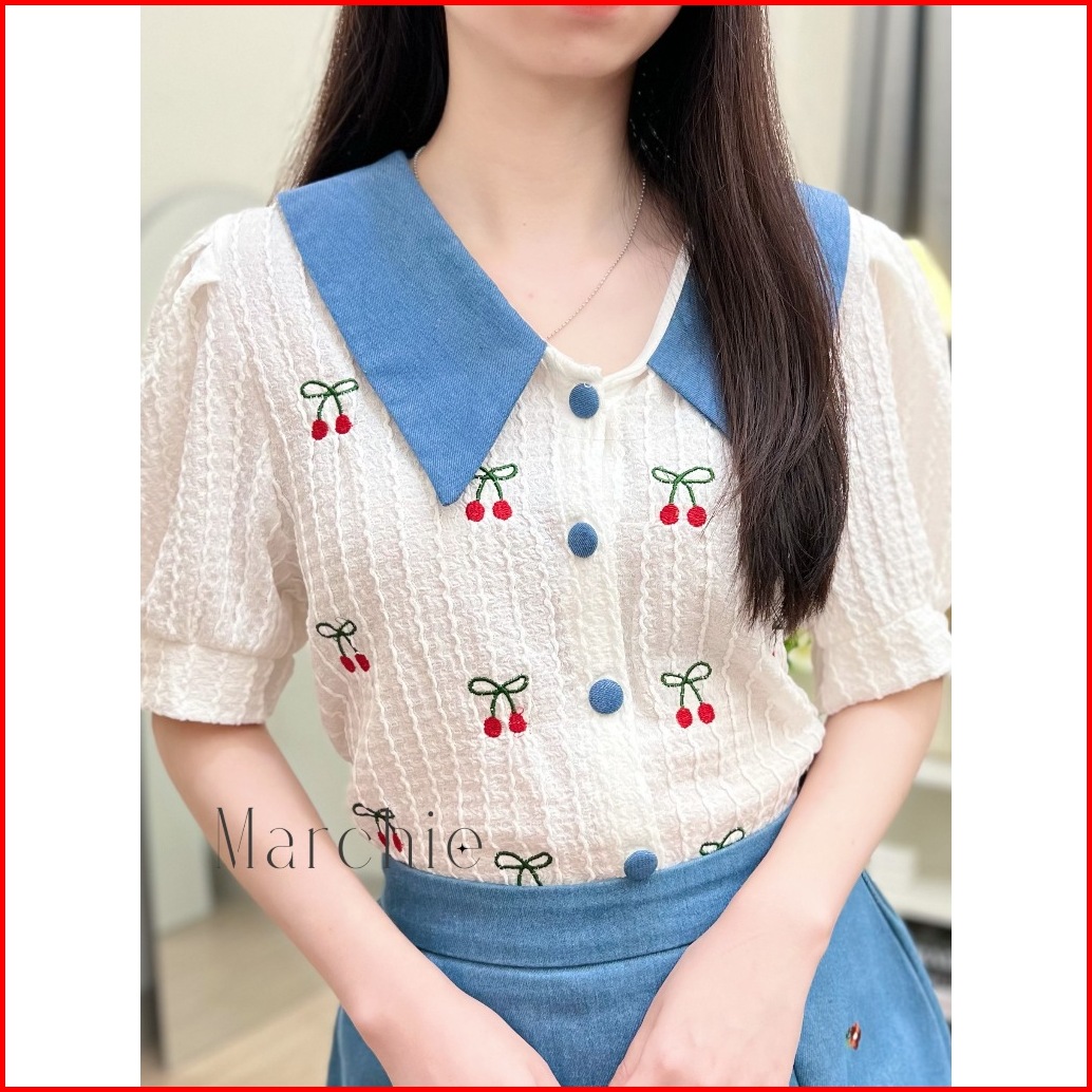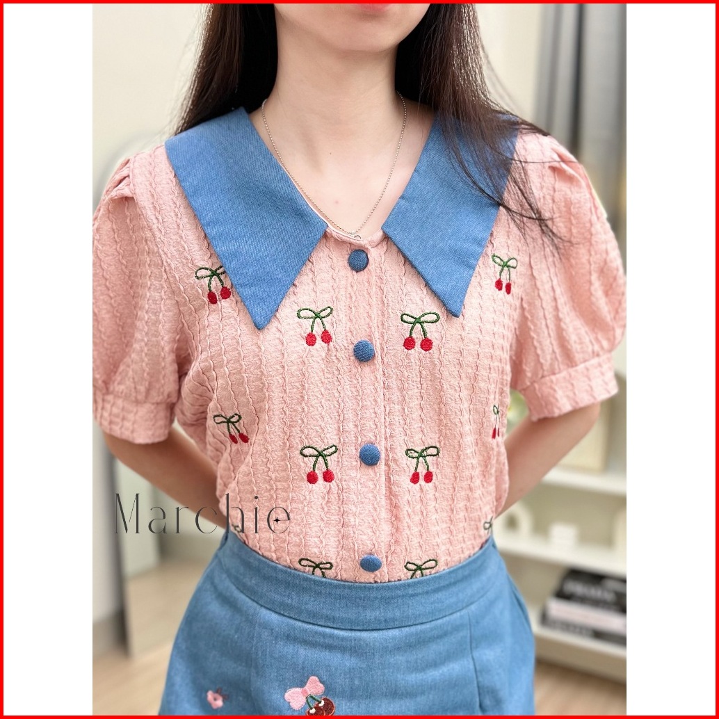 Marchie Ready Stock Bangkok - Denim Cherry Top Atasan Wanita Knit Kerah Bordir Baju Perempuan