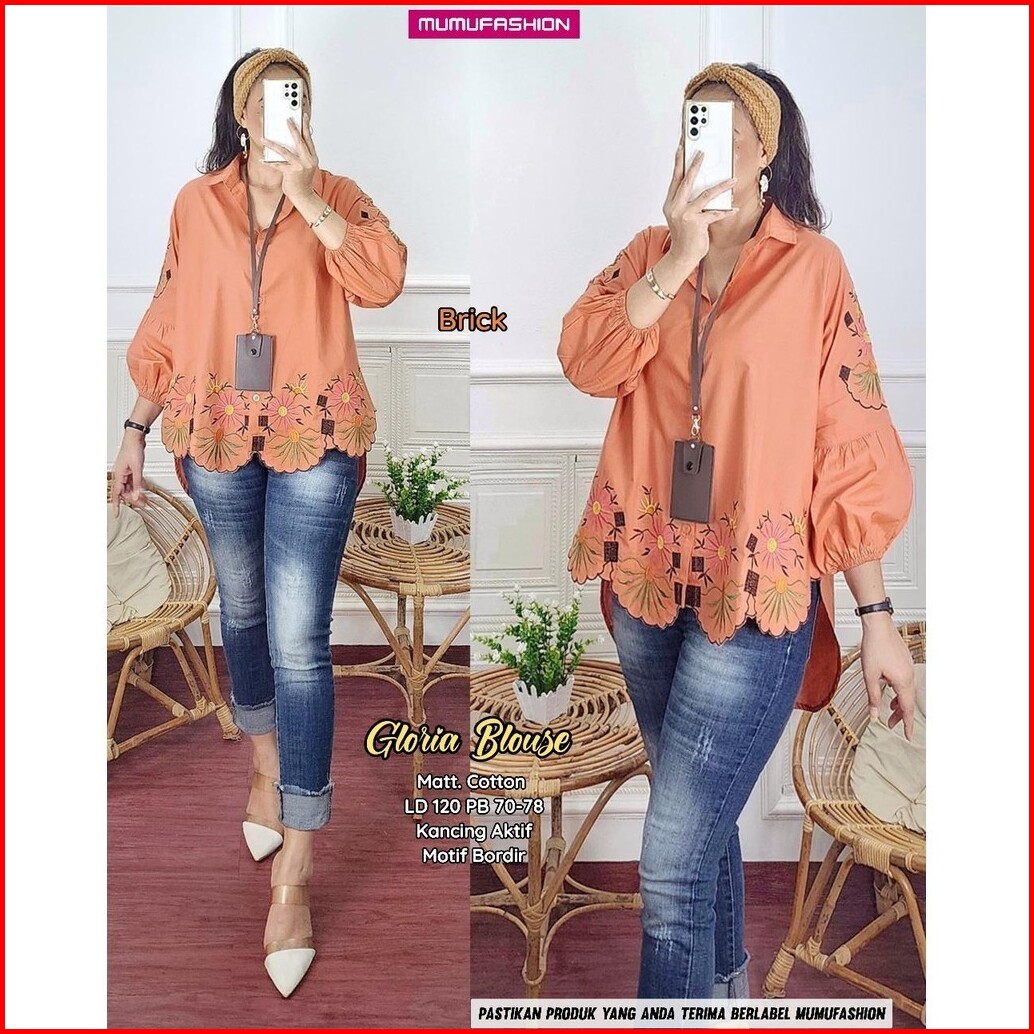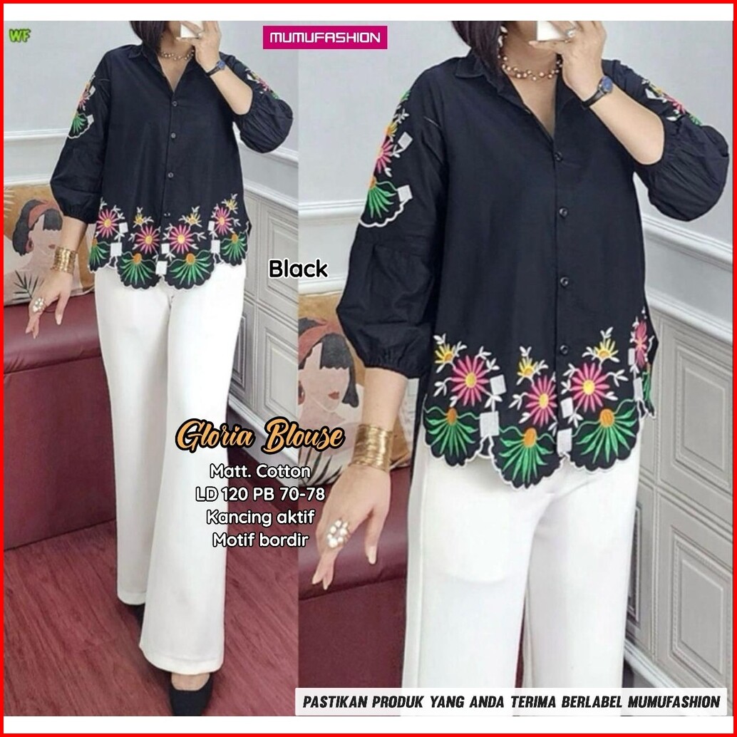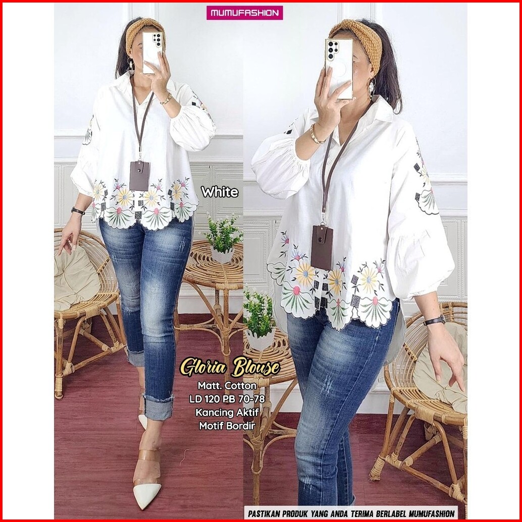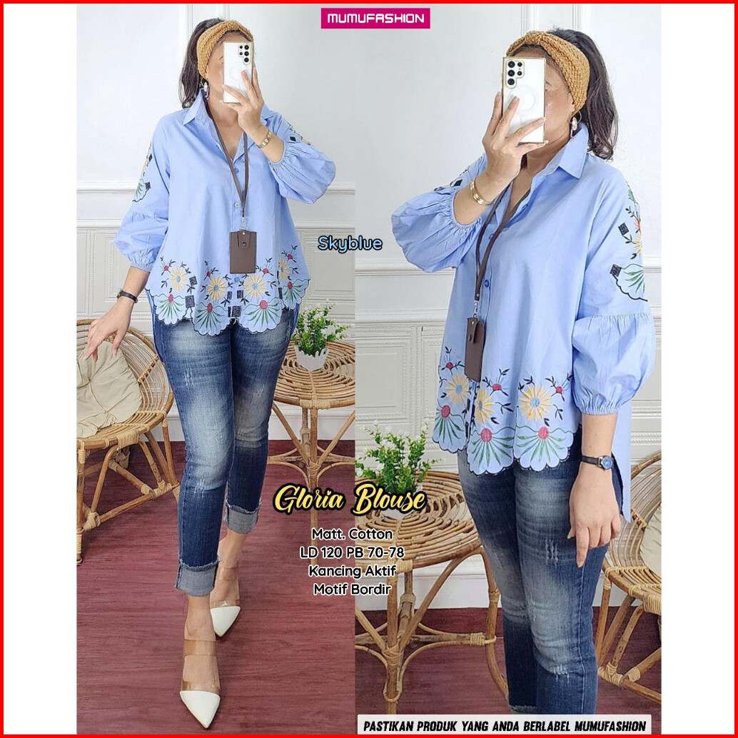 Gloria Blouse Atasan Kemeja Wanita Bahan Katun Lengan Balon Motif Bordir By Mumu Fashion
