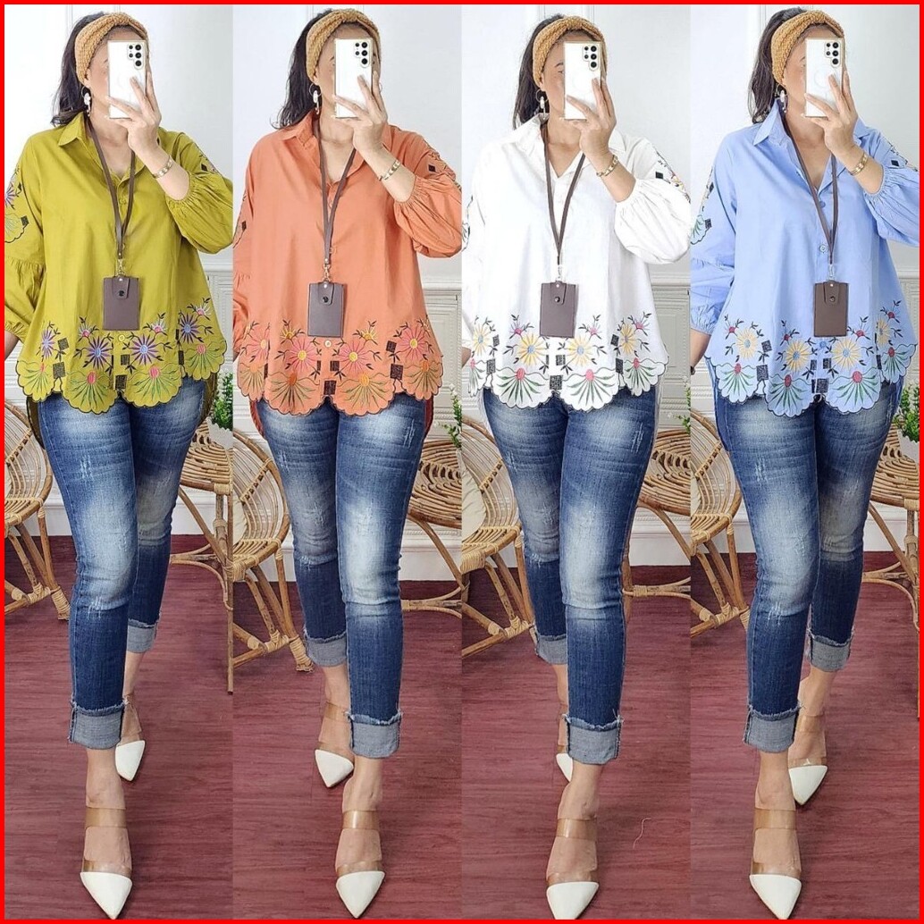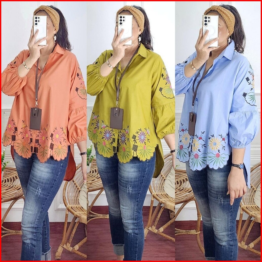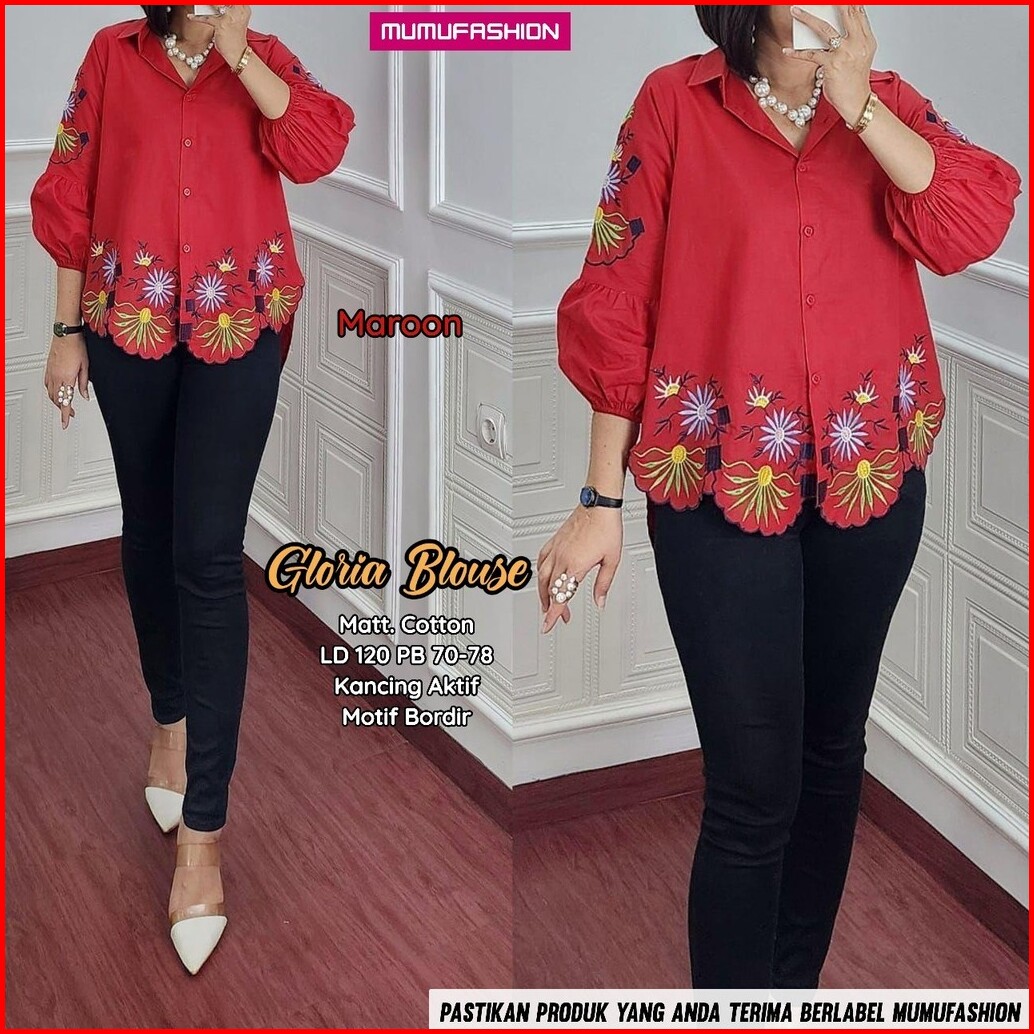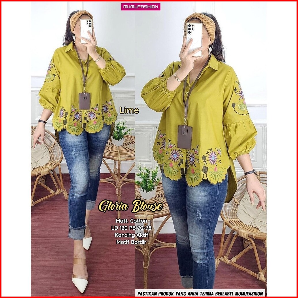 Gloria Blouse Atasan Kemeja Wanita Bahan Katun Lengan Balon Motif Bordir By Mumu Fashion