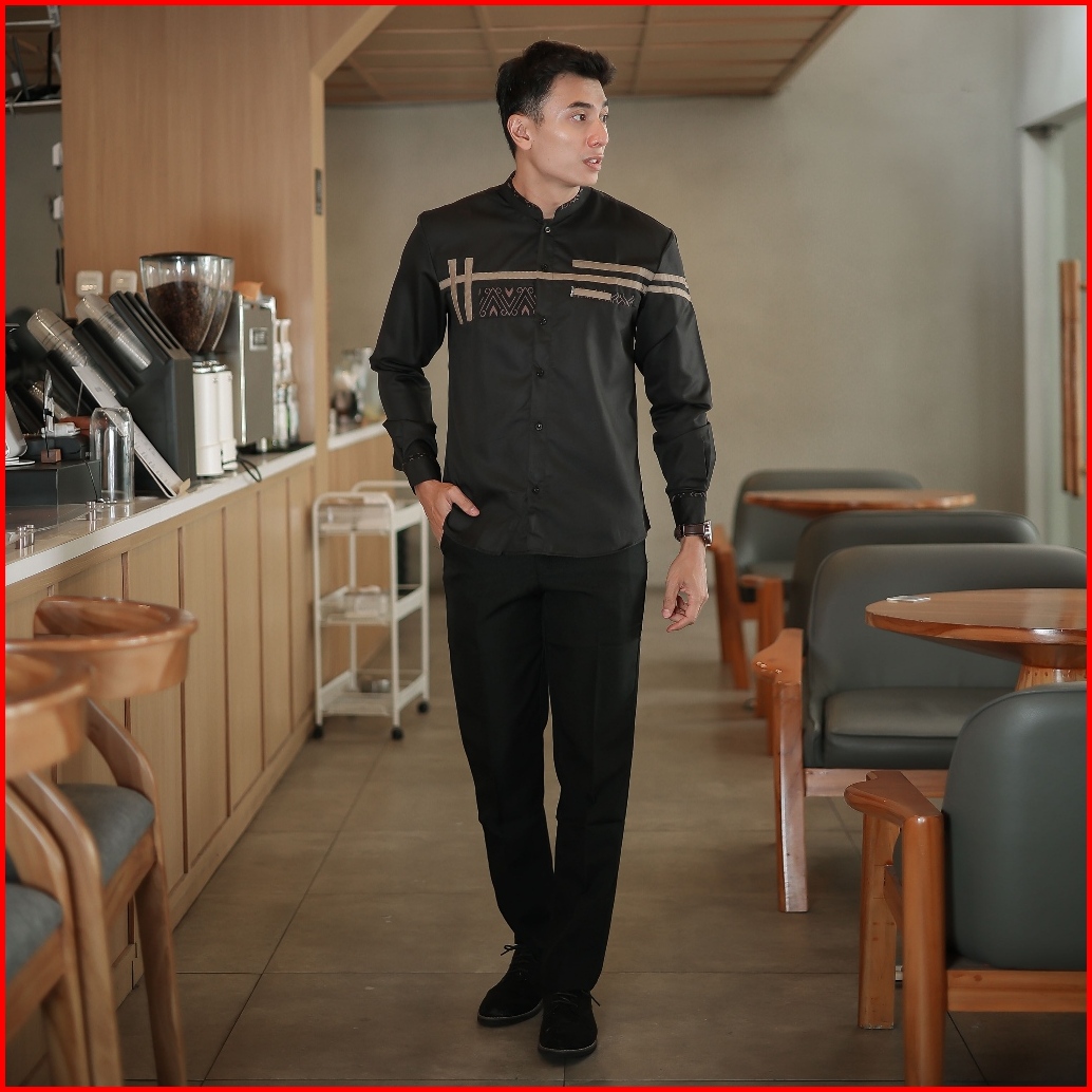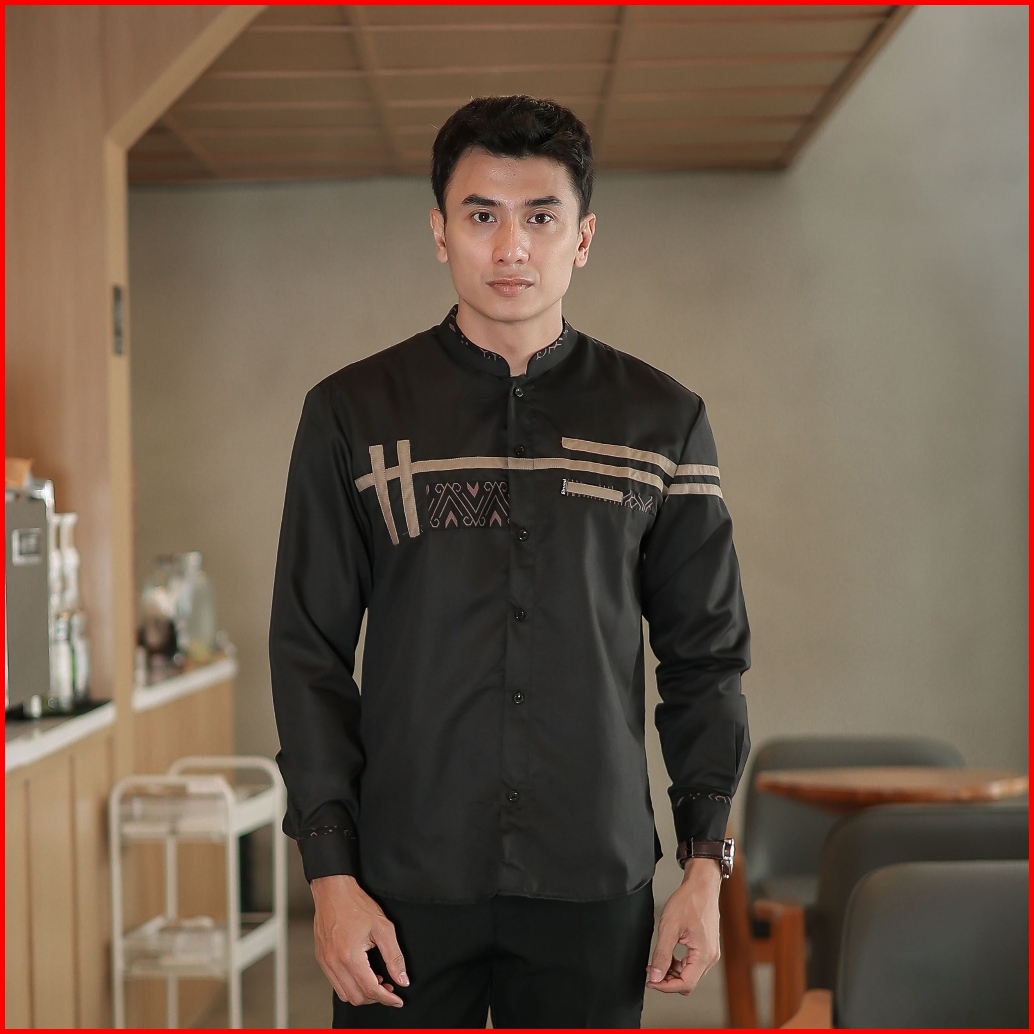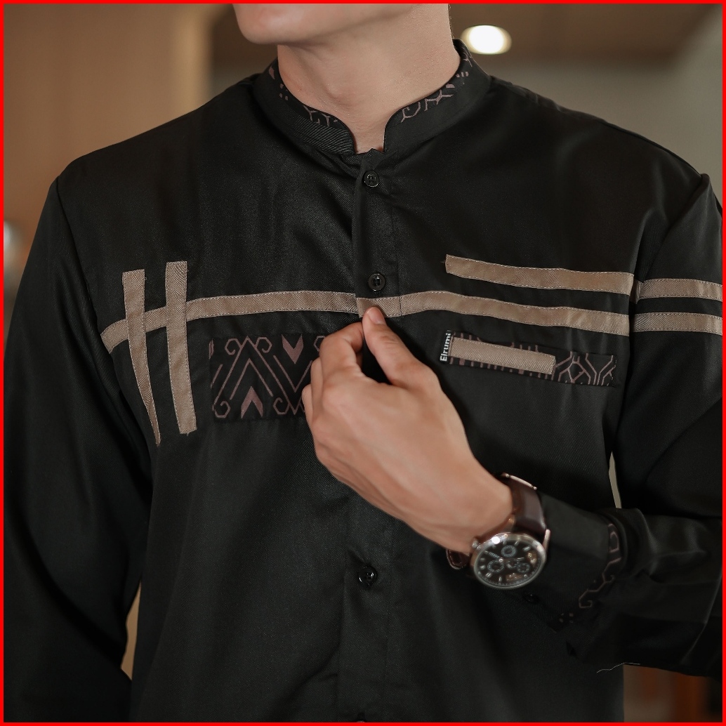 Baju Koko Pria Elrumi Lengan Panjang Motif Zolied Kombinasi Batik Warna Hitam