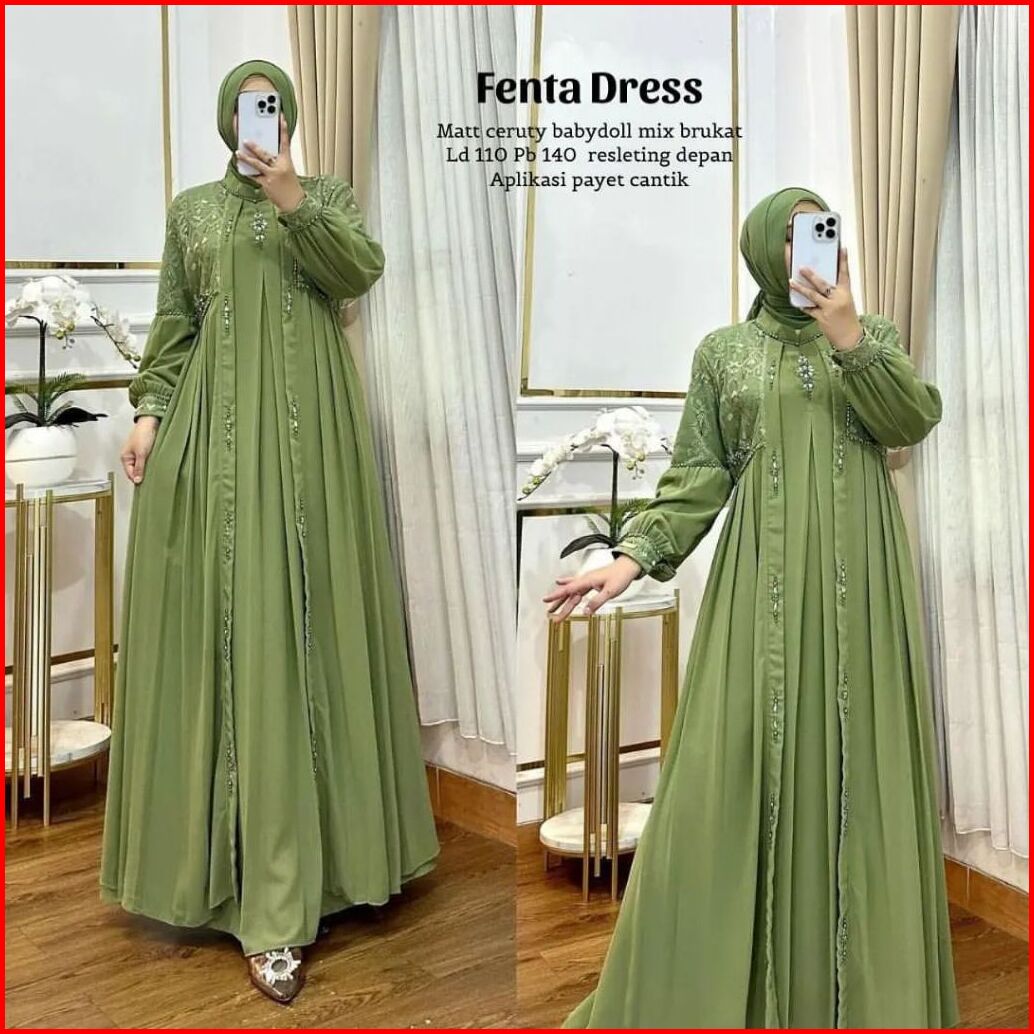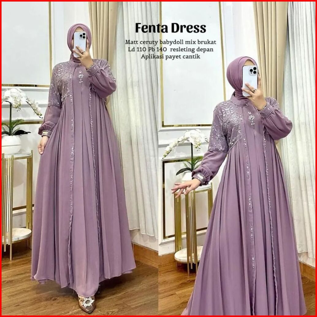 Fenta Dress Gamis Ceruty Babydoll Full Puring Mix Brukat Aksen Payet Mutiara Gamis Kondangan Mewah Gamis Muslim Terbaru
