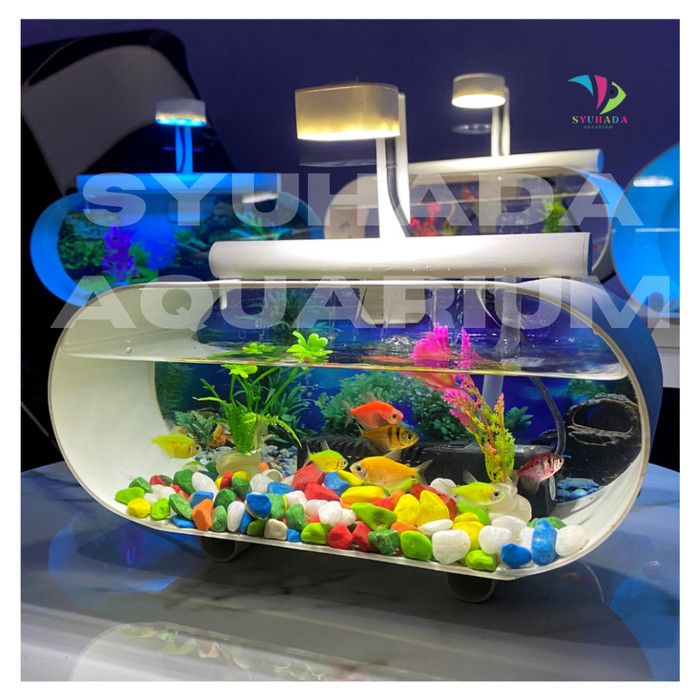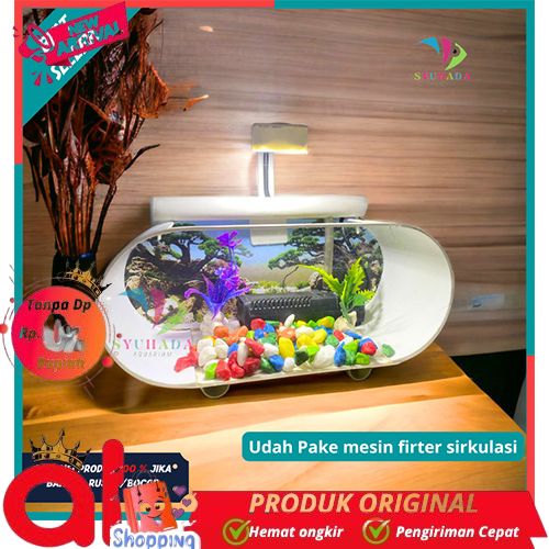 READY- 1 SET AQUARIUM KACA AKRILIK MINI IKAN HIAS LENGKAP TINGGAL PAKAI - LAMPU UNGU, TANPA MESIN