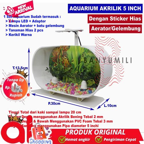 READY- AQUARIUM AKRILIK MURAH 5 INCHI FULL SET + POMPA AERATOR + BATU GELEMBU - PUTIH, DENGAN AERATOR