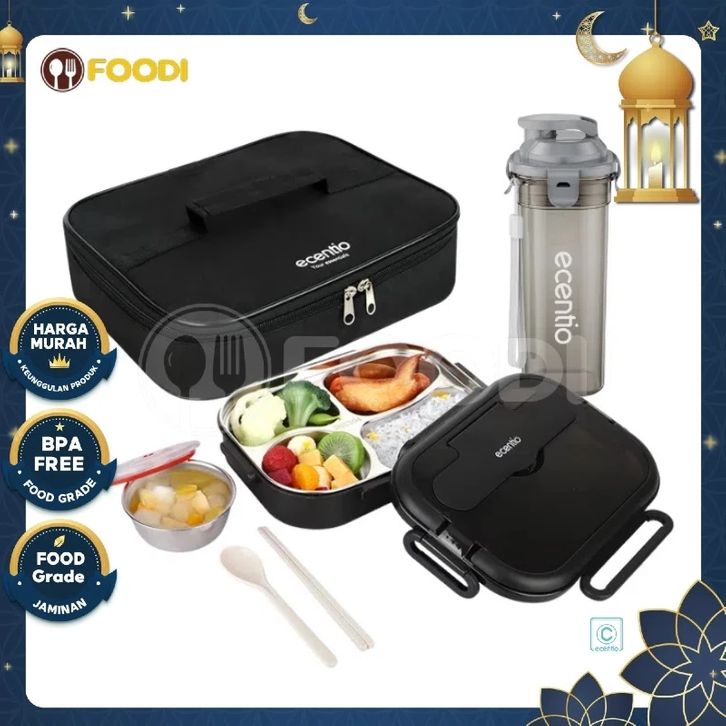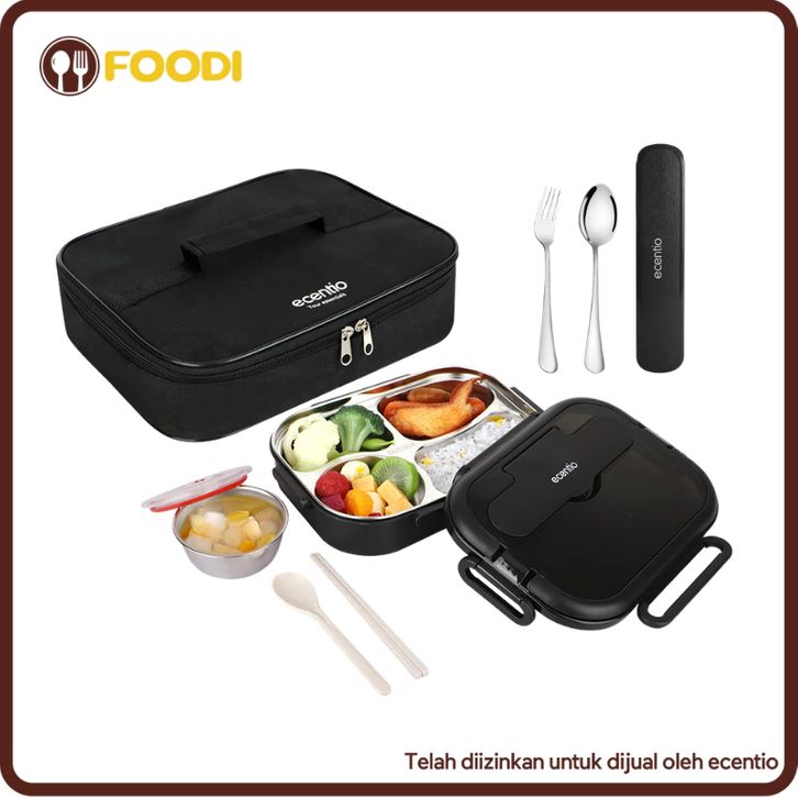 3pcs set ecentio dan foodi lunch box stainless kotak makan 4 sekat tahan panas dan anti tumpah tempat makan bekal