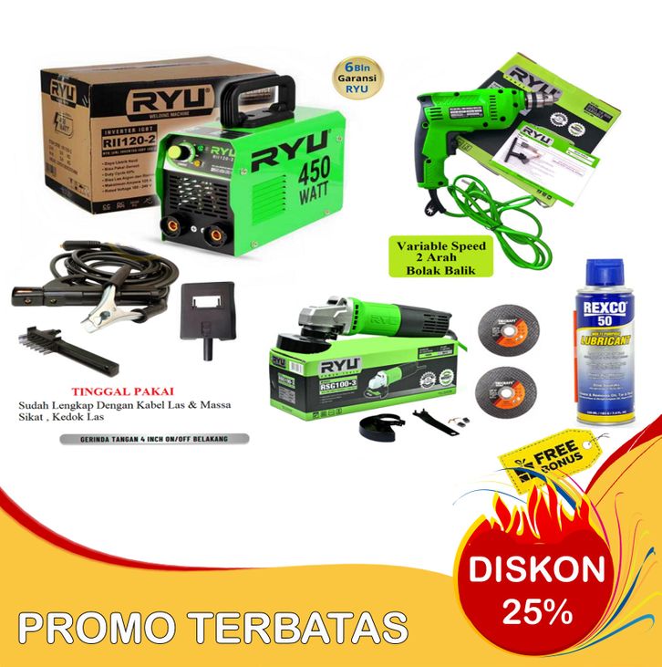 PAKET Hemat 3 ITEM Mesin Travo Las Listrik RII 120-2 450 watt Mesin Las 450 Watt RYU 120a Trafo Travo Las + Mesin Gerind