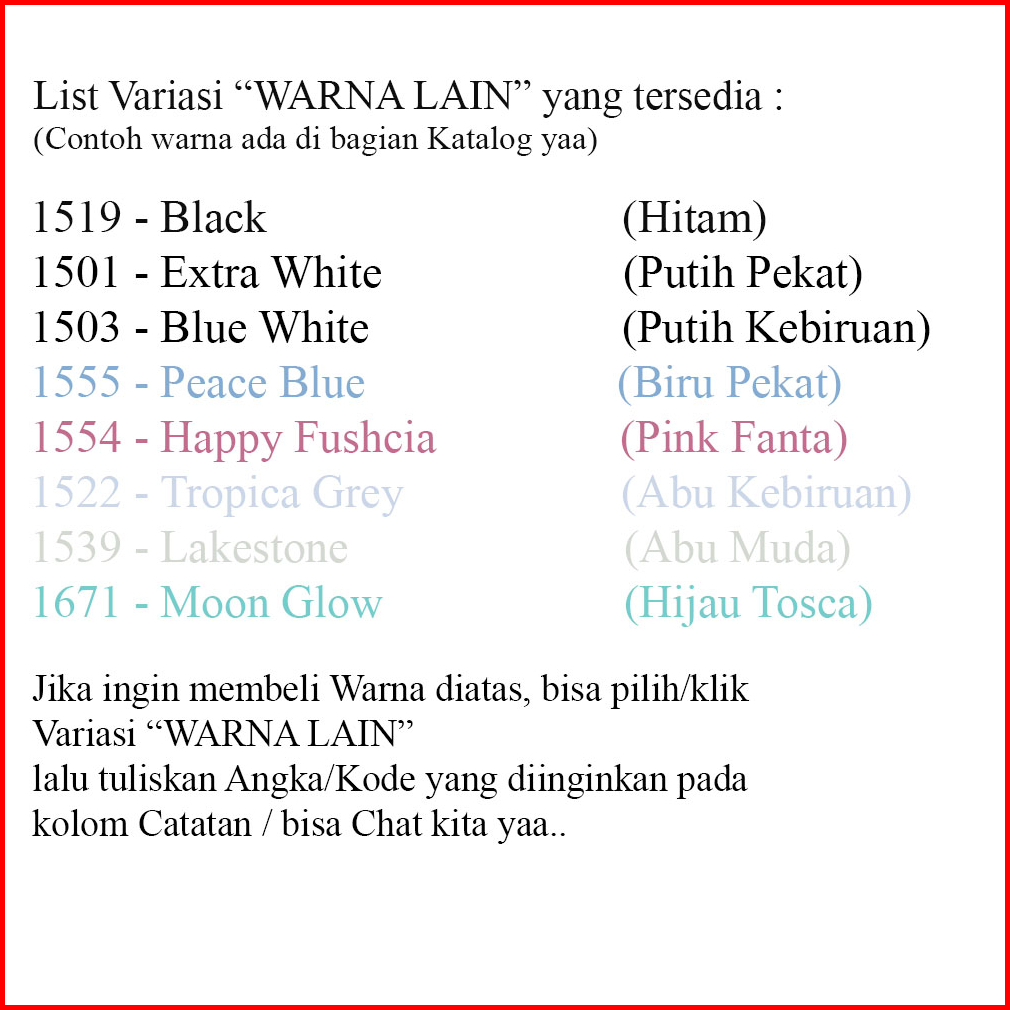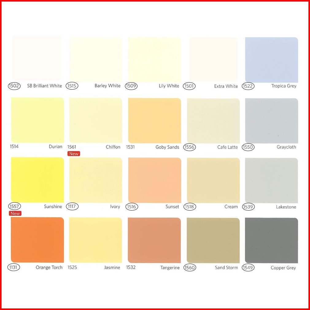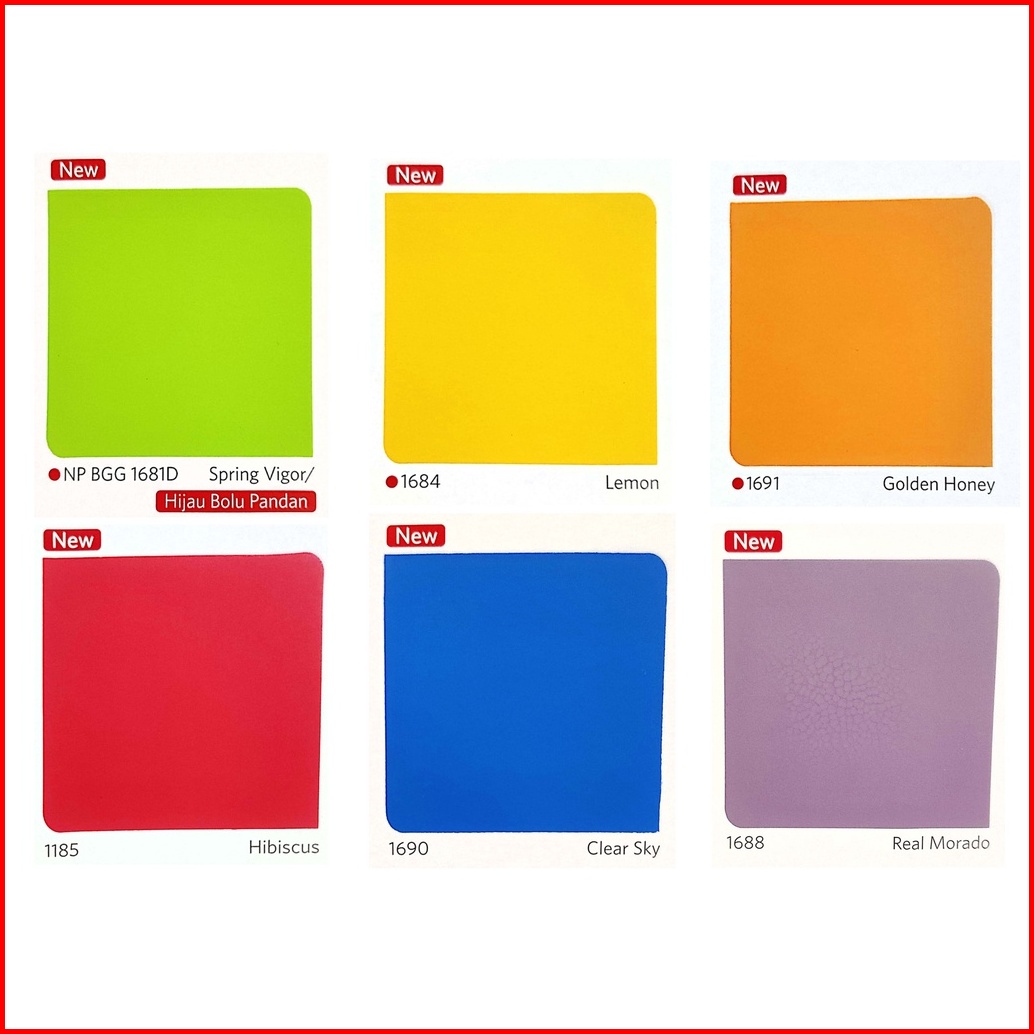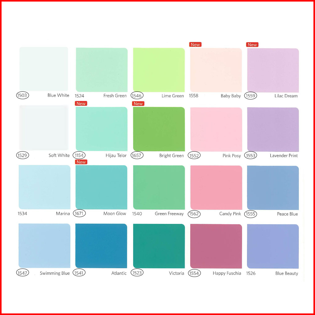 1505 - PUTIH, 1502 - BRILIANTWHITE, 1515 - BARLEY WHITE, 1509 - LILY WHITE, 1154 - HIJAU TELOR, 1546 - LIME GREEN, 1523 - VICTORIA, 1547 - SWIMMING BLUE, 1541 - ATLANTIC, 1671 - MOON GLOW, 1553 - LAVENDERPRINT, 1552 - PINK POSY, 1562 - CANDY PINK, 1557 - SUNSHINE, 1117 - IVORY, 1518 - CREAM, 1556 - CAFE LATTE, 1560 - SAND STORM, PAKET ALAT CAT, 1131 - ORANGE TORCH, 1550 - GRAYCLOTH, 1549 - COPPER GREY, 1503 - BLUE WHITE, 1657 - BRIGHT GREEN, WARNA LAIN & BARU