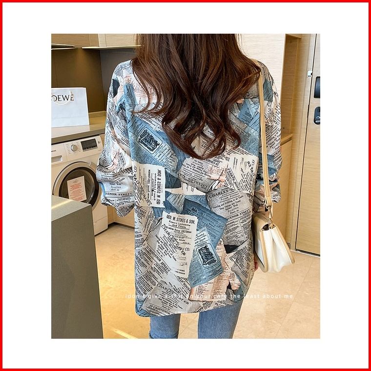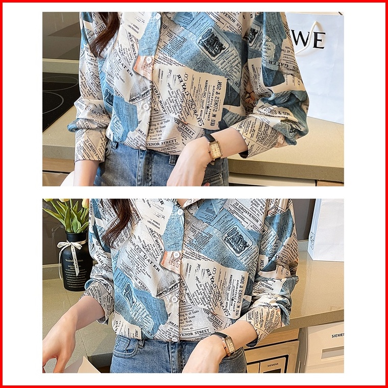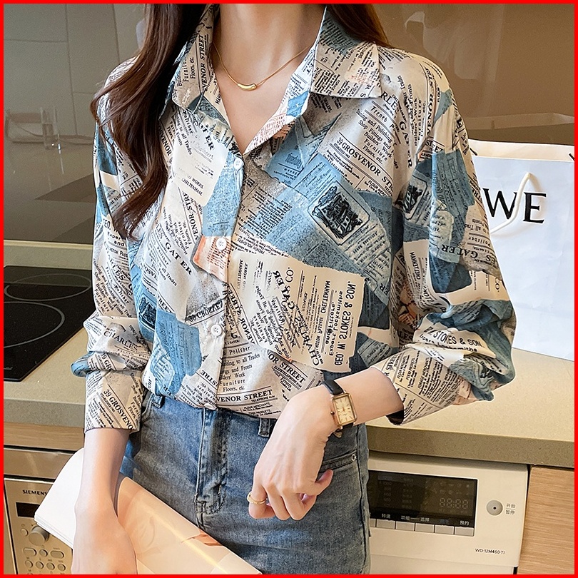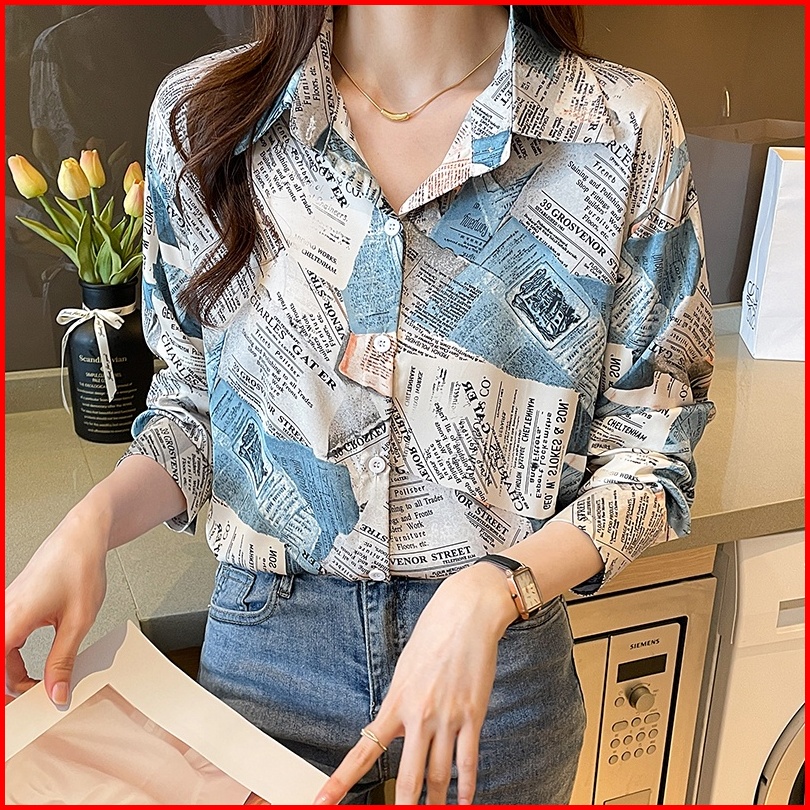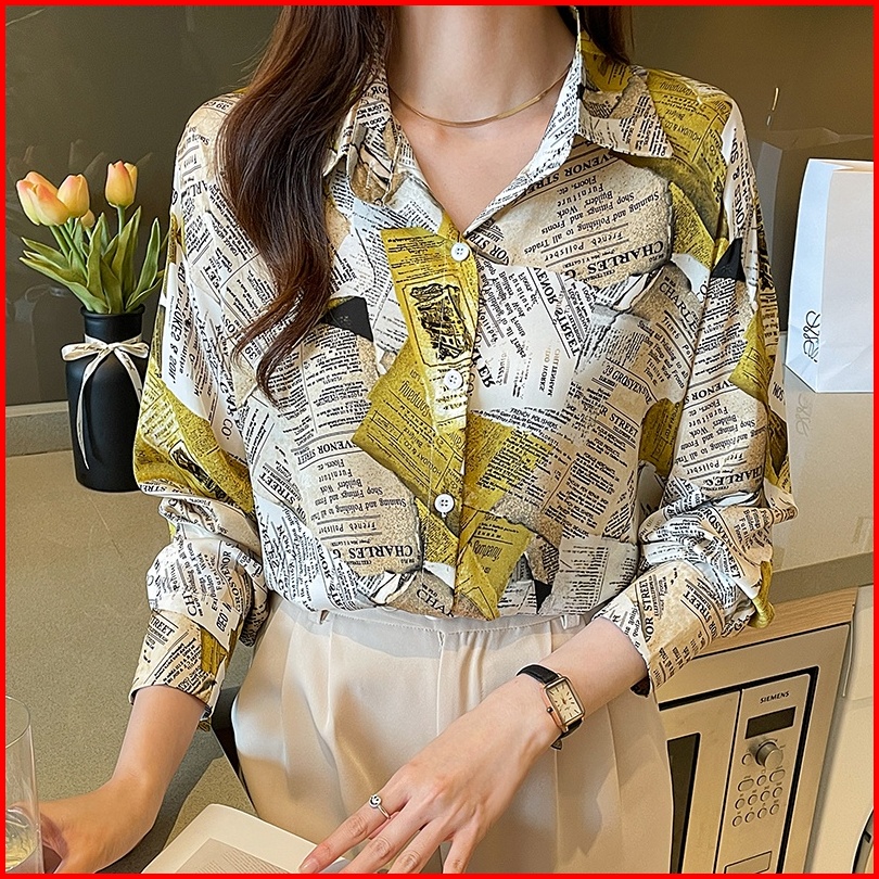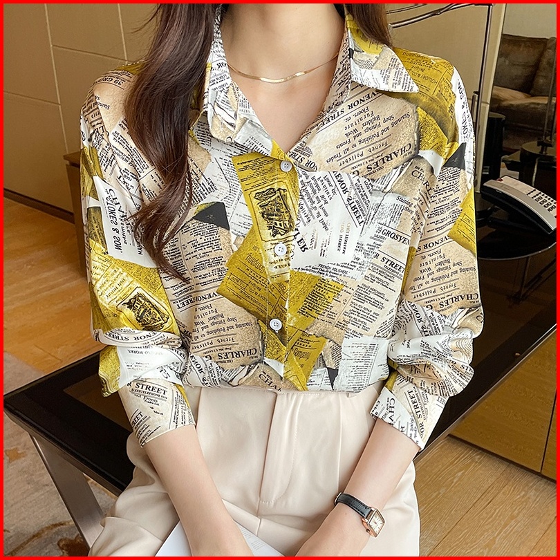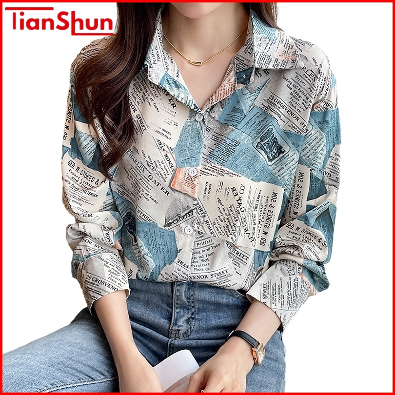 Tianshun Boutique Top Female Shirt Casual Newspaper Print Yellow Blue Chiffon Shirt Work Long Sleeve