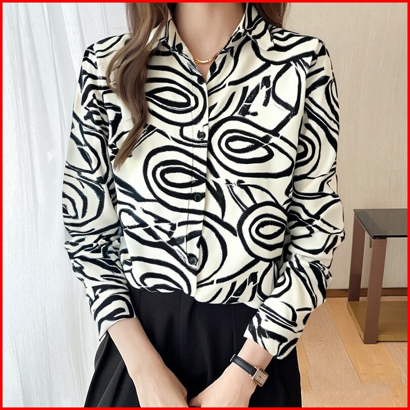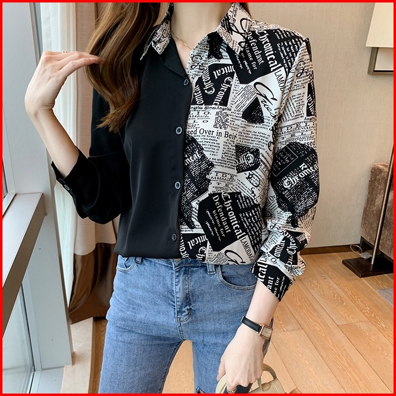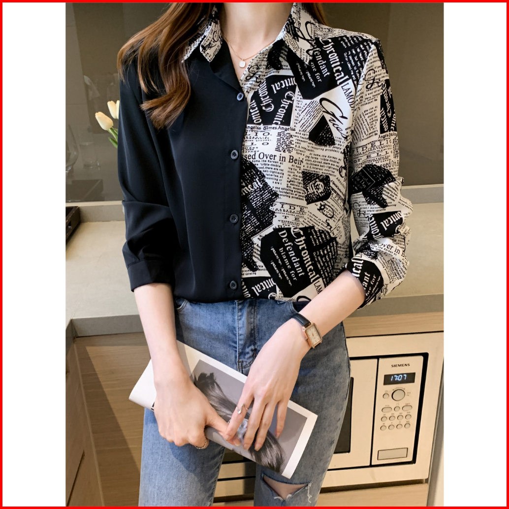 Tianshun Fashion Black Newspaper Print Spliced Shirt Women S Summer Ol Casual Korean Version Shirt