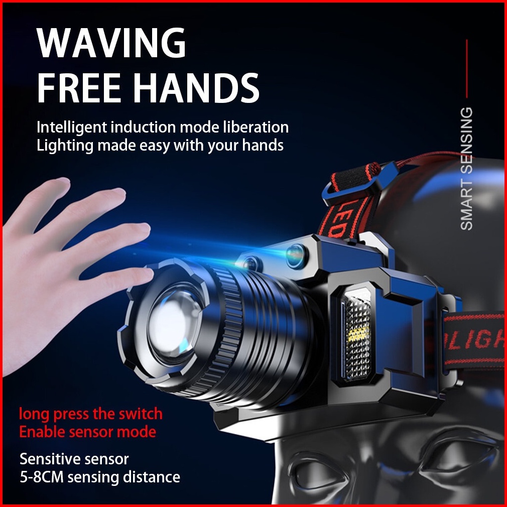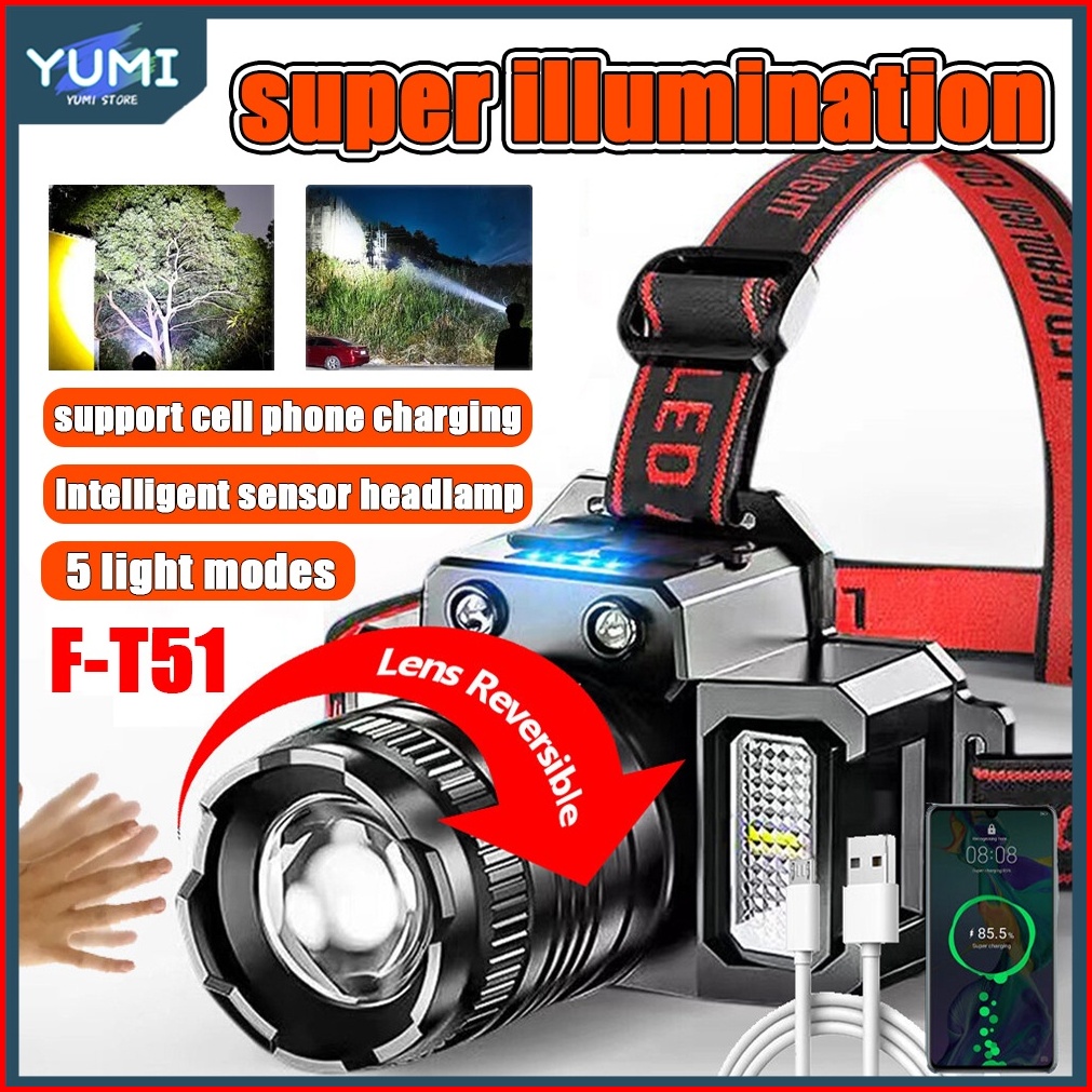 Lampu Kepala Led Headlamp F-t51 Super Terang 5000 Lumen Usb Charging Senter Dengan Sensor Tangan Sorot Dengan 6 Mode Cah