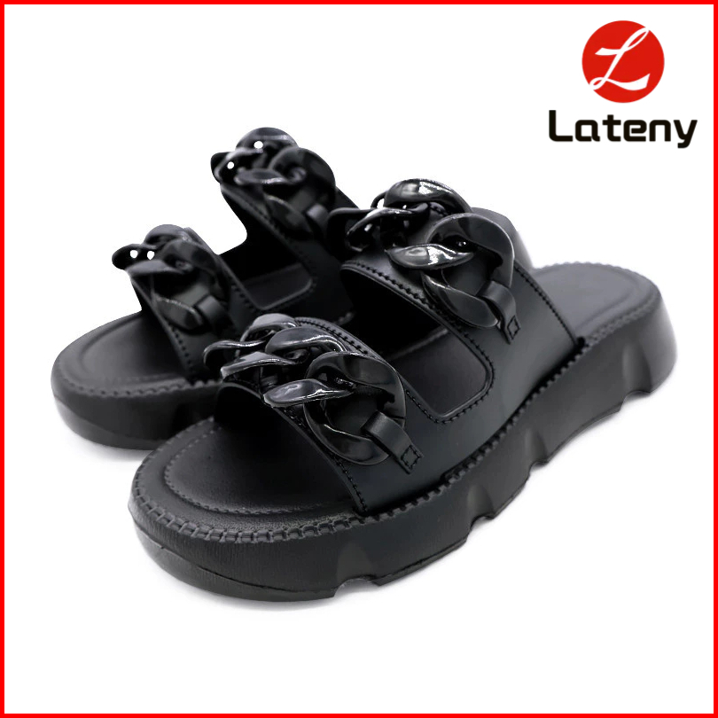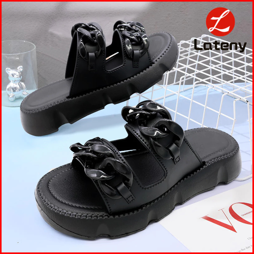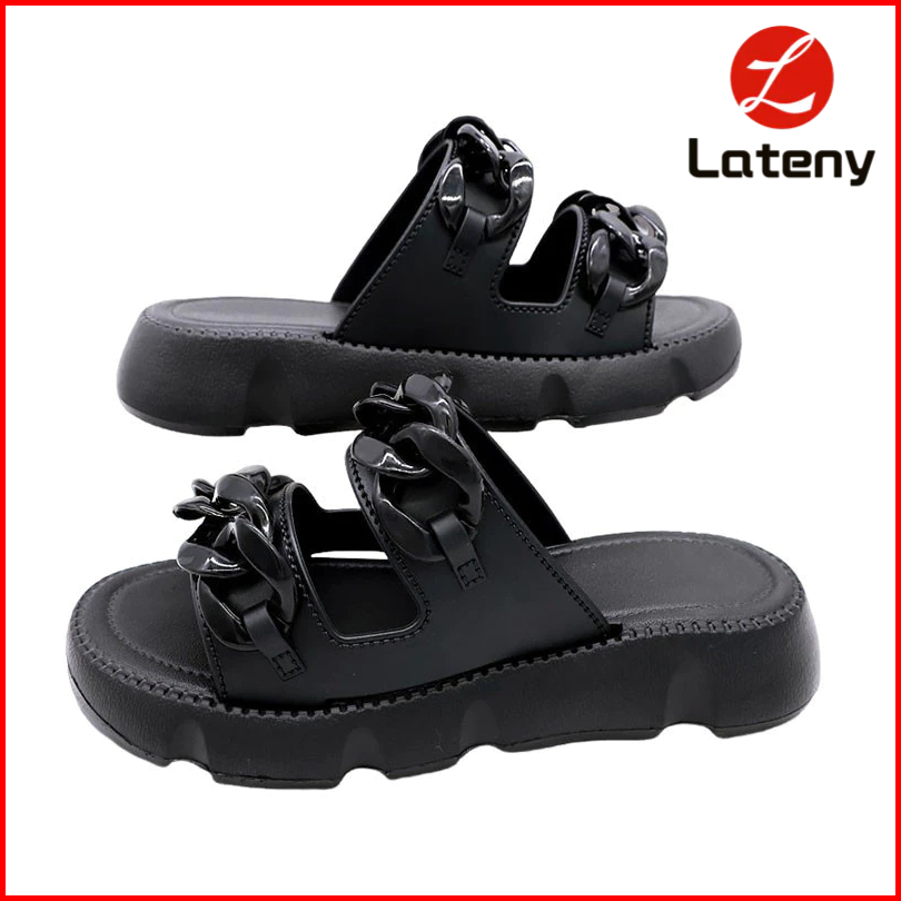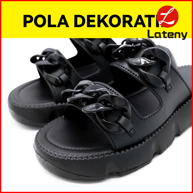 Lateny Sandal Wanita Wedges Karet Jelly Sol Tebal Tali Rantai Hitam