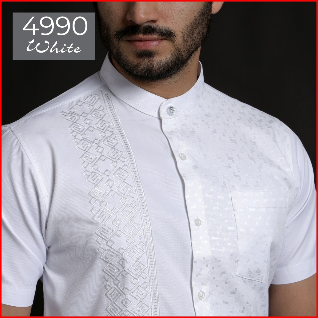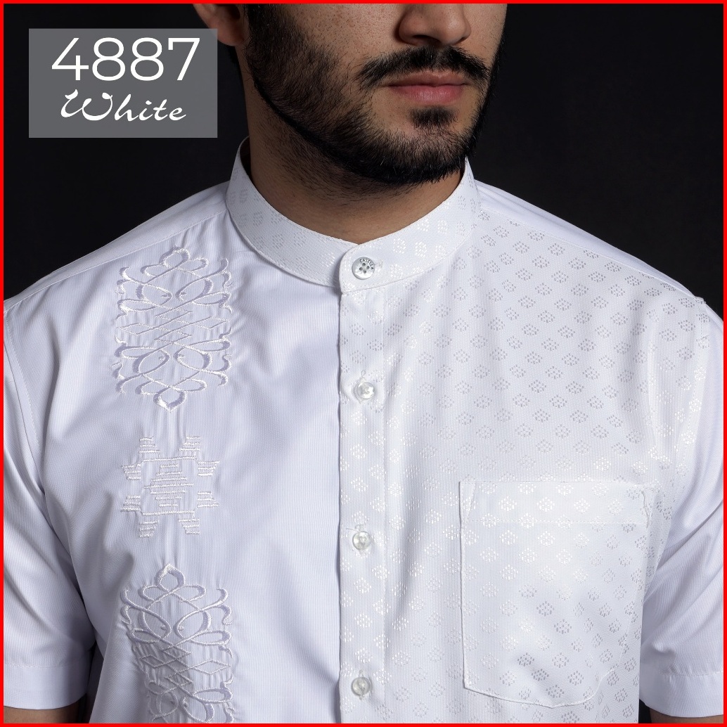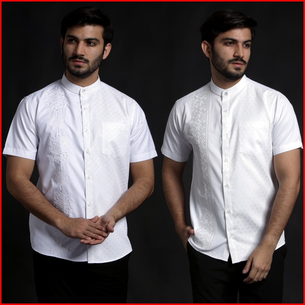 Casella Baju Koko Pria Lengan Pendek Arabesque Embroidery White Design Baju Koko Putih Lengan Pendek