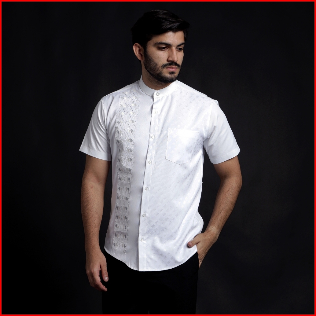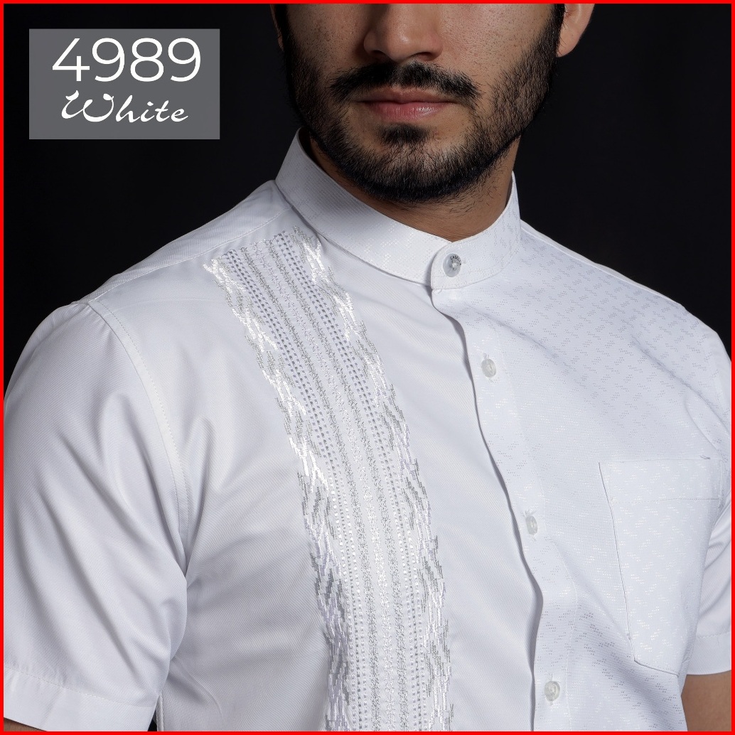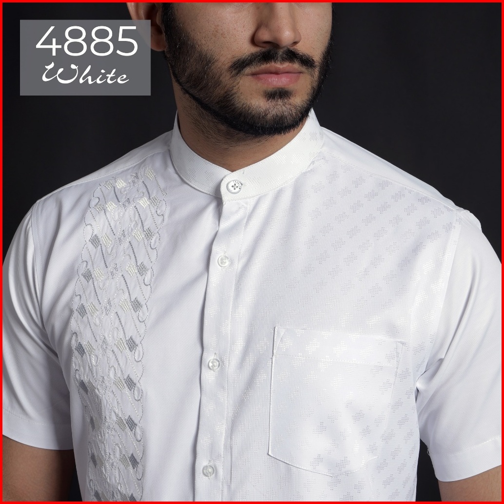 Casella Baju Koko Pria Lengan Pendek Arabesque Embroidery White Design Baju Koko Putih Lengan Pendek