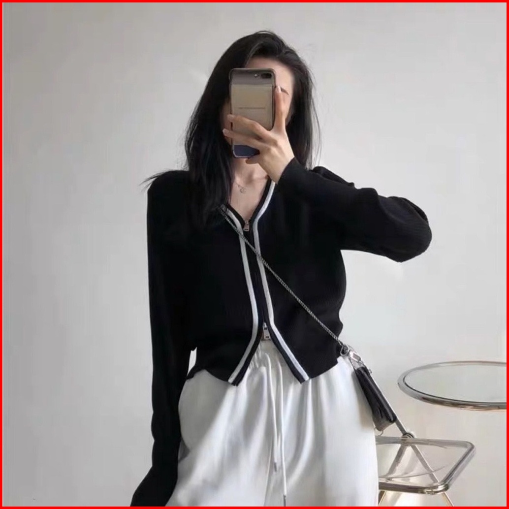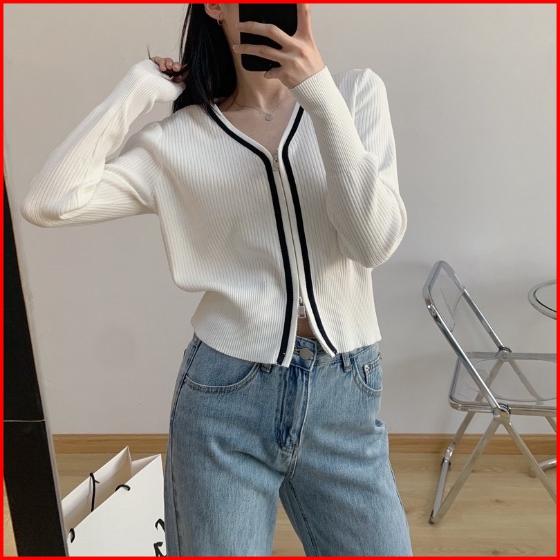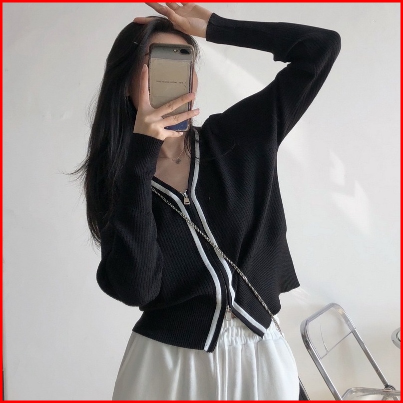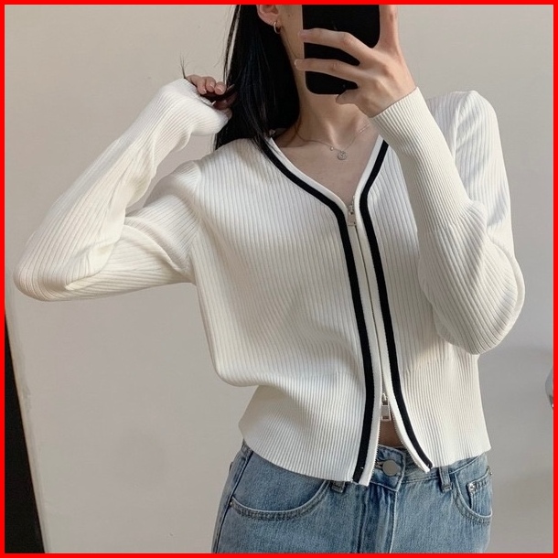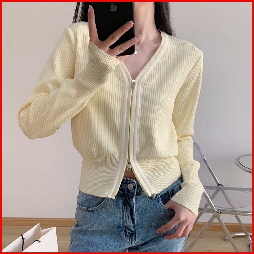 Asoka Natha Top 3114 - Korean V-neck Woman Shirt - Longsleeve Zipper Knit - Atasan Wanita Crop