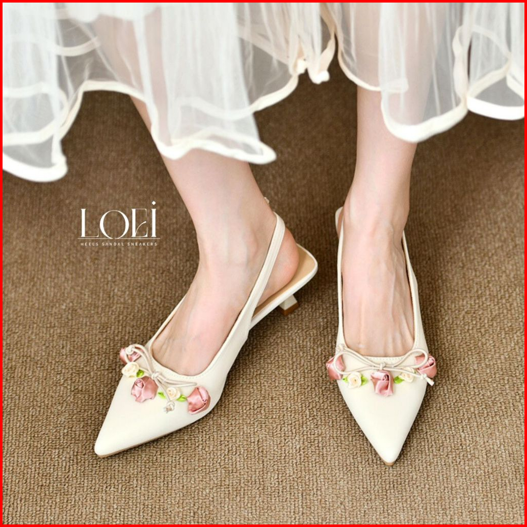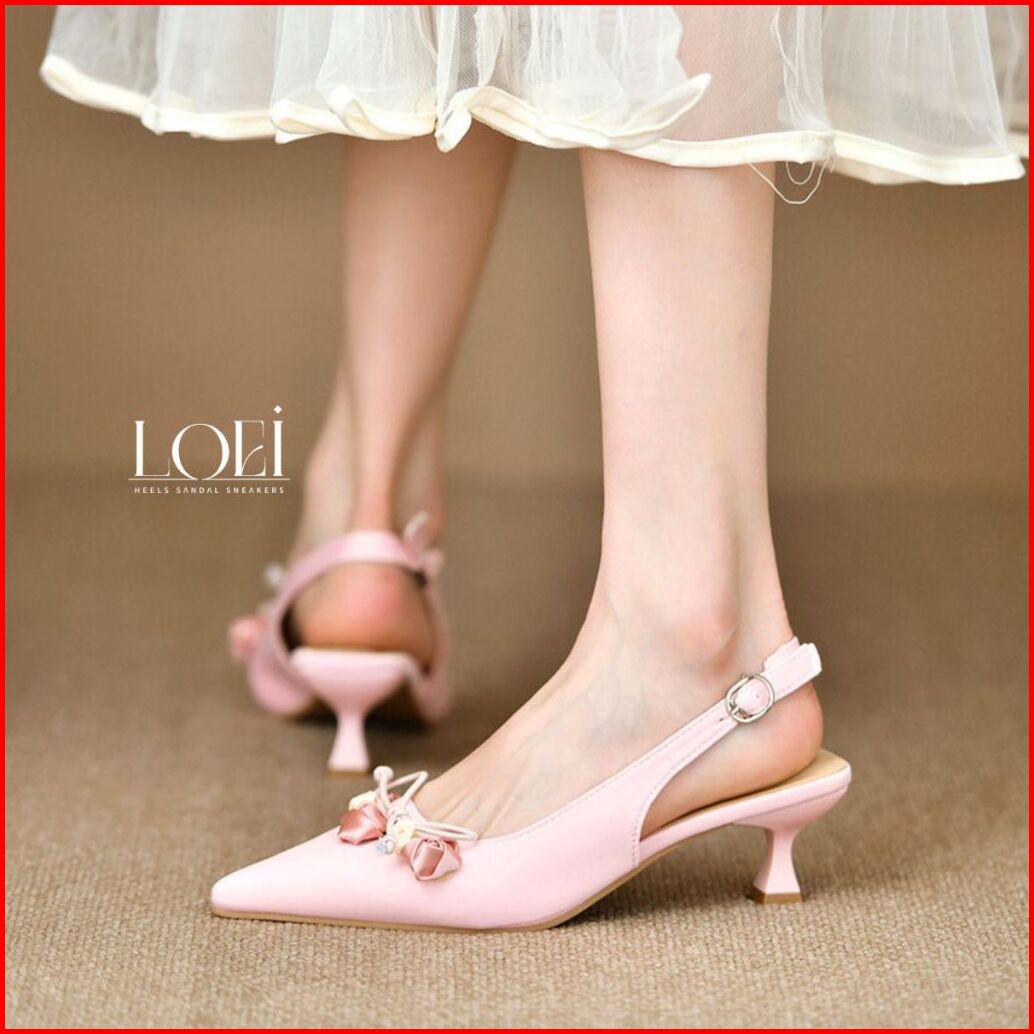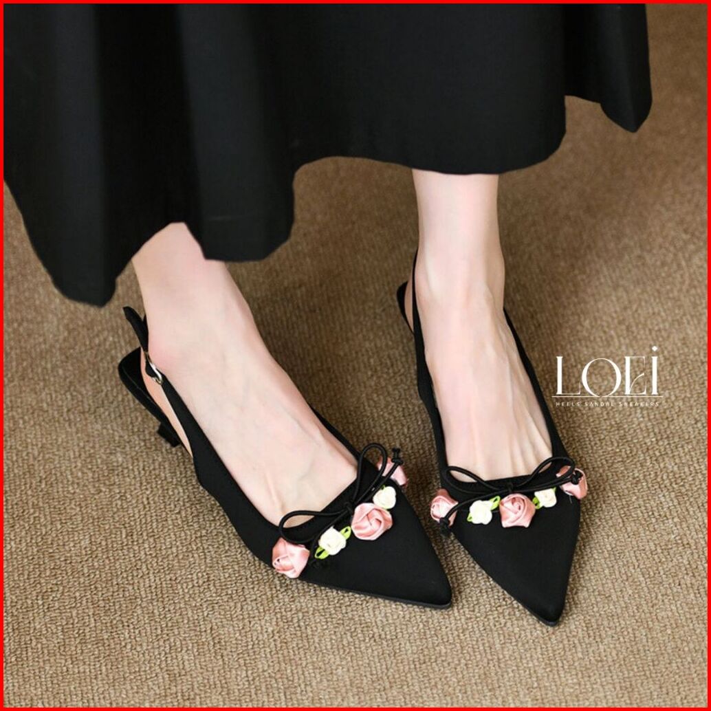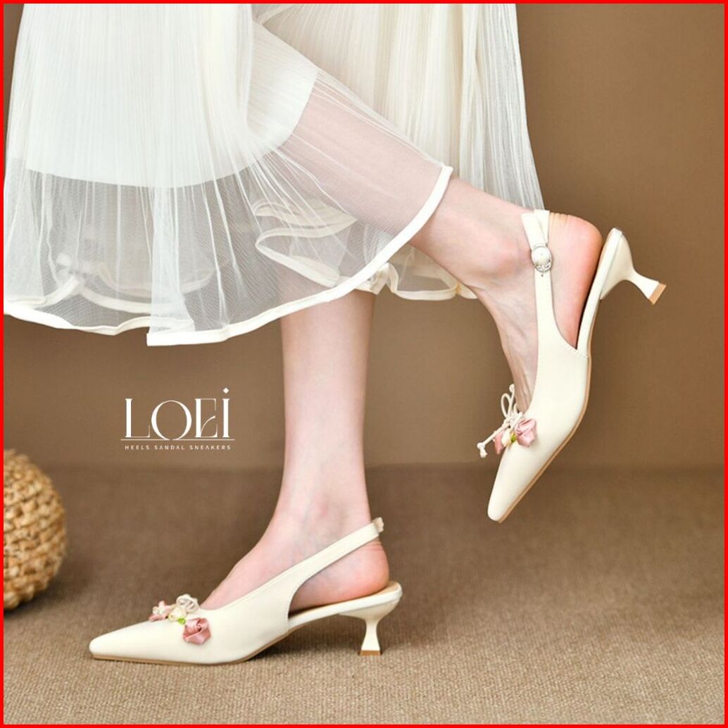 Loei Levina Heels Floral Vintage Wanita Sepatu Hak Slingback Elegant Motif Bunga Pita 1006