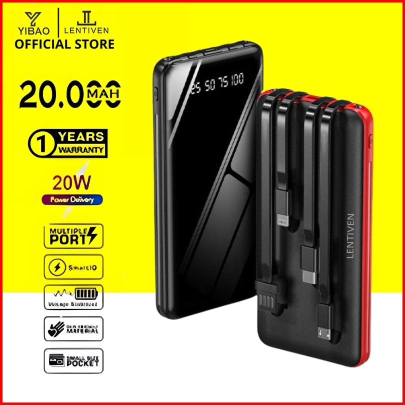 Yibao Lentiven Powerbank 20000mah 4cables Fast Charging Mini Dual Usb Digital Display