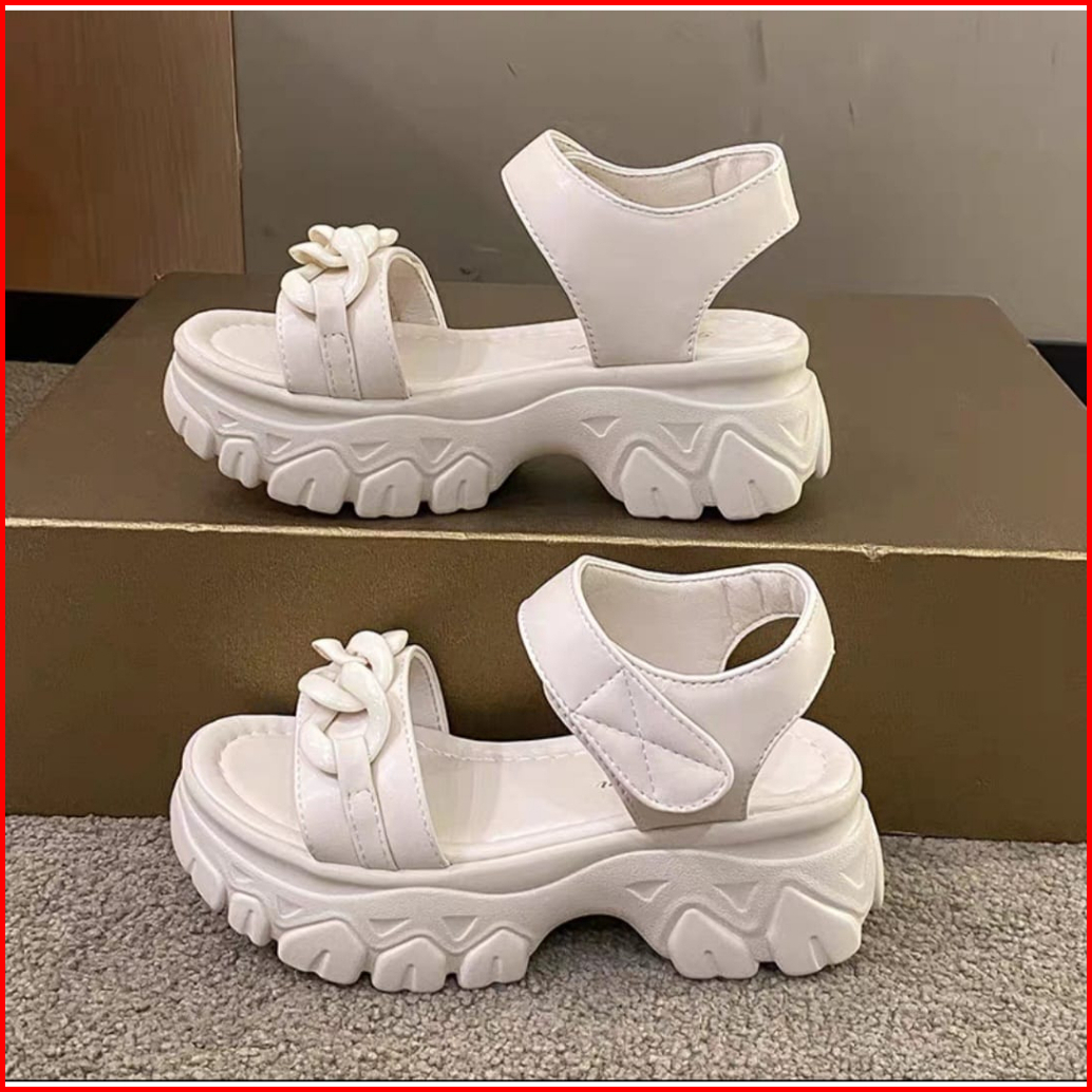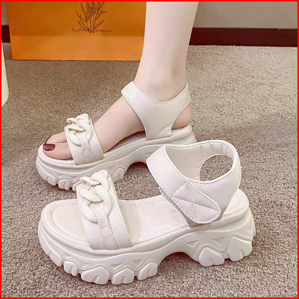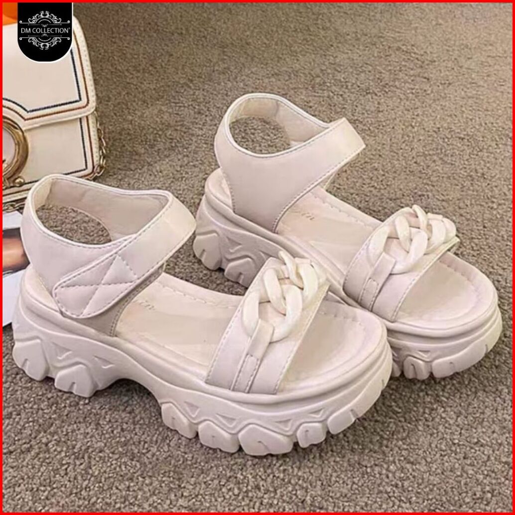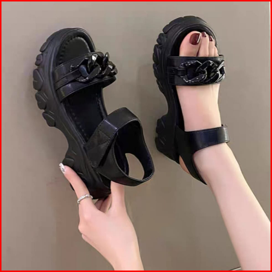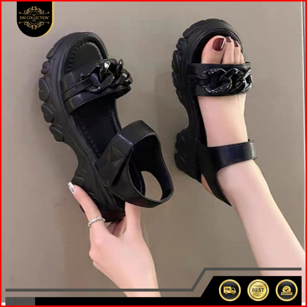 Dm-shop Sandal Wedges Wanita Hak Tebal Slip On Kombinasi Rantai Hitam Tali Velcro Best Quality Ap 021