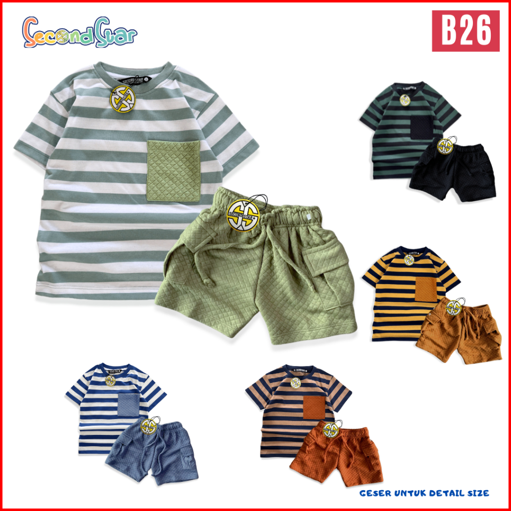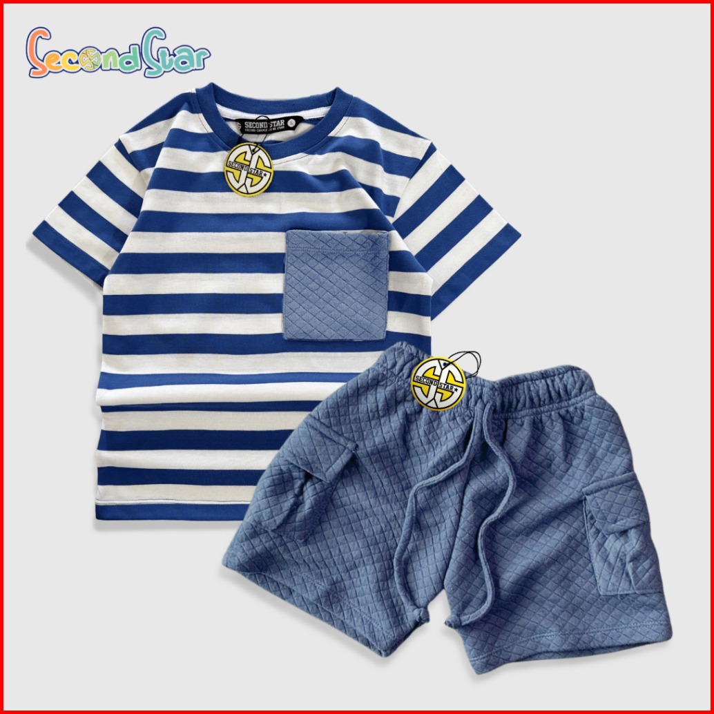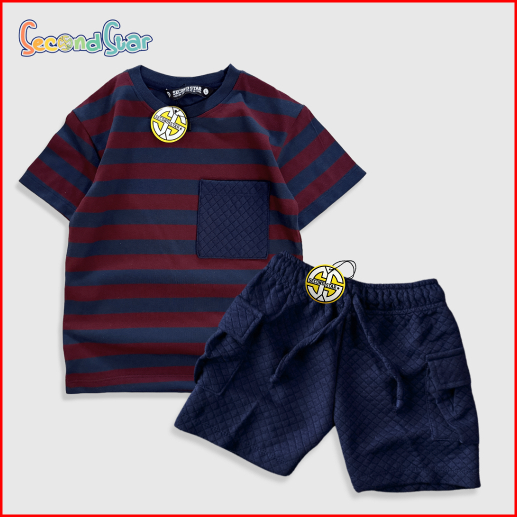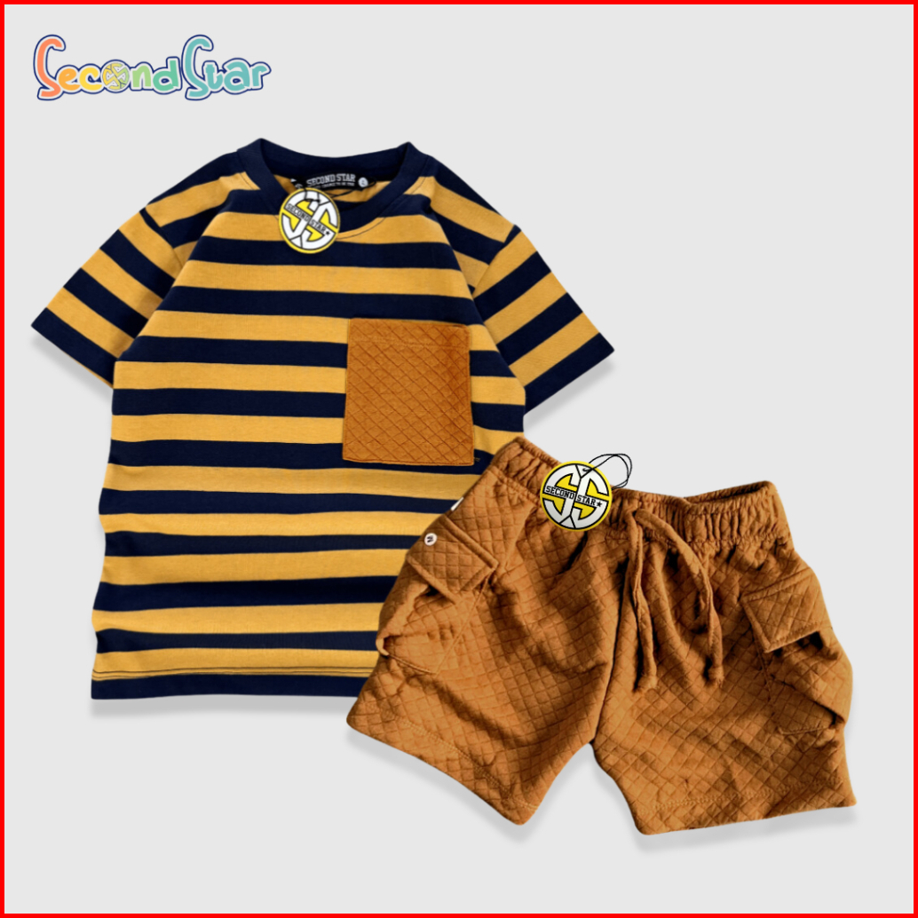 Secondstar Setelan Anak Laki-laki Dan Perempuan Kaos Salur Bahan Katun Cvc Dan Celana Cargo Bahan Diamond Knit-ssb26
