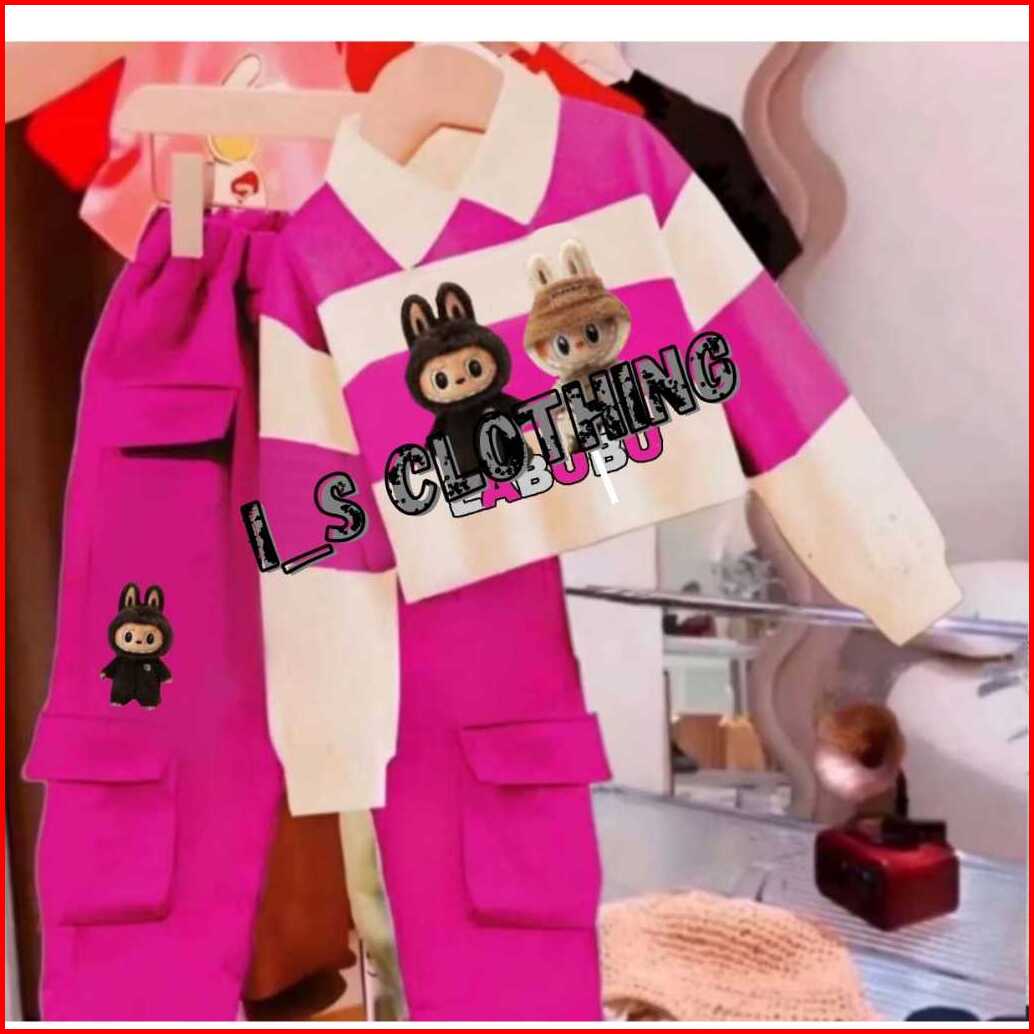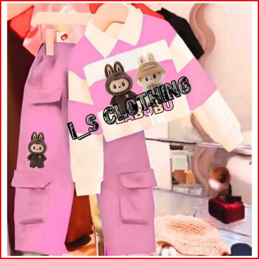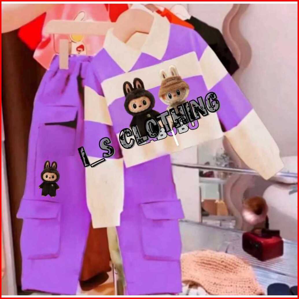 Set Labubu Kerah Anak Perempuan Setelan Sweater Croptop Strip Kargo Fashion Baju Dan Celana Panjang
