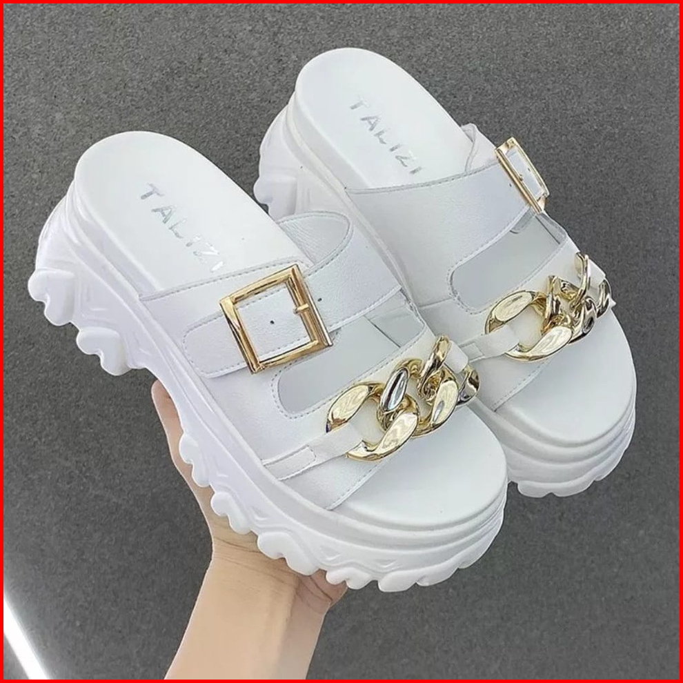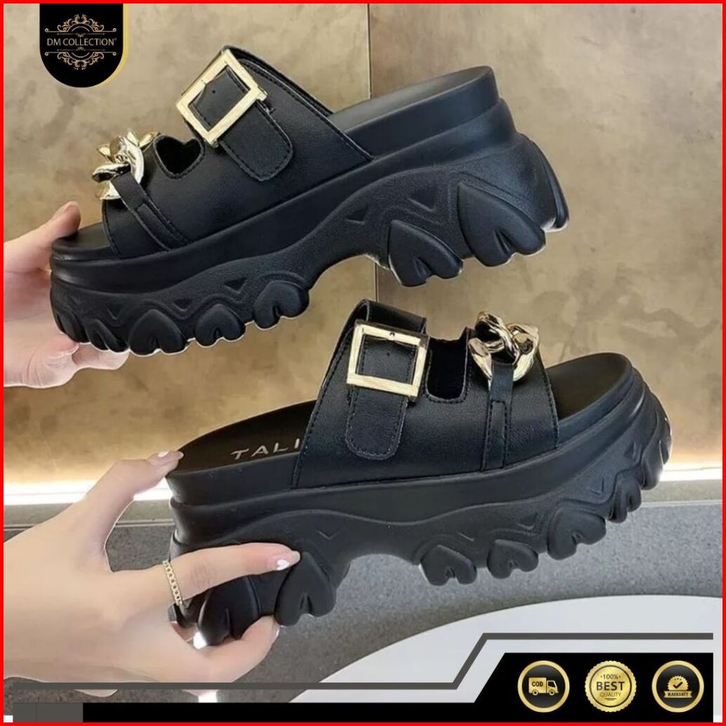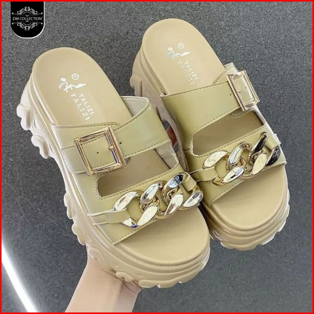 Dm-shopp Sandal Wedges Wanita Hak Tebal Platfrom Variasi Gesper Kombinasi Rantai Casual Slip On Wedges Wanita Hak Tebal